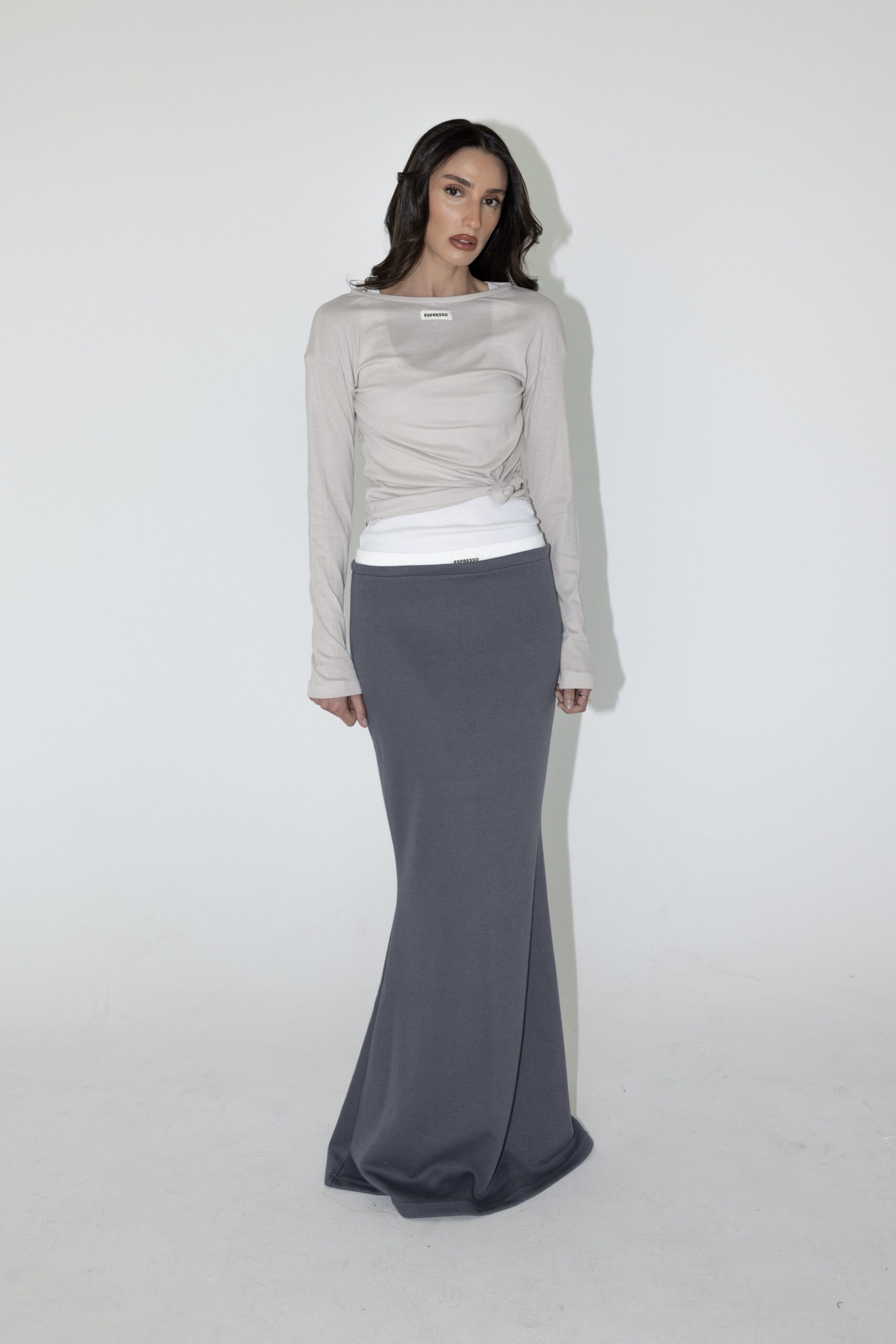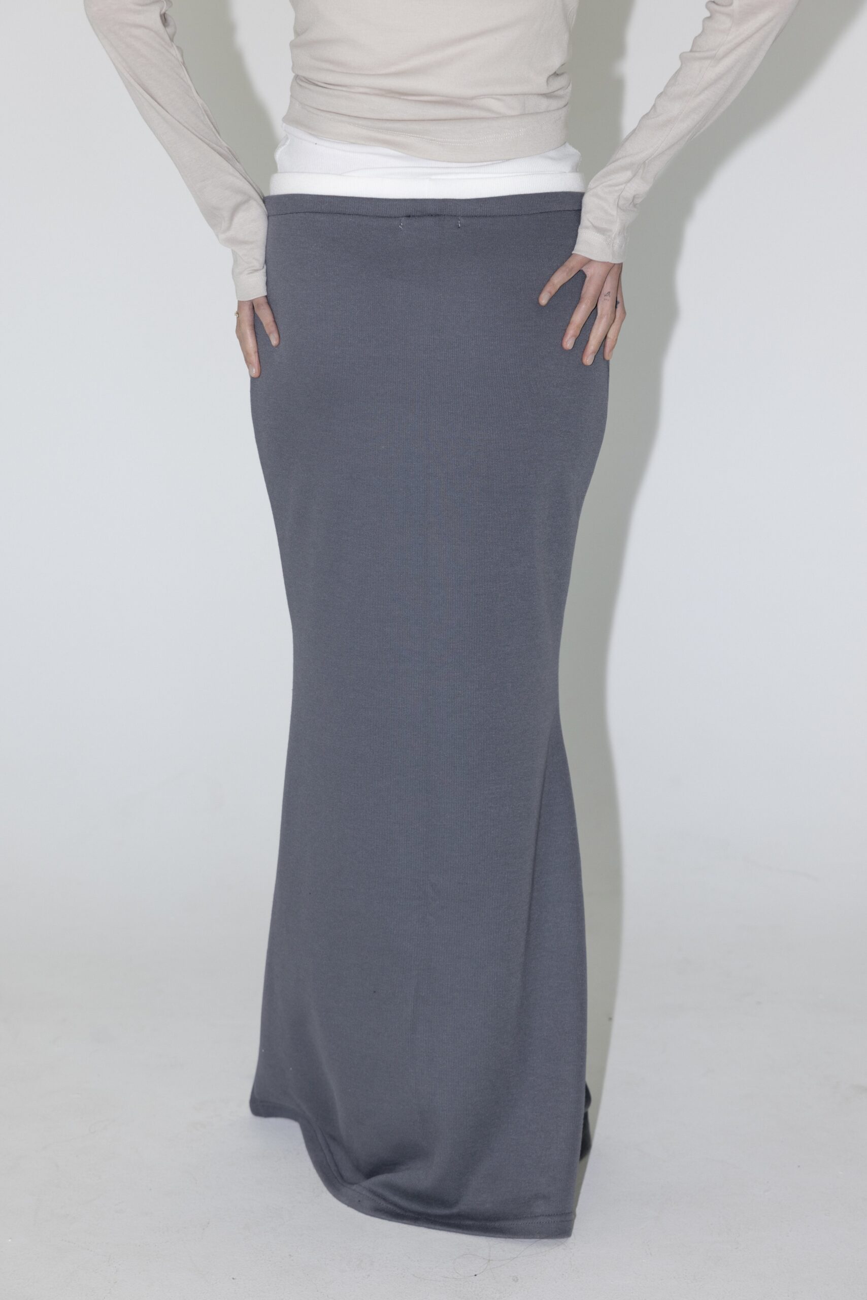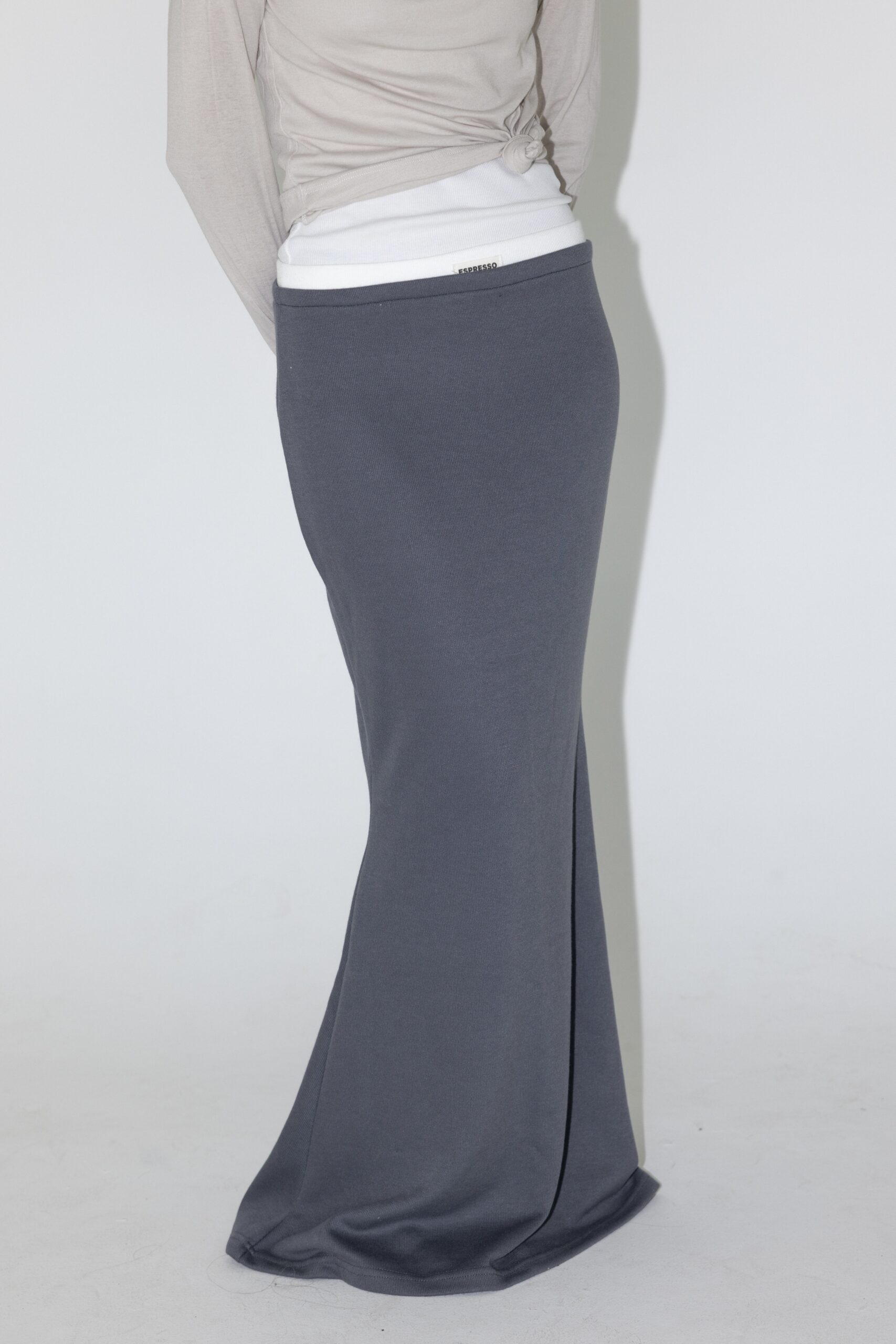 חצאית מקסי בגזרה צמודה המתרחבת למטה מבד סריג דק עם תוספת בד לבן למעלה.
