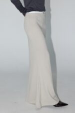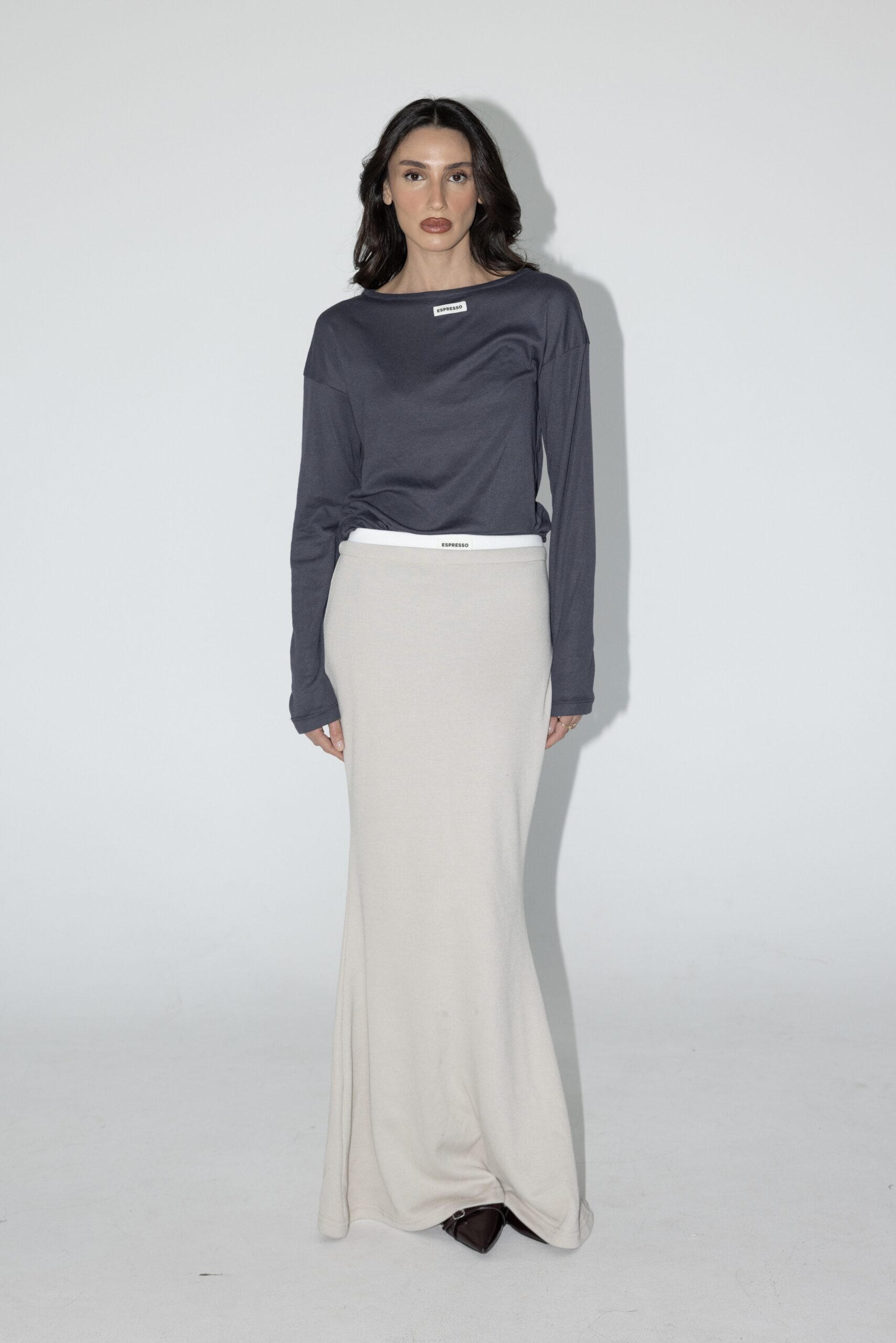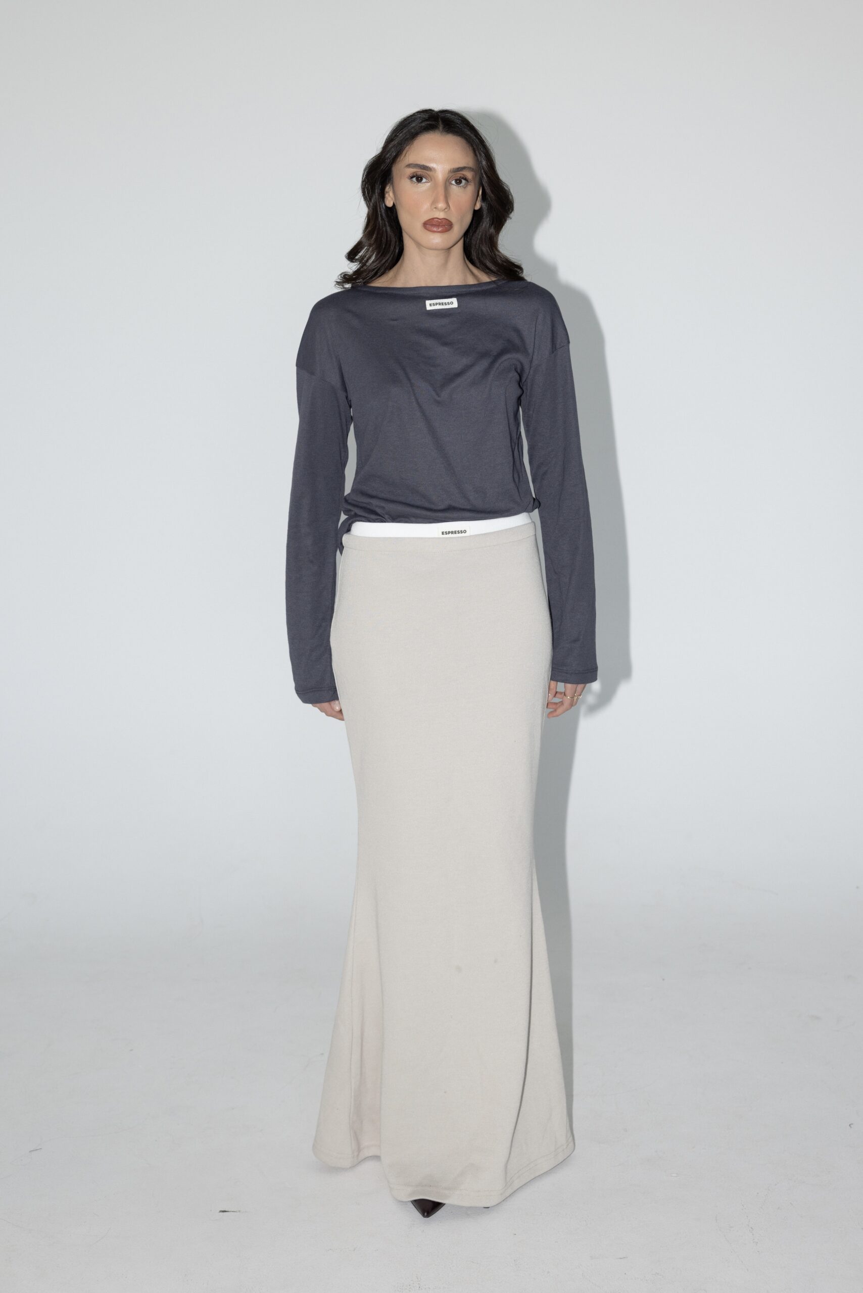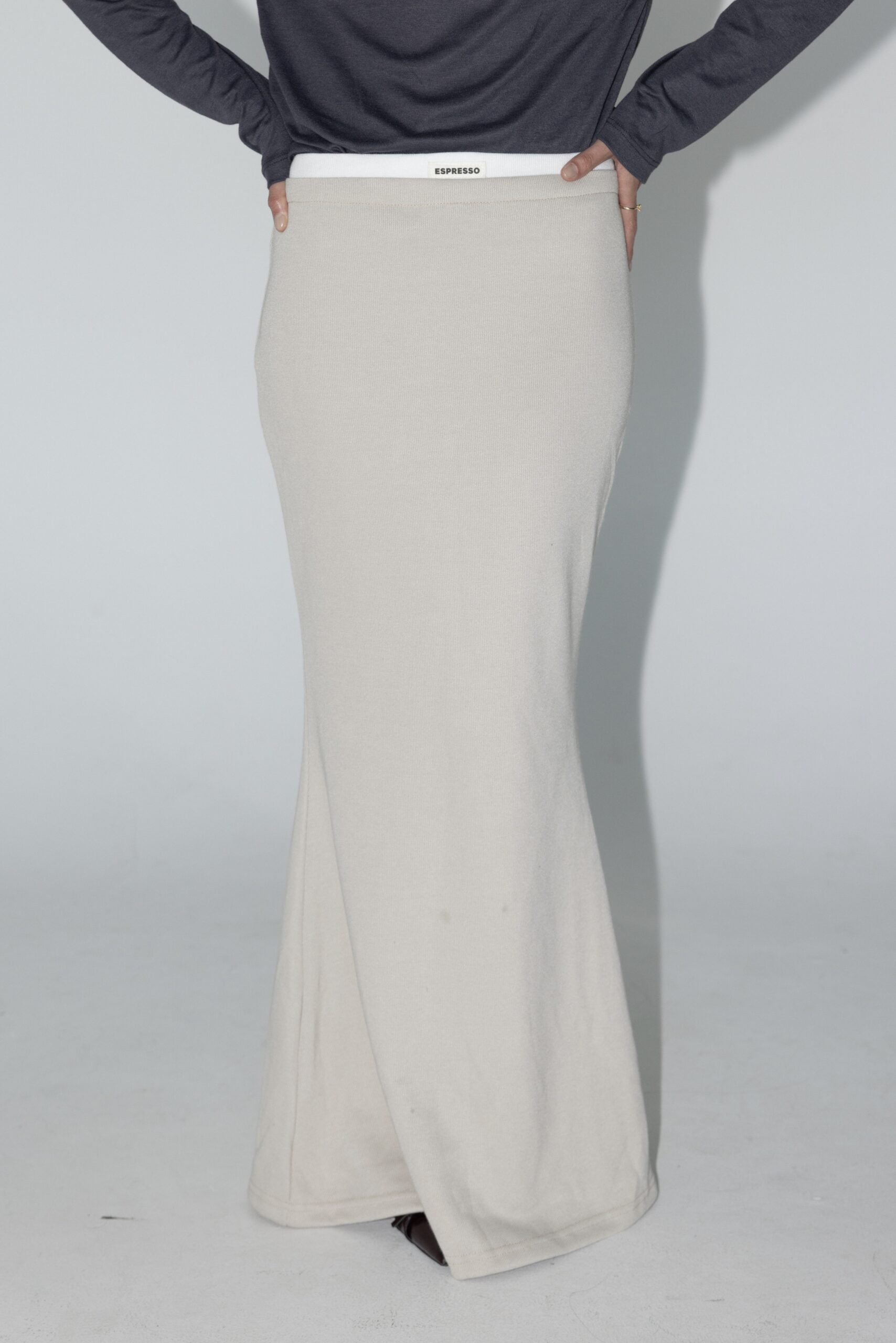 חצאית מקסי בגזרה צמודה המתרחבת למטה מבד סריג דק עם תוספת בד לבן למעלה.