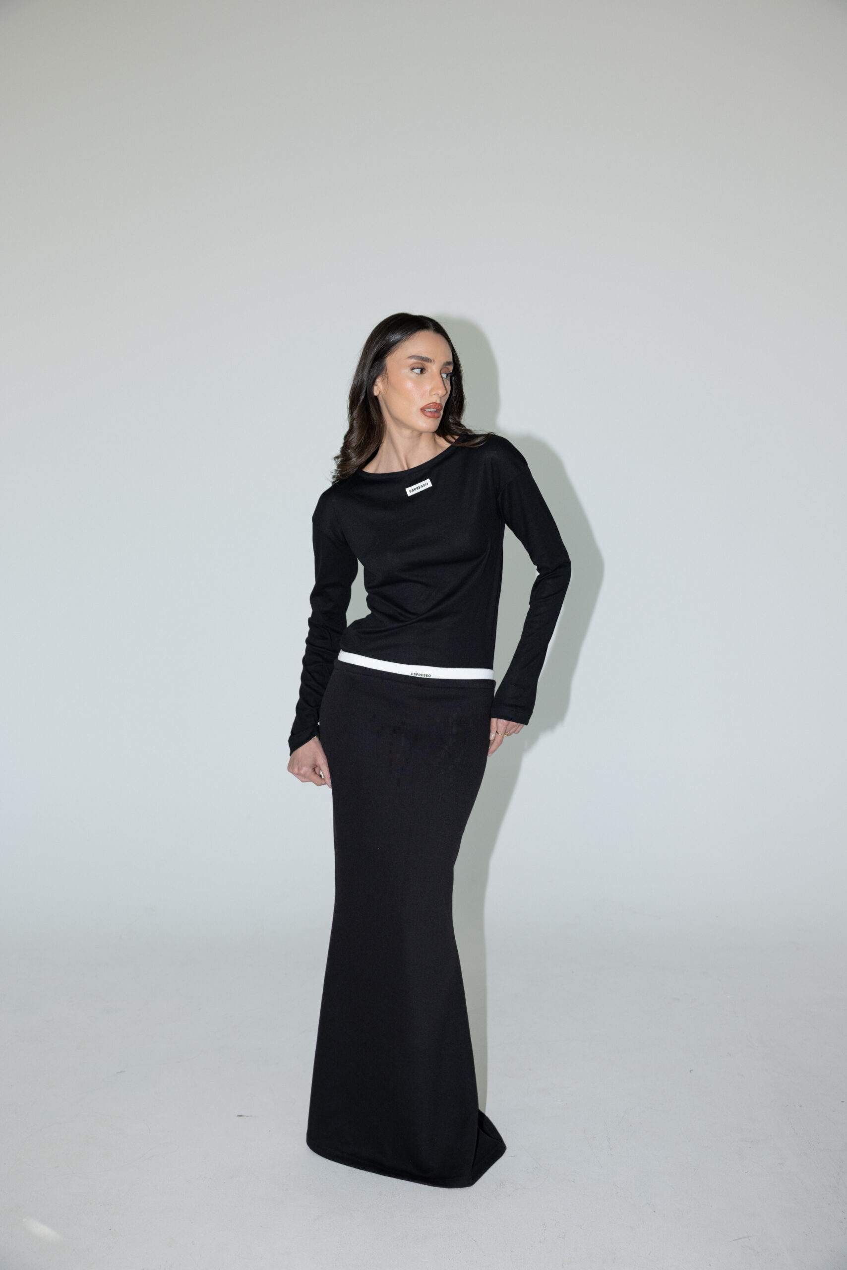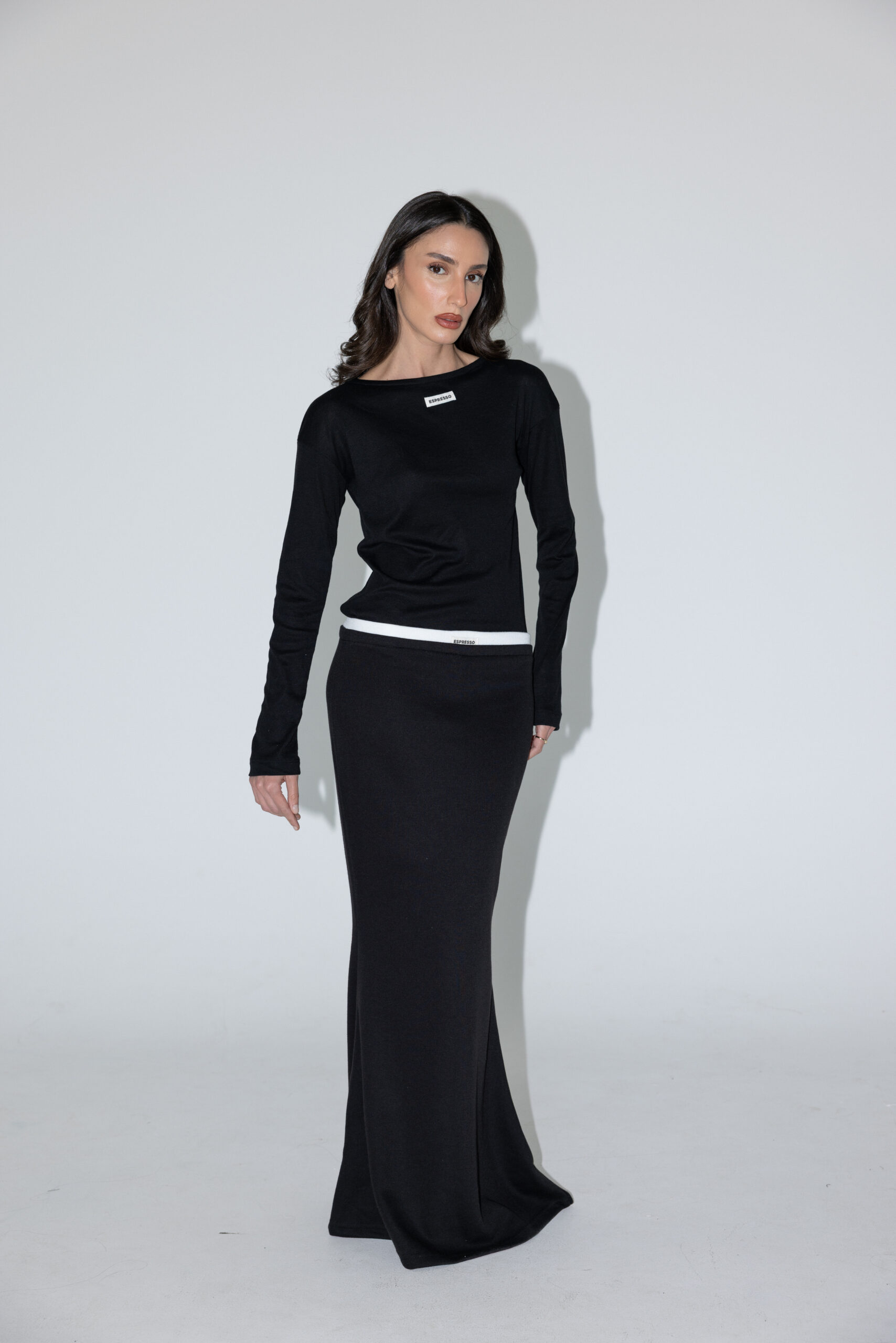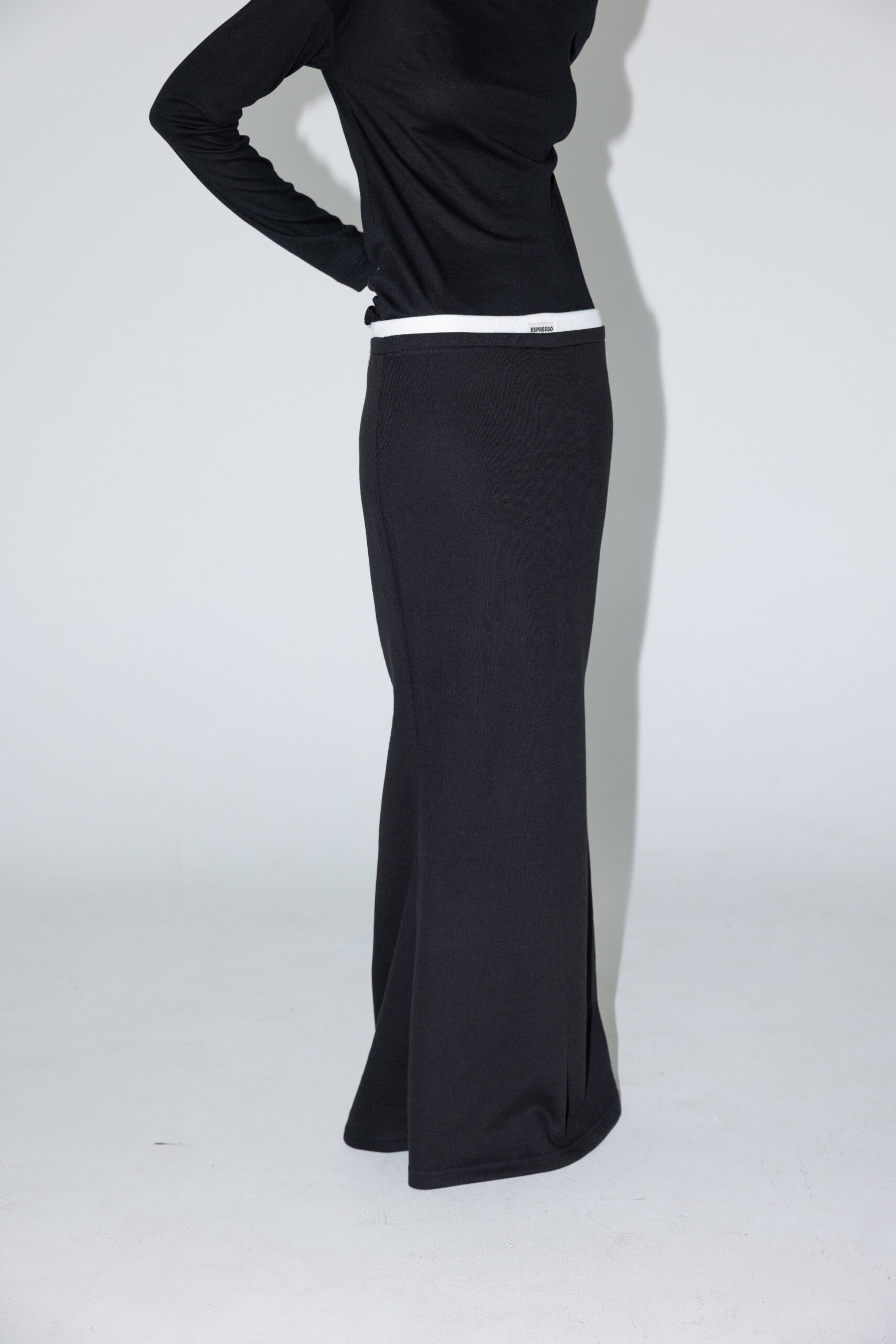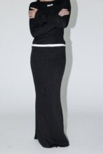 חצאית מקסי בגזרה צמודה המתרחבת למטה מבד סריג דק עם תוספת בד לבן למעלה.