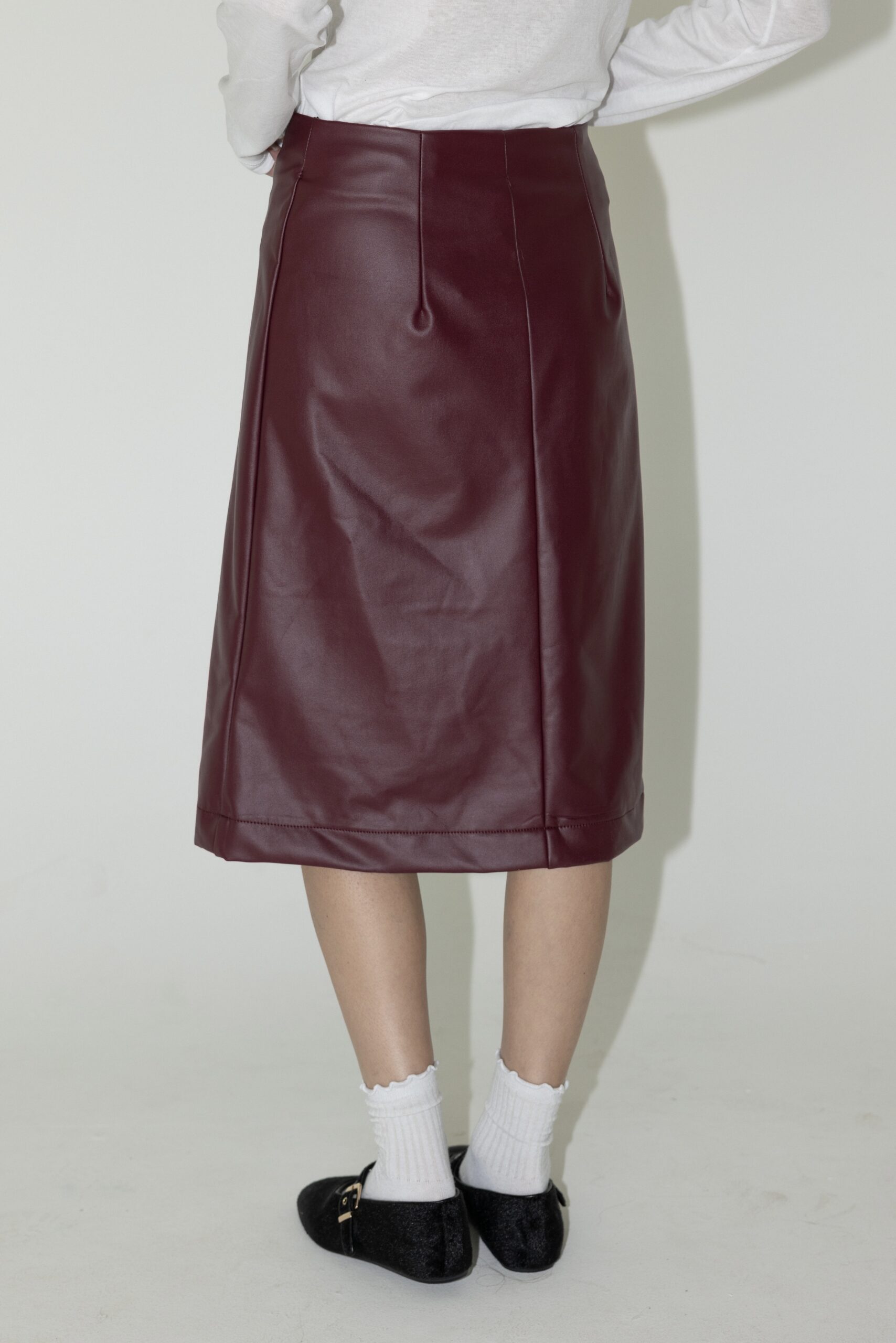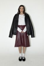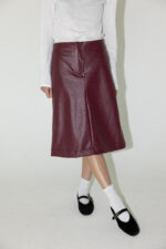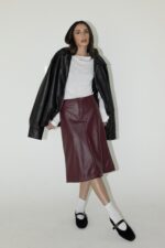 חצאית ברמודה בגזרת A עוברת ברך, מבד דמוי עור עם רוכסן קדמי.