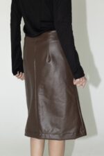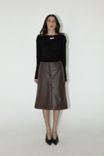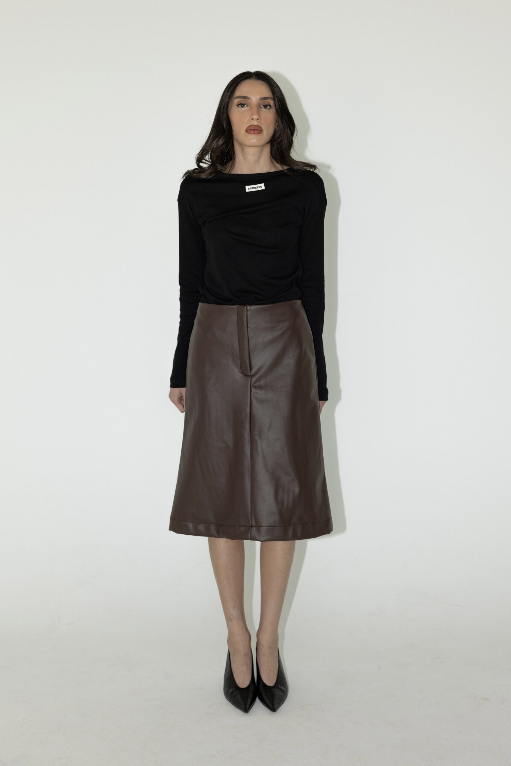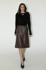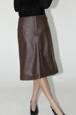 חצאית ברמודה בגזרת A עוברת ברך, מבד דמוי עור עם רוכסן קדמי.