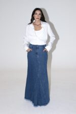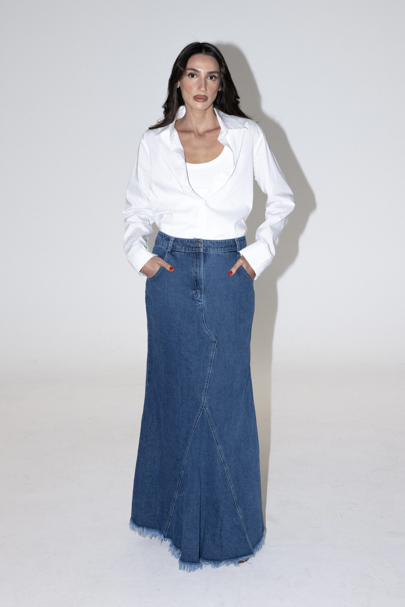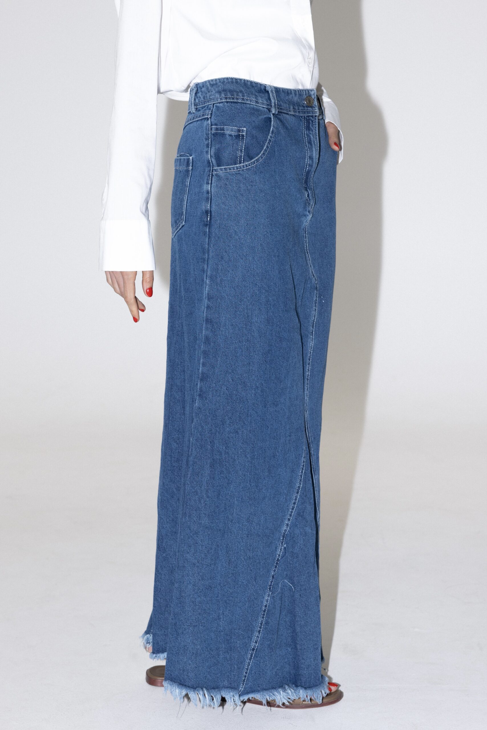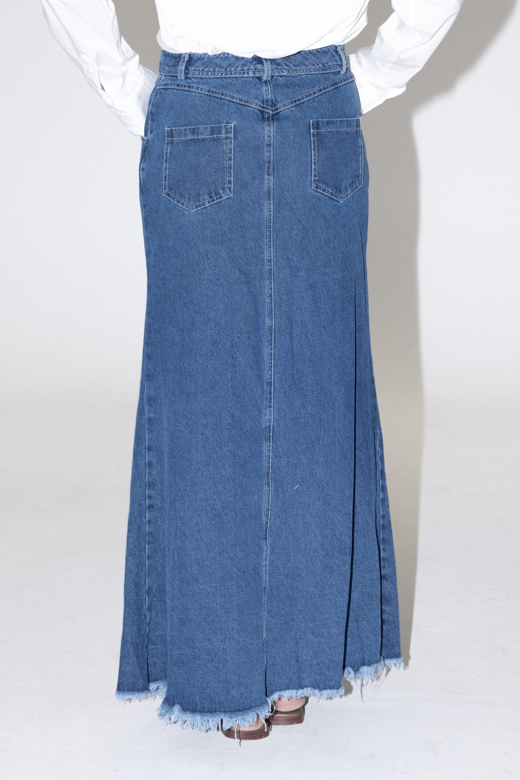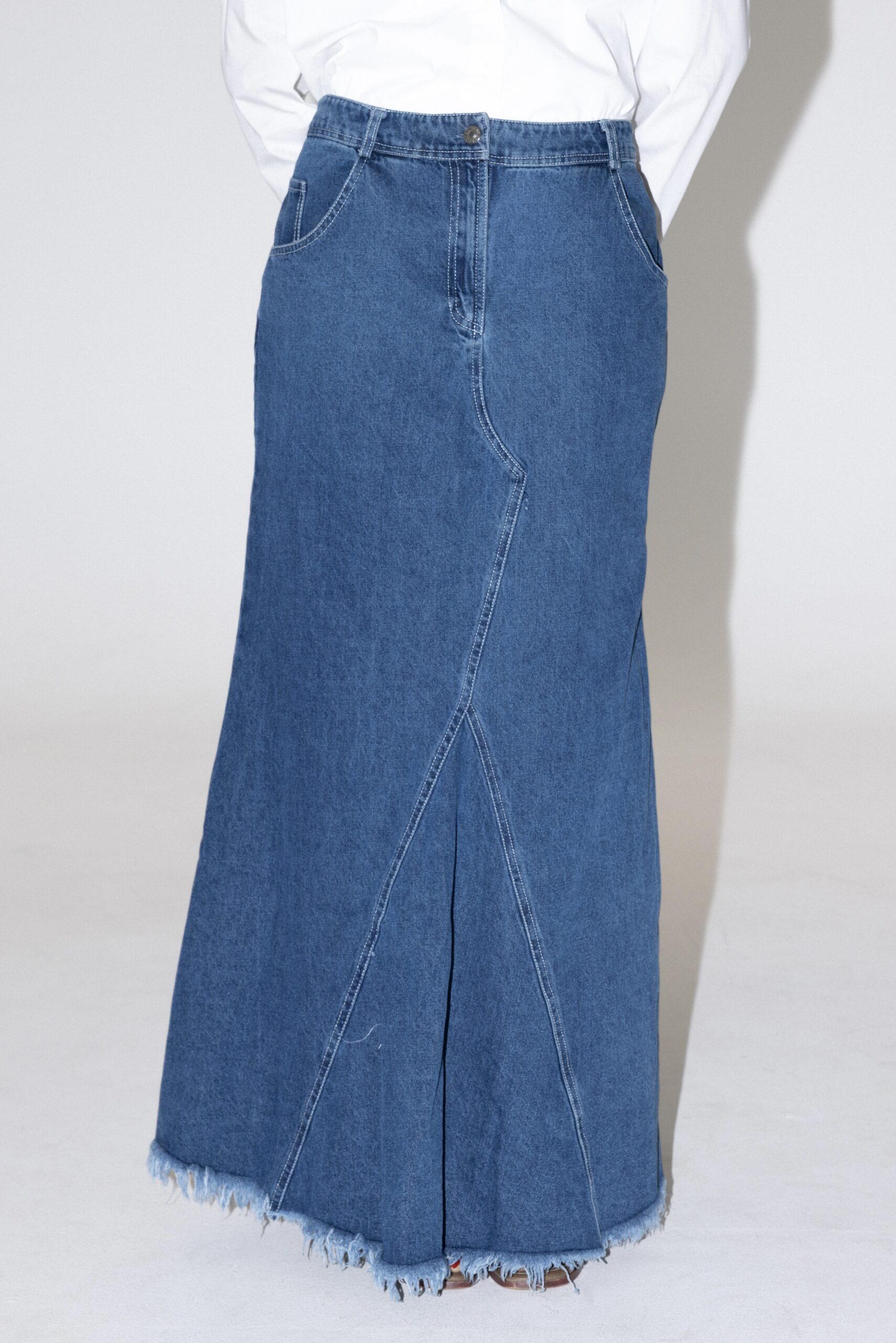 חצאית ג׳ינס ארוכה המתרחבת בסיומת עם כיסים קדמיים ואחוריים.