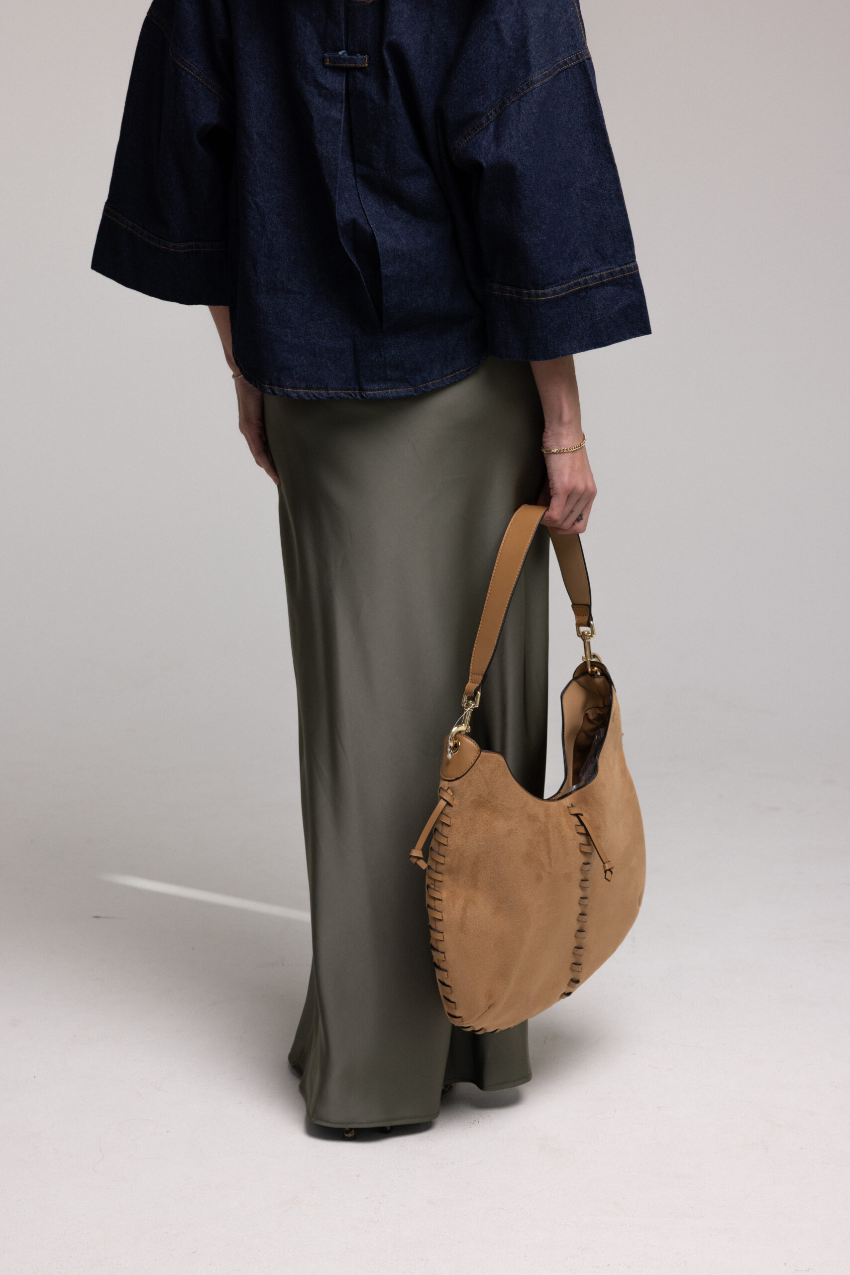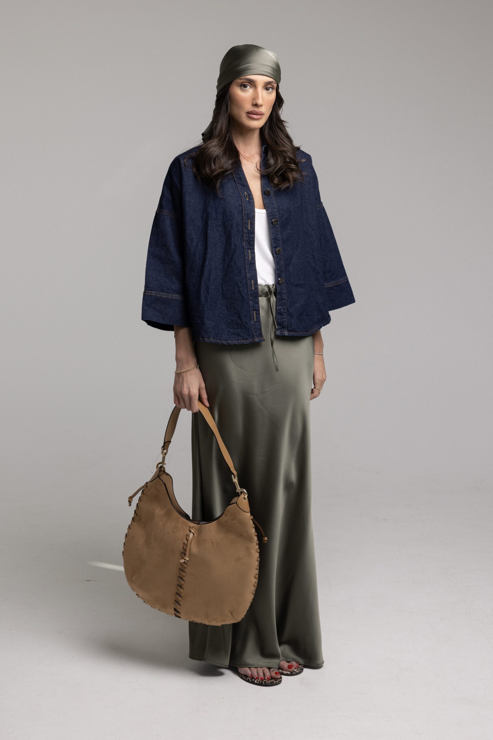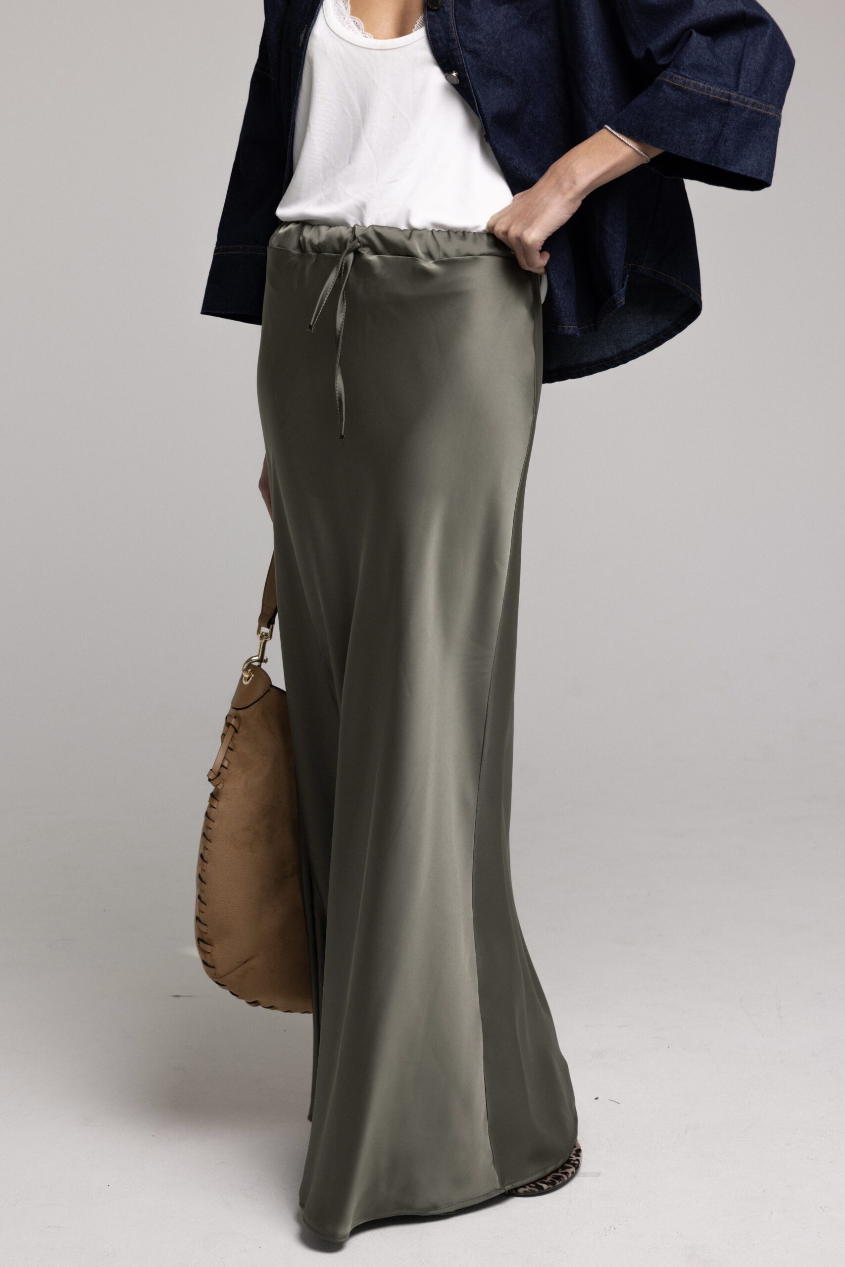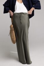 חצאית מושלמת מבד סאטן משי נשפכת על הגוף למראה קלאסי ומדהים וגומי במותן.
