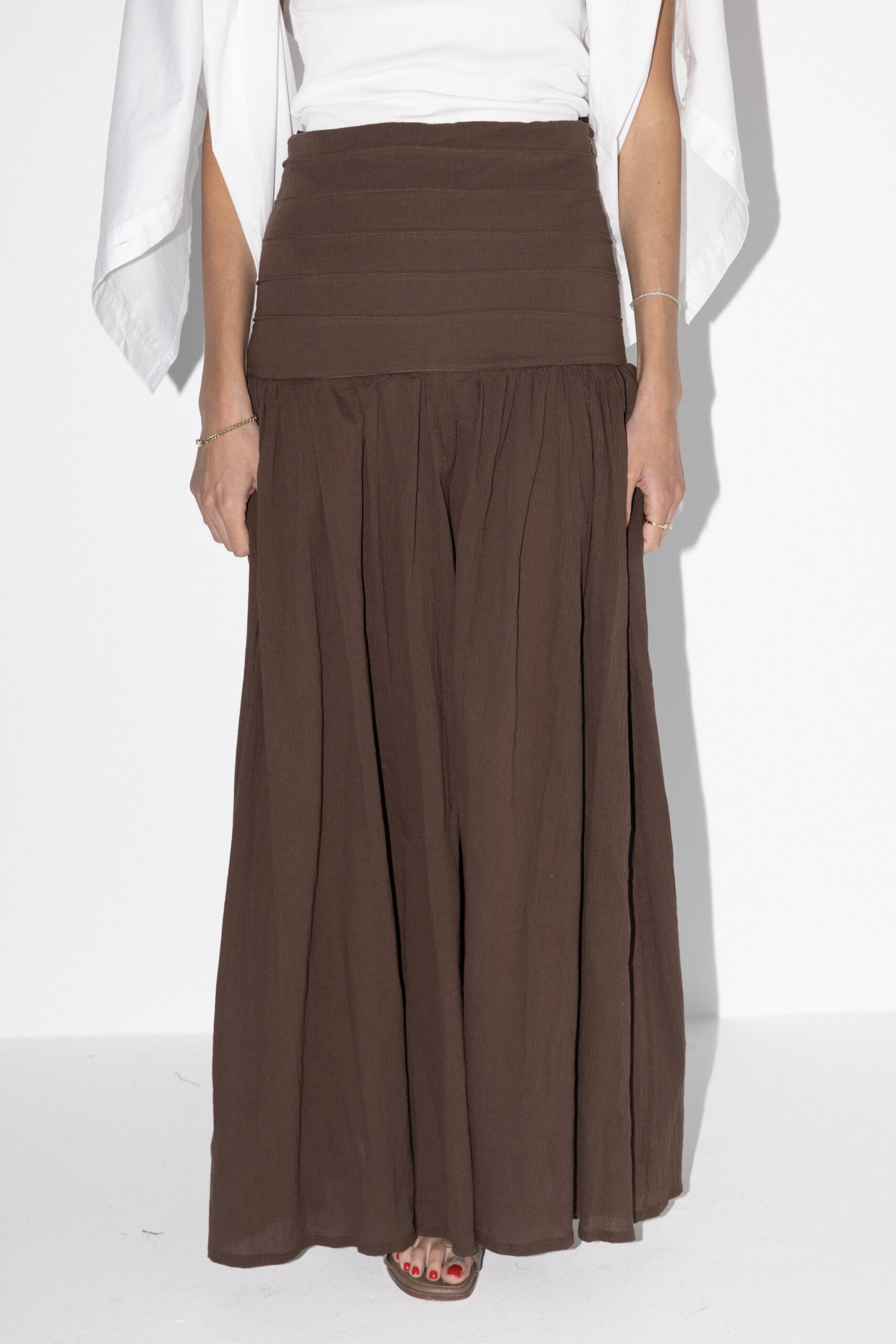 חצאית באורך מקסי עם קפלים למעלה ורוכסן צידי מבד פישתני רק ונעים. מידת הבגד על הדוגמנית 0.