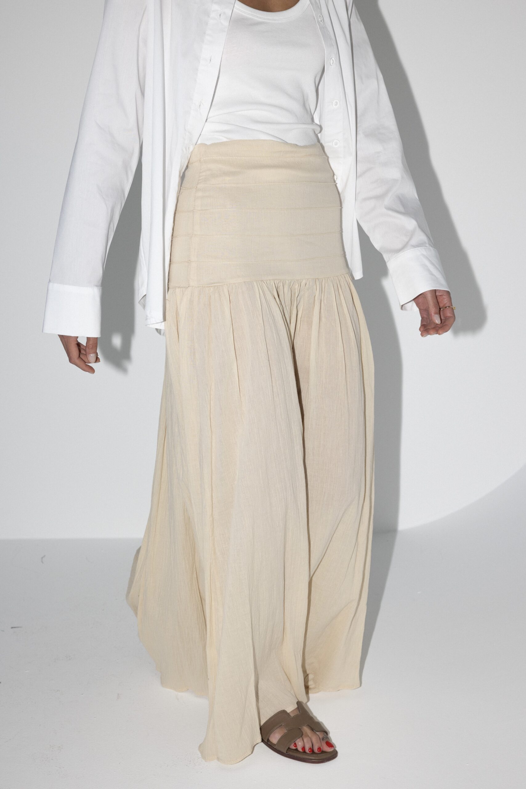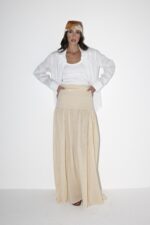 חצאית באורך מקסי עם קפלים למעלה ורוכסן צידי מבד פישתני רק ונעים. מידת הבגד על הדוגמנית 0.