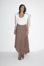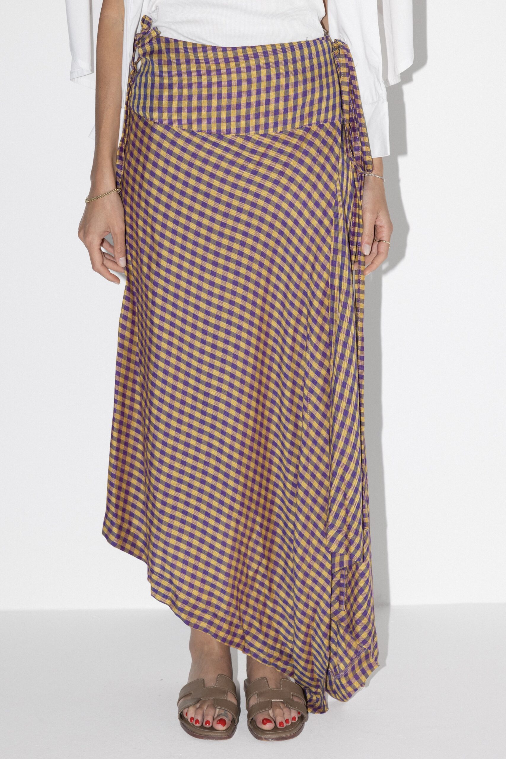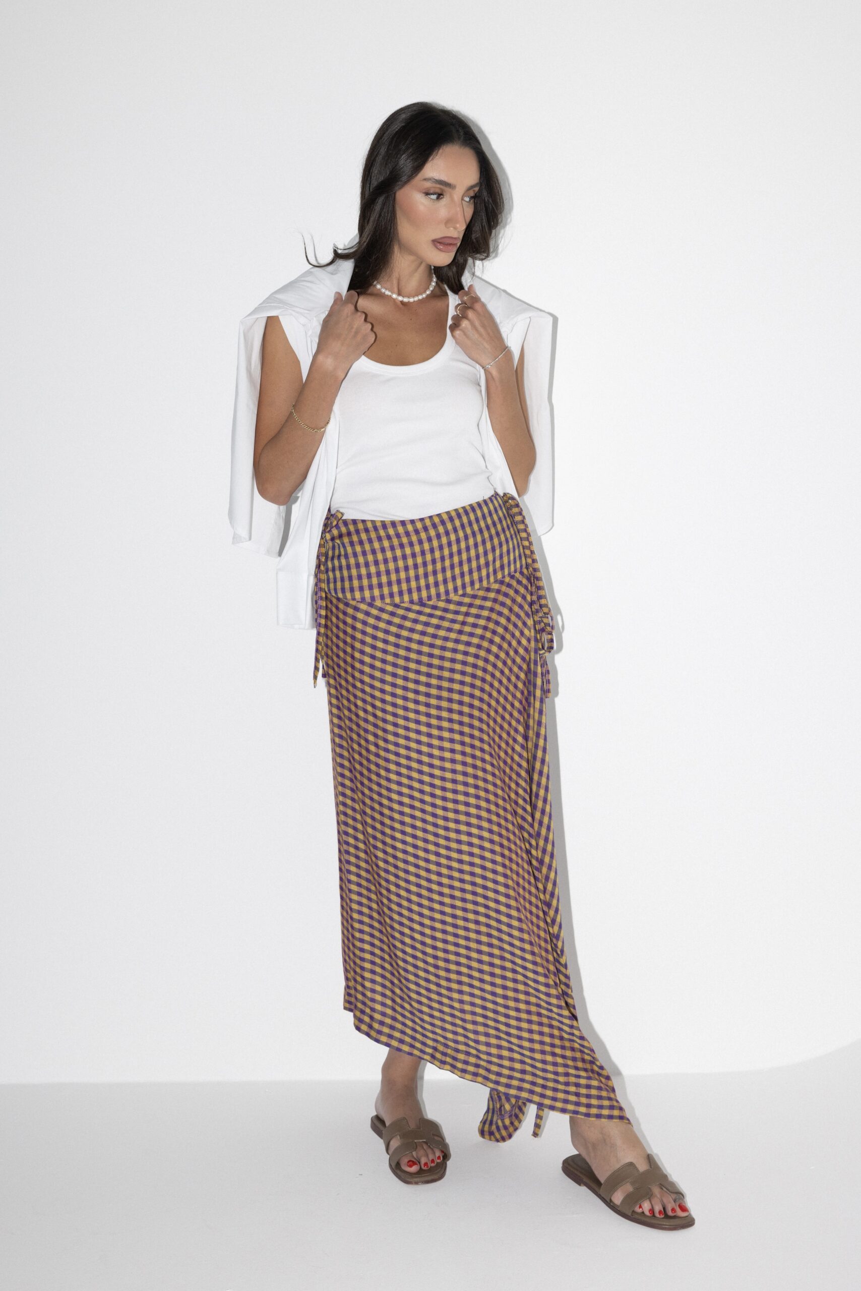 חצאית מעטפת בגזרה א-סימטרית באורך מידי, בד פישתן וקשירות מסביב למותן.