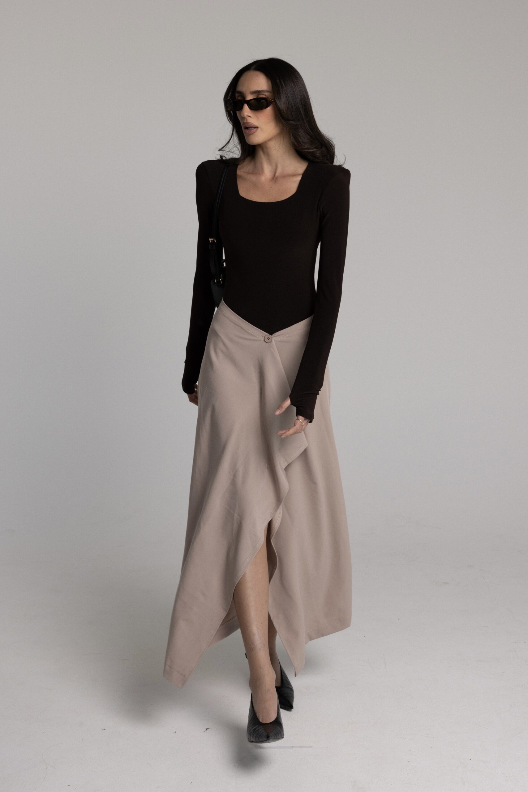 חצאית ארוכה עם כפתור באמצע ושסע קדמי.