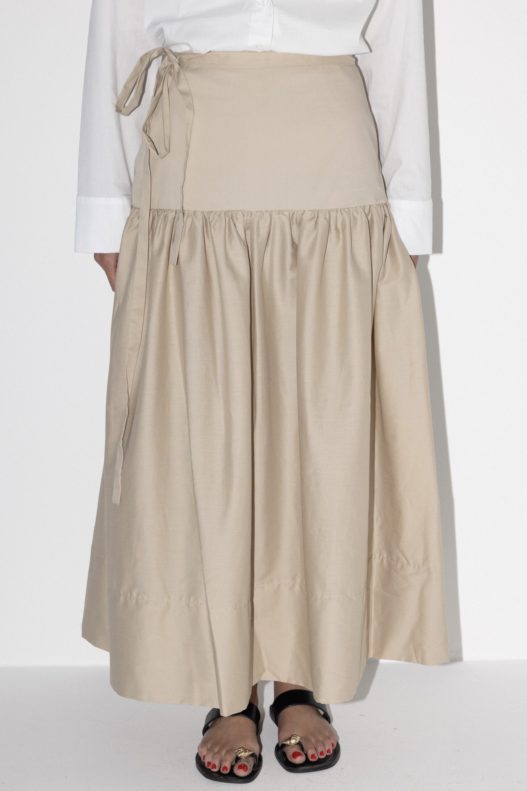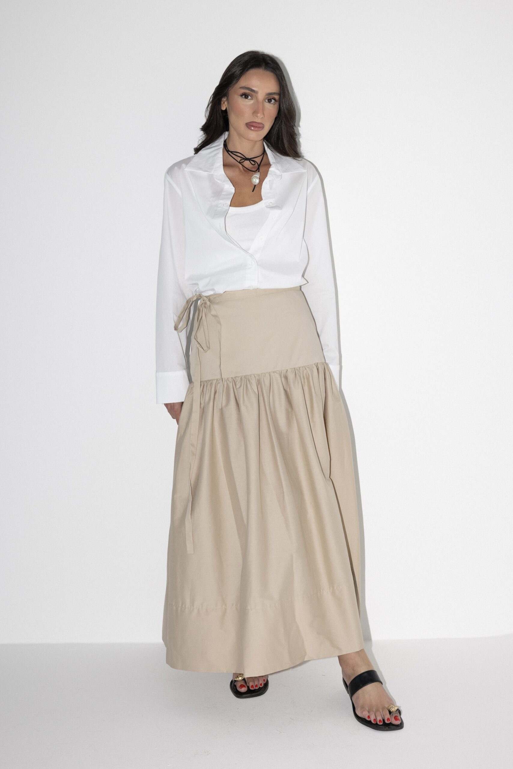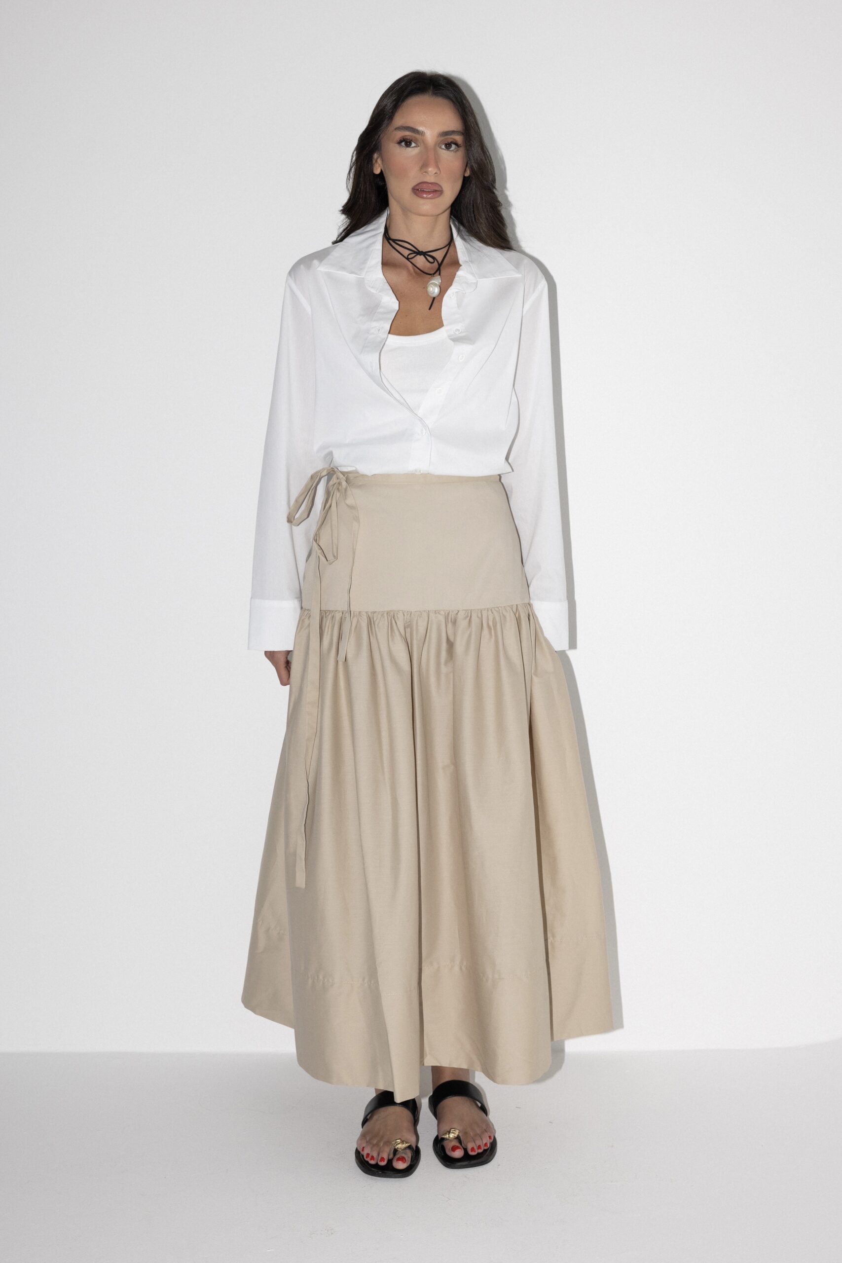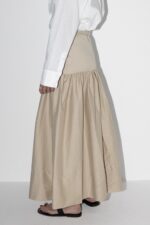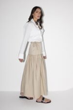 חצאית באורך מידי בגזרת A מבד עומד עם רוכסן אחורי וקשירות במותן.