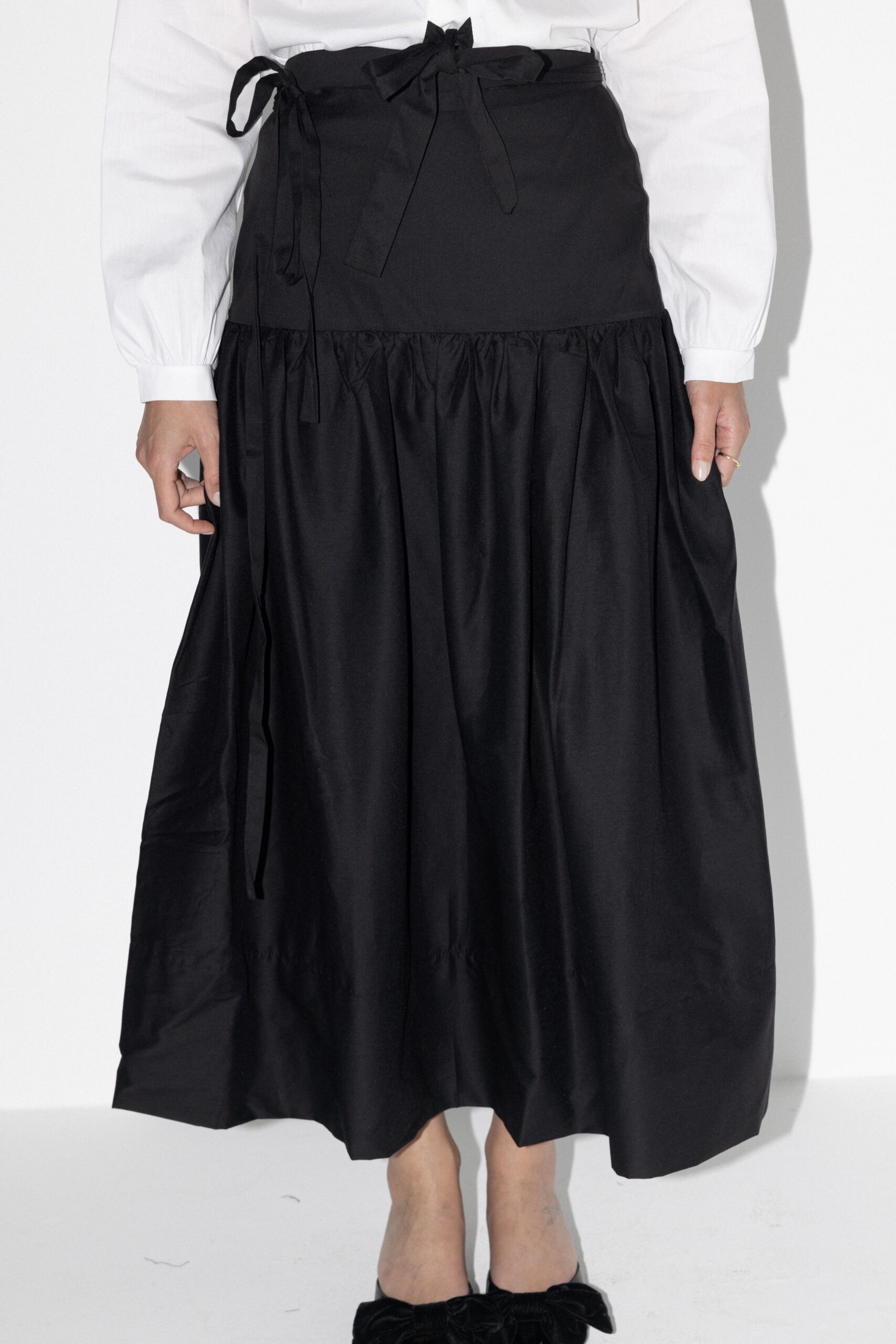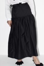 חצאית באורך מידי בגזרת A מבד עומד עם רוכסן אחורי וקשירות במותן.