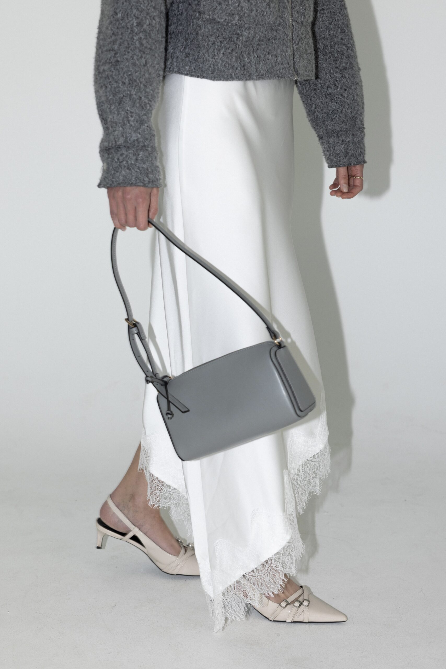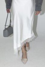 חצאית א-סימטרית אלכסונית מבד סאטן משי ותחרה בסיומת.