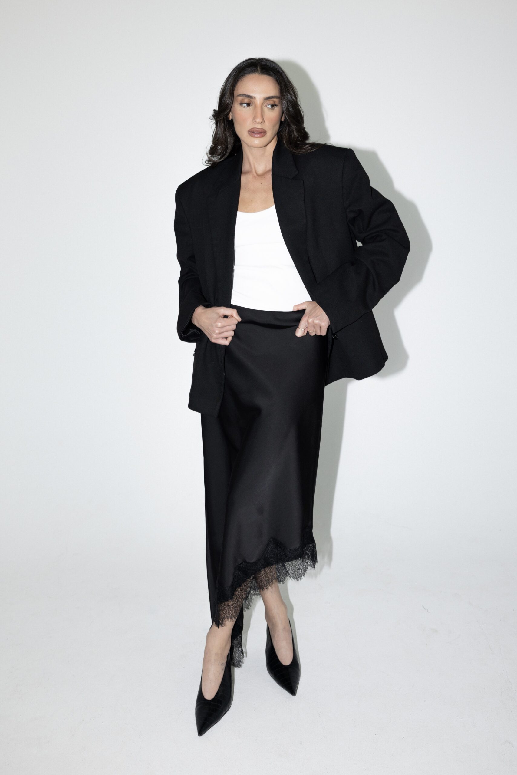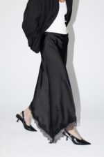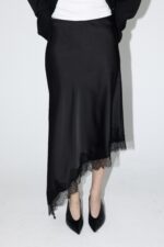 חצאית א-סימטרית אלכסונית מבד סאטן משי ותחרה בסיומת.