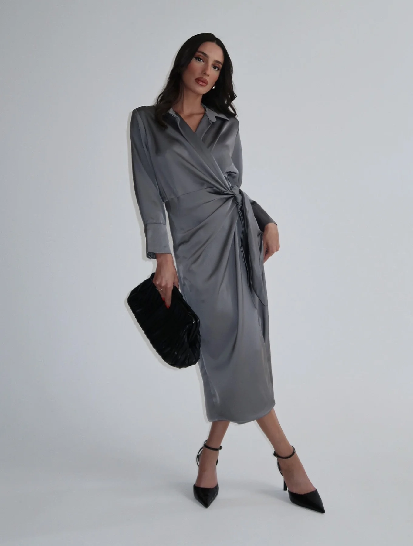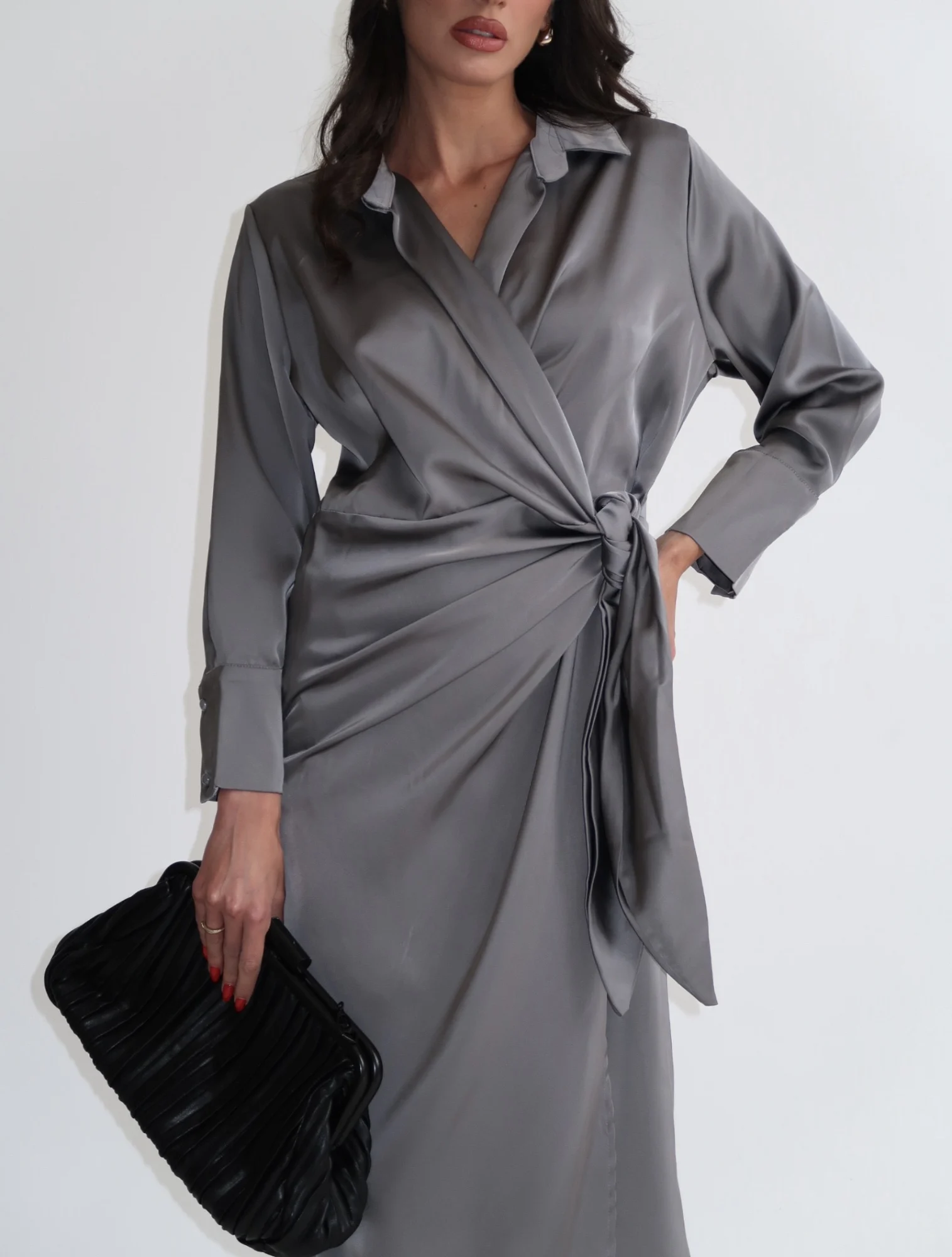 שמלת מעטפת בגזרת מידי מבד סאטן, שרוולים ארוכים וצווארון קלאסי וקשירה במותן.