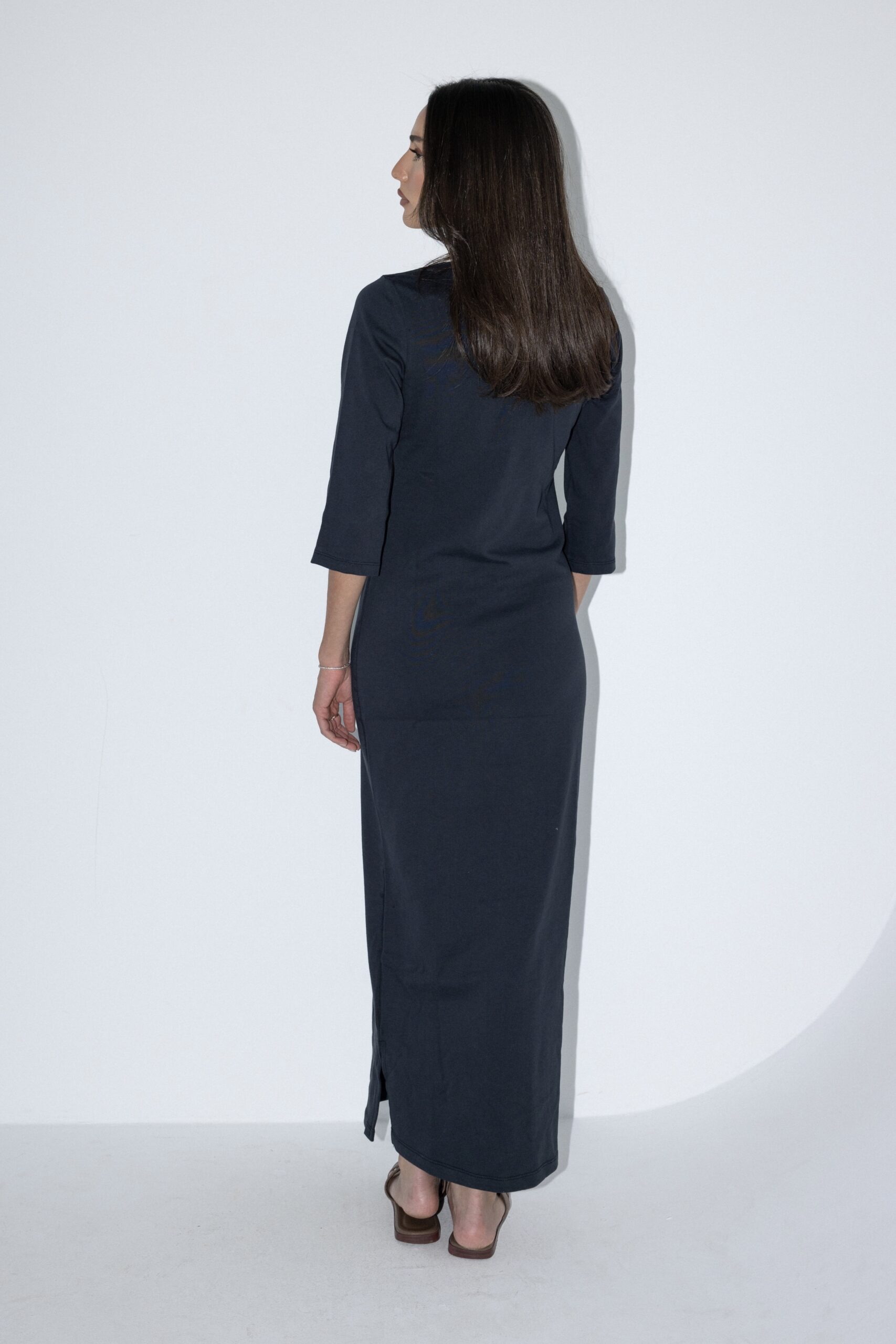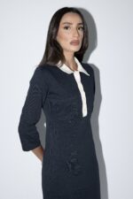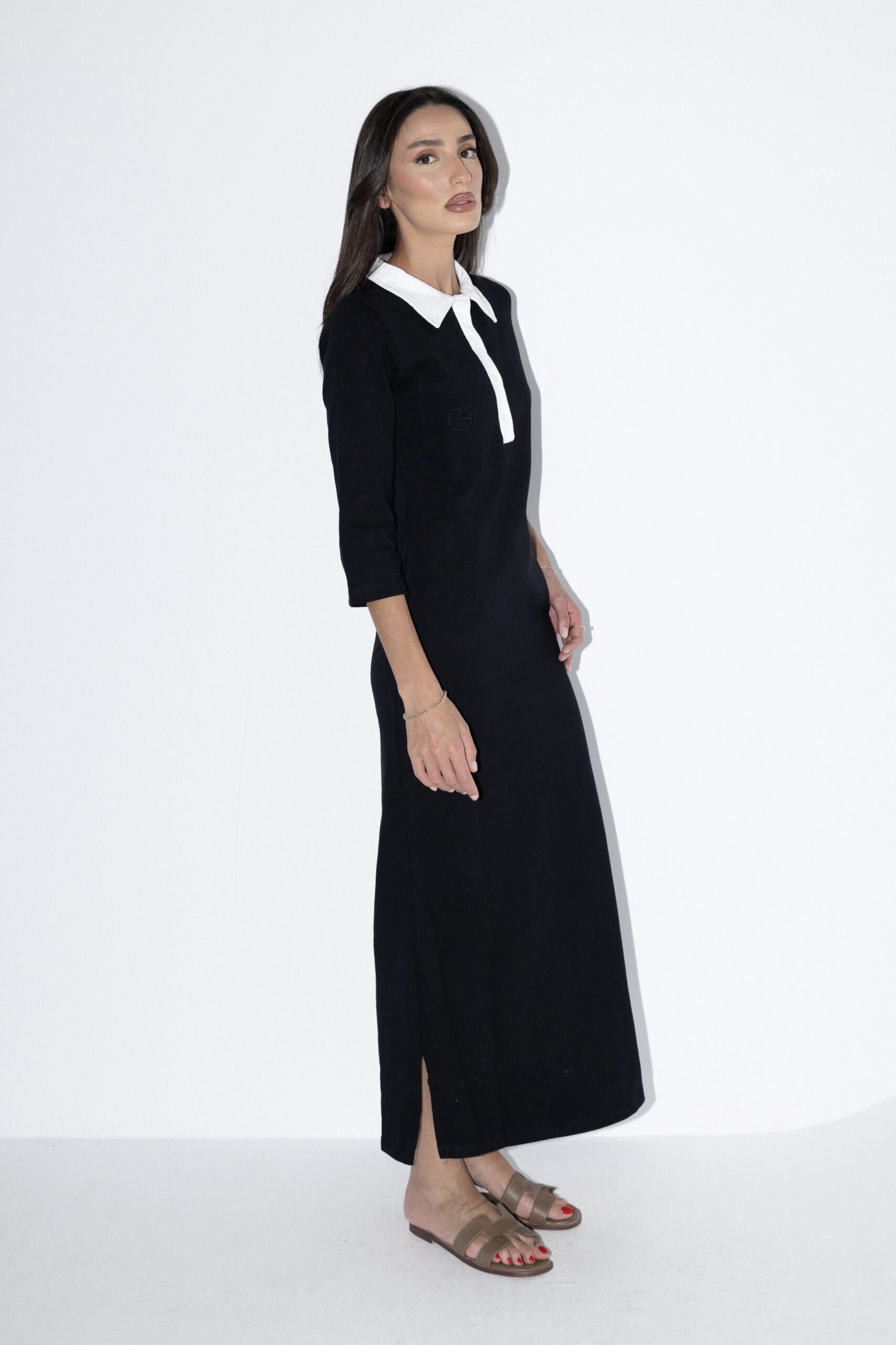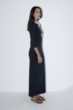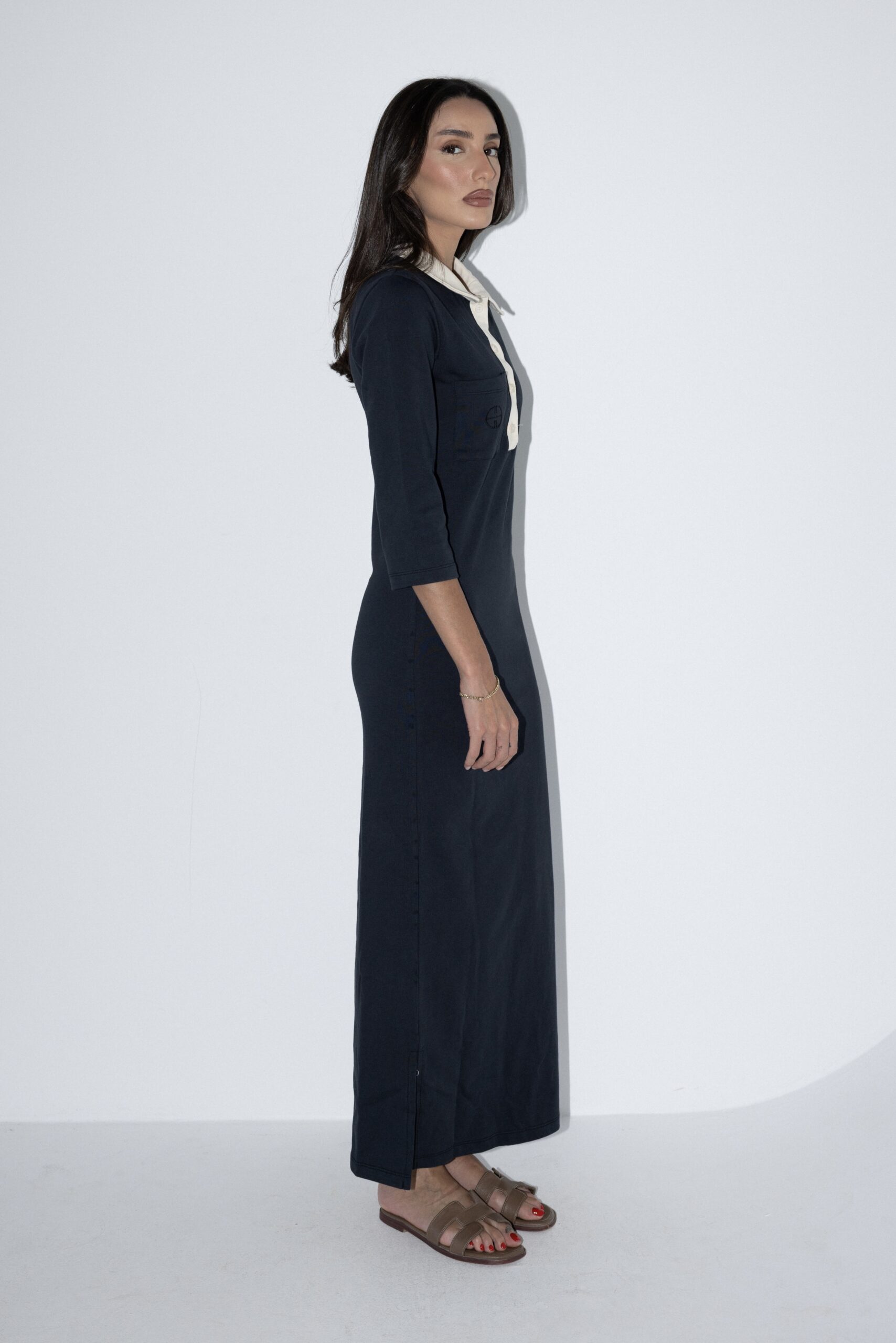שמלה ארוכה בסגנון קלאסי ומינימליסטי, עם גזרה ישרה ומחמיאה. השמלה כוללת שרוולים באורך 3/4, צווארון לבן מחודד ושורת כפתורים קצרה בחלק העליון להוספת נגיעה אלגנטית. מידת הבגד על הדוגמנית 0.