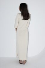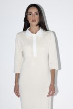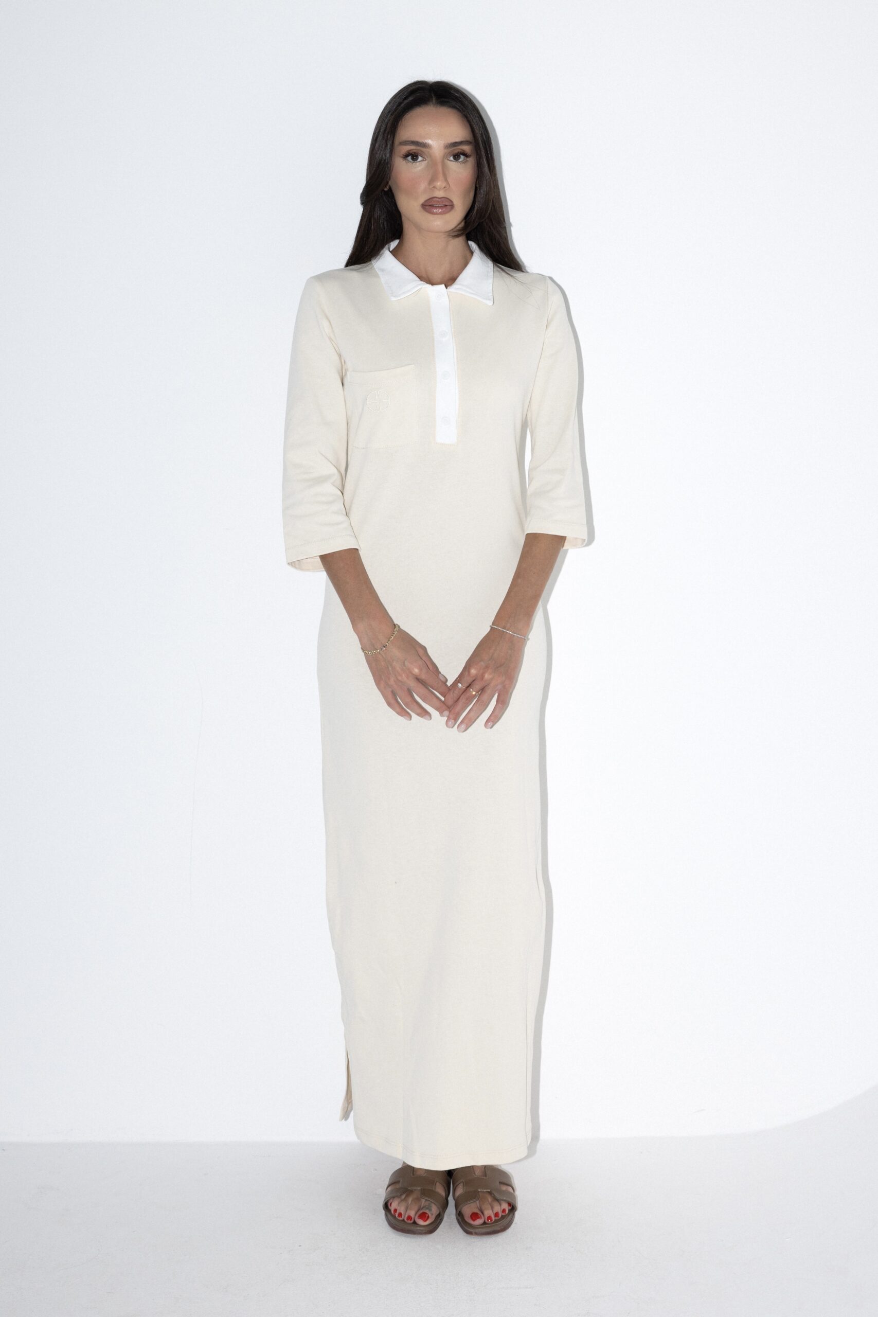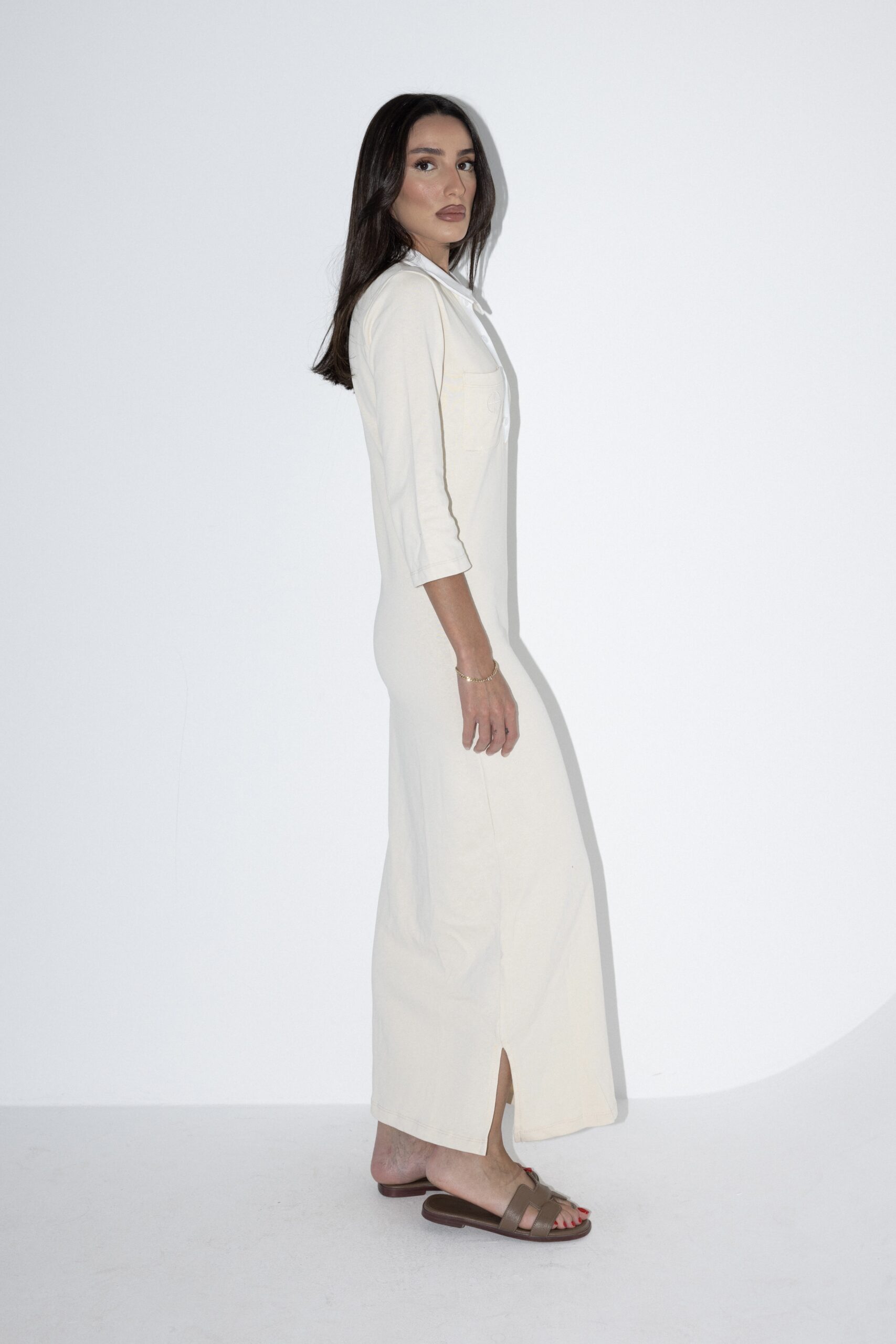 שמלה ארוכה בסגנון קלאסי ומינימליסטי, עם גזרה ישרה ומחמיאה. השמלה כוללת שרוולים באורך 3/4, צווארון לבן מחודד ושורת כפתורים קצרה בחלק העליון להוספת נגיעה אלגנטית. מידת הבגד על הדוגמנית 0.