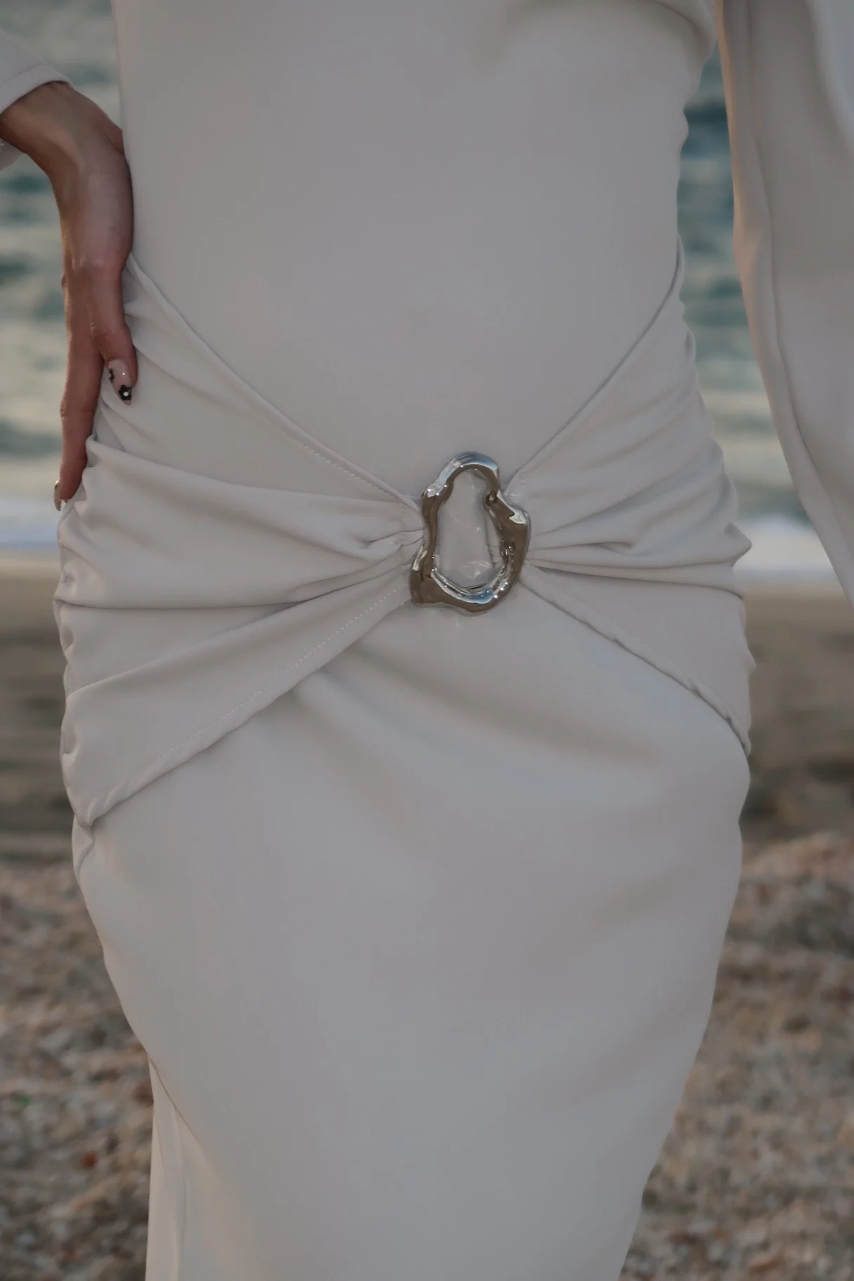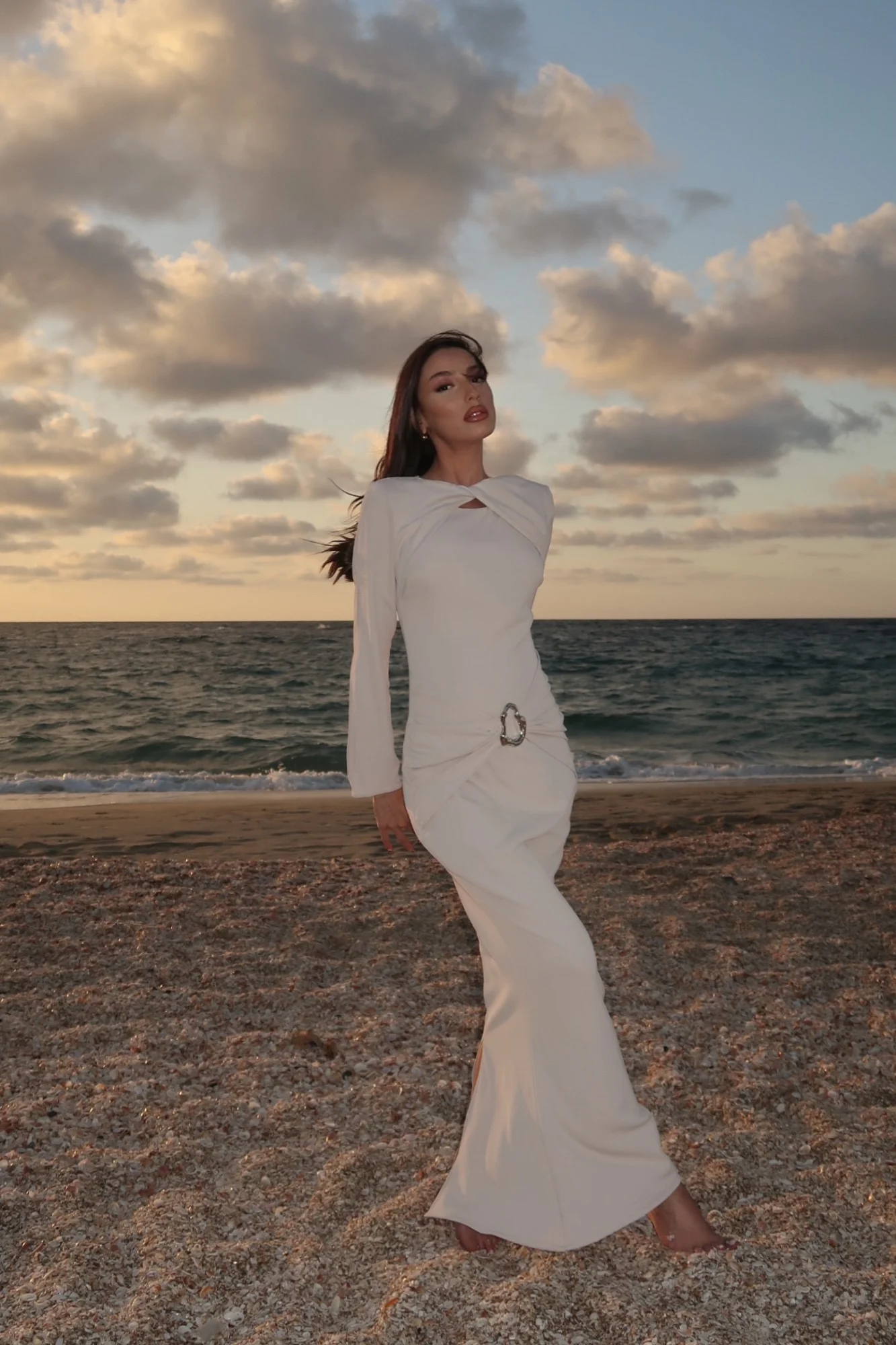שמלת ערב בגזרה צמודה, שרוולים ארוכים עם כריות בכתפיים, כיווצים באזור המותניים למראה צר וקלאסי.
