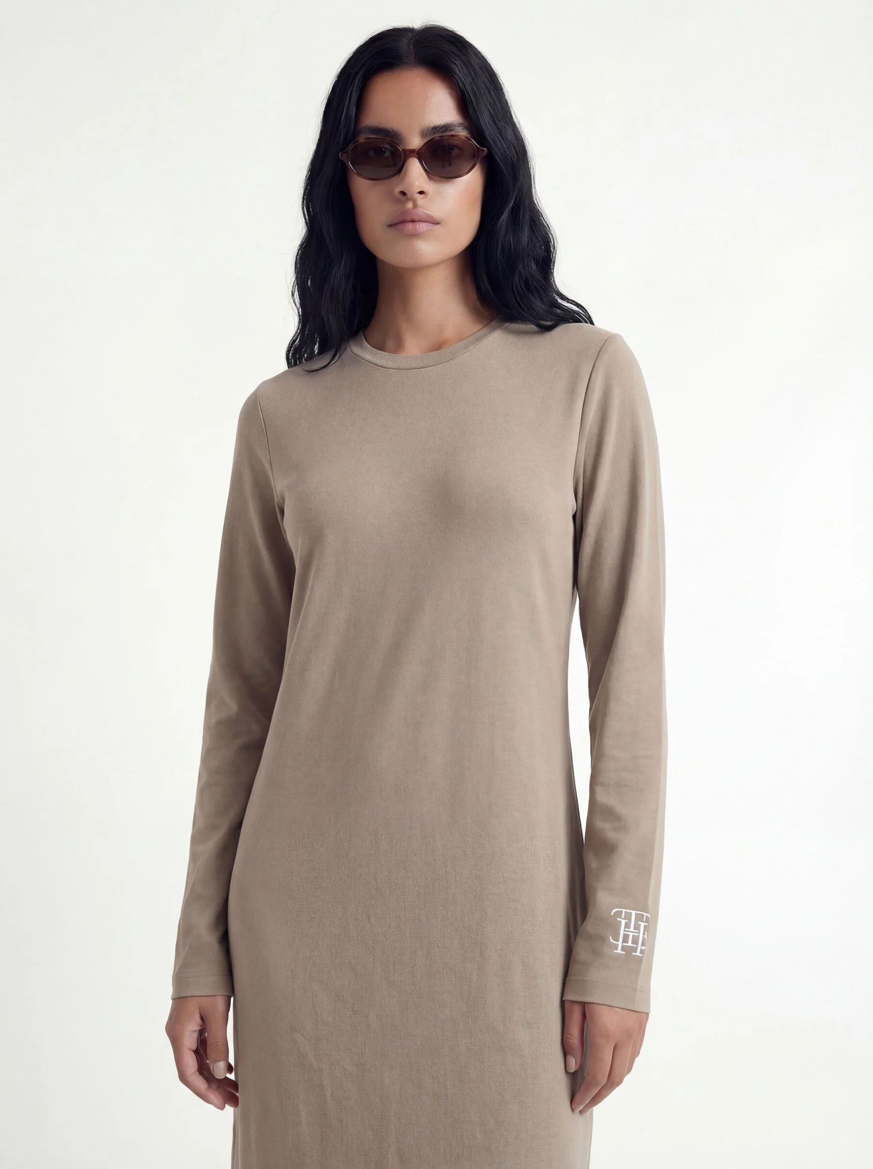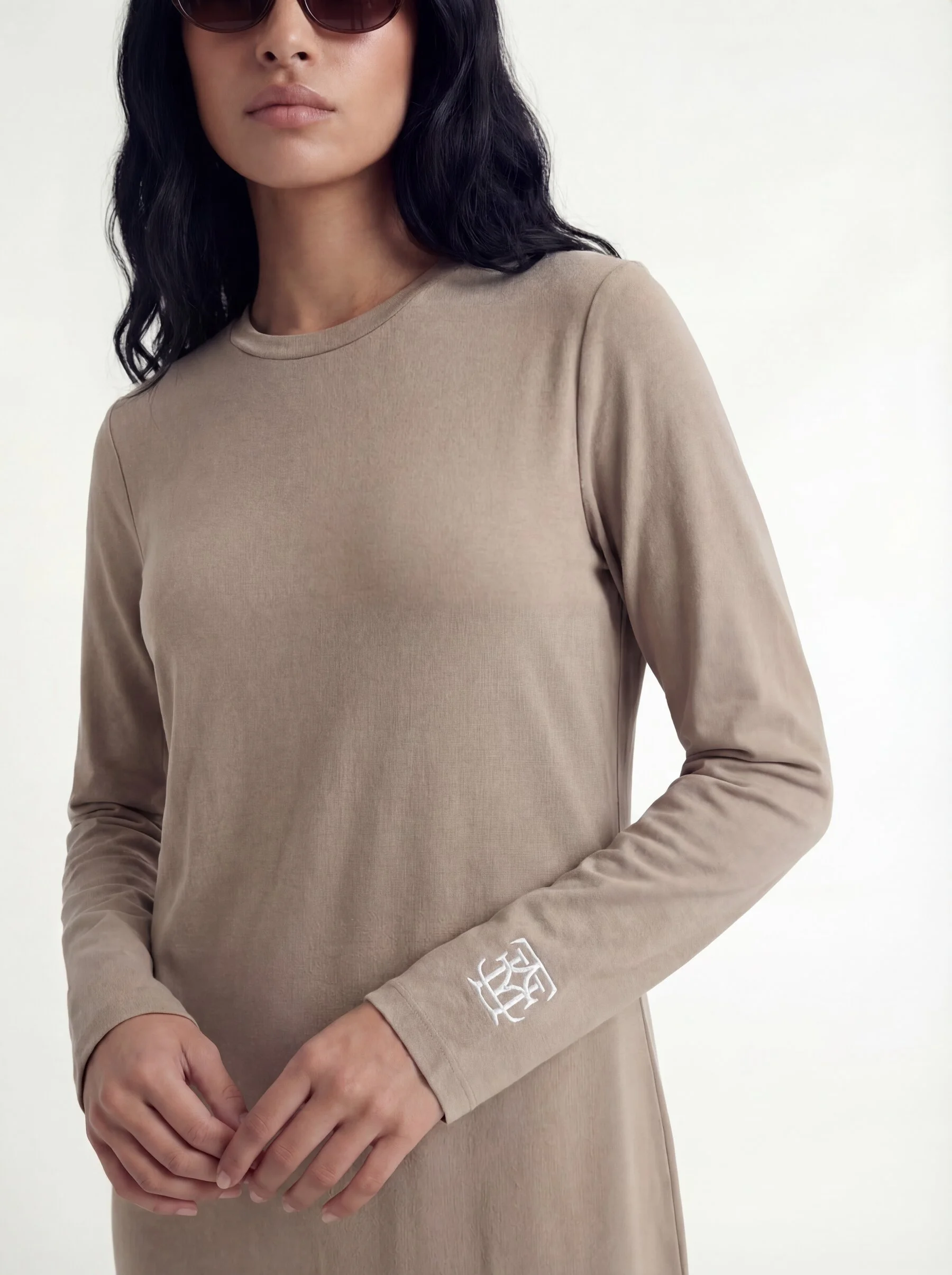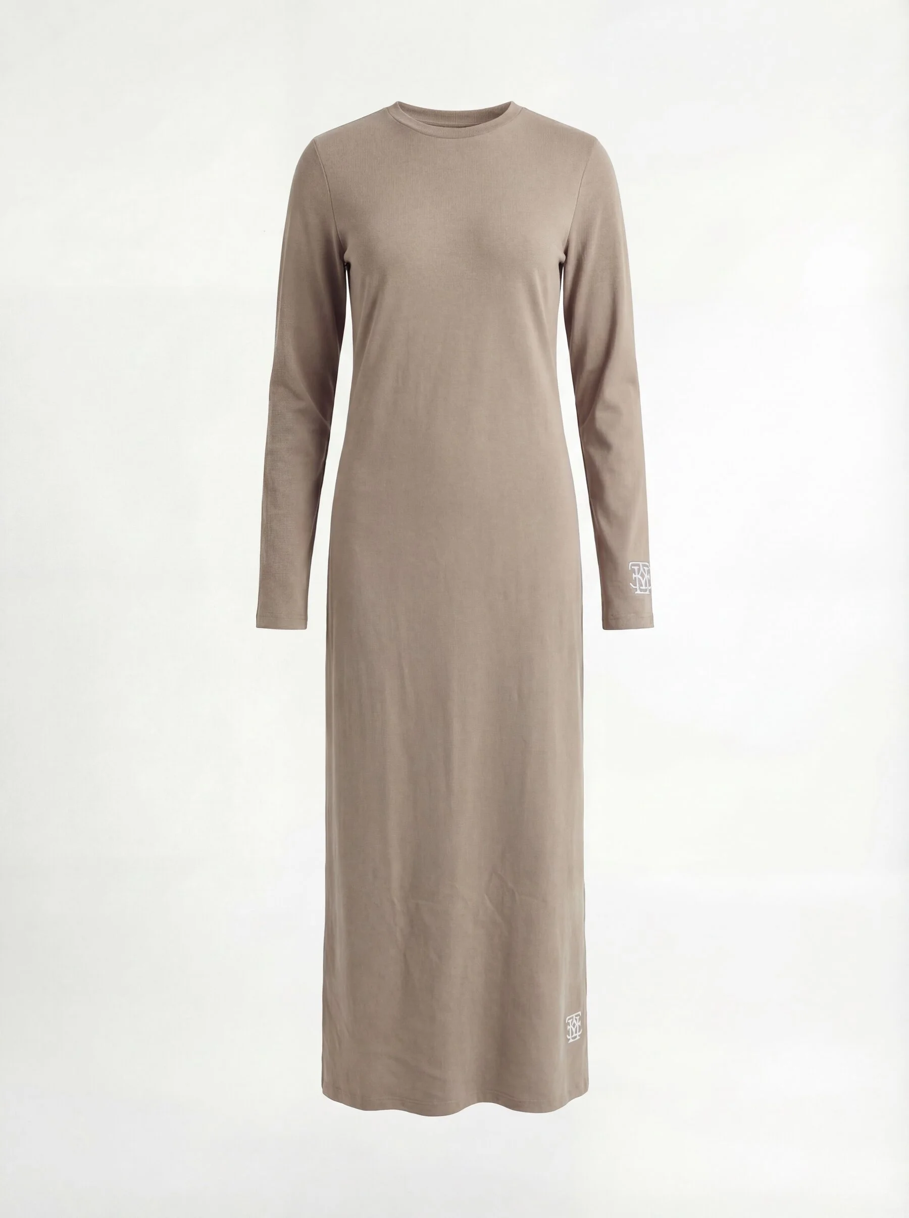 שמלת בייסיק בגזרת אובר סייז באורך מקסי עם שני שסעים קטנים בצידי השמלה ולוגו חרוט ביד ובסיומת השמלה.