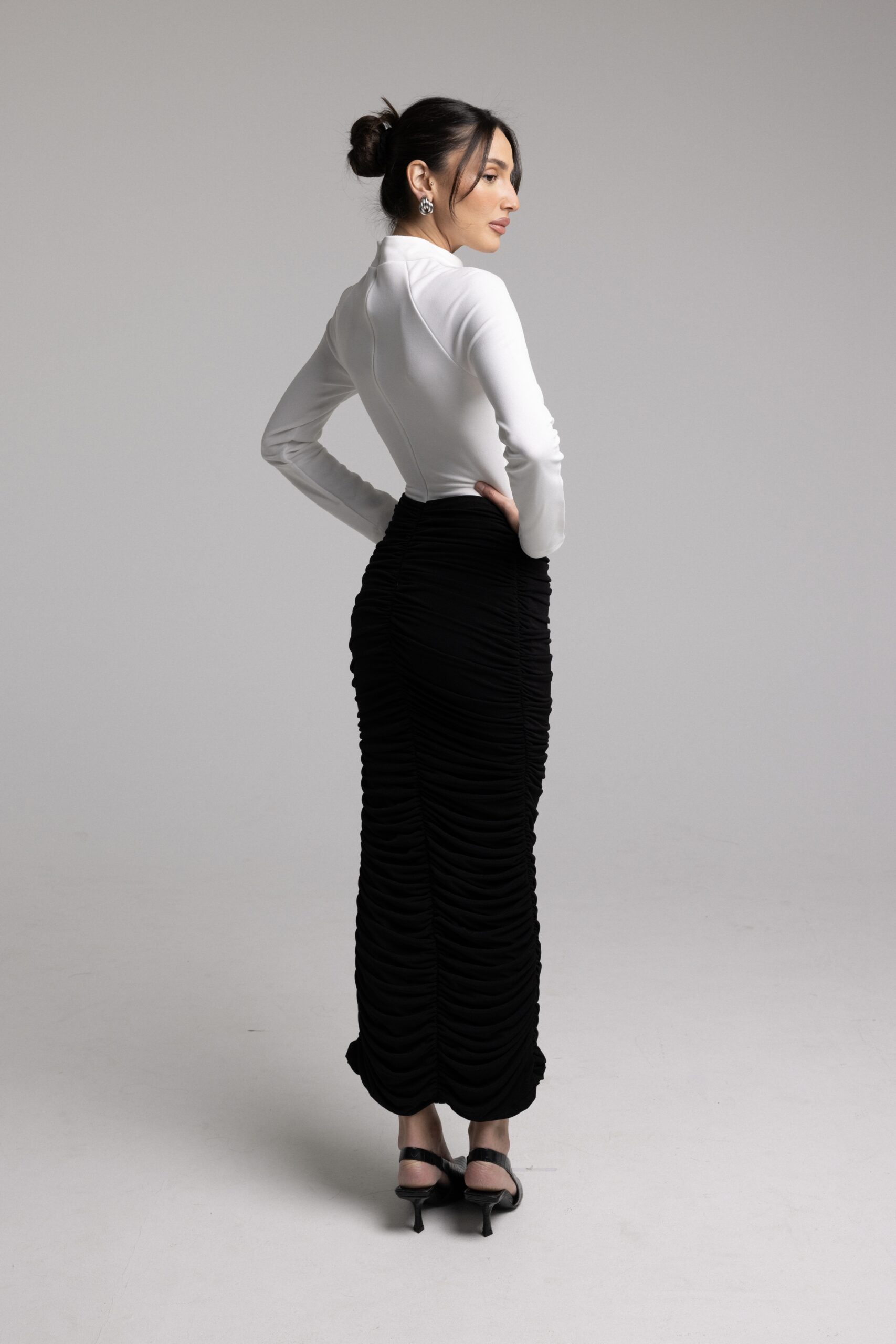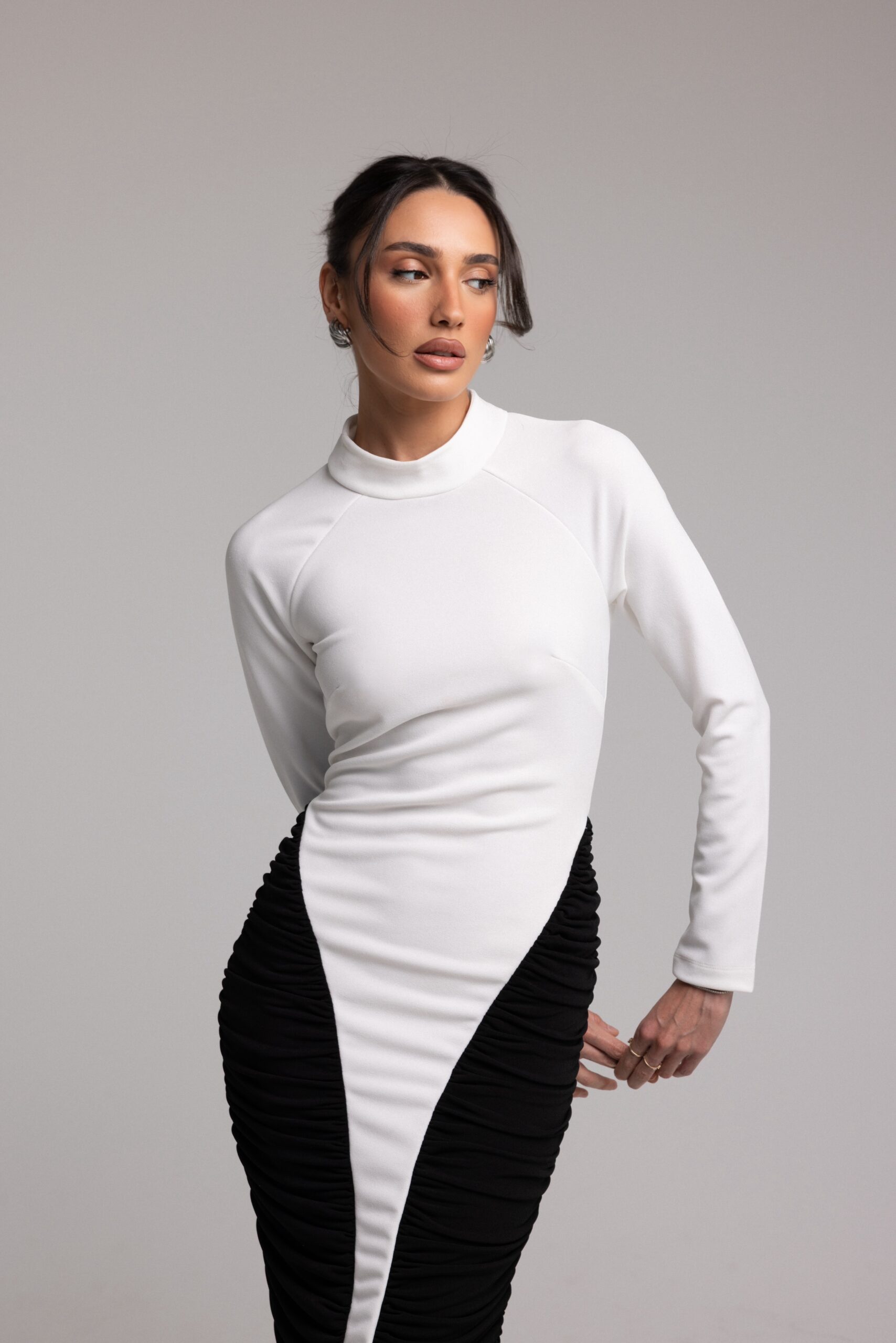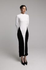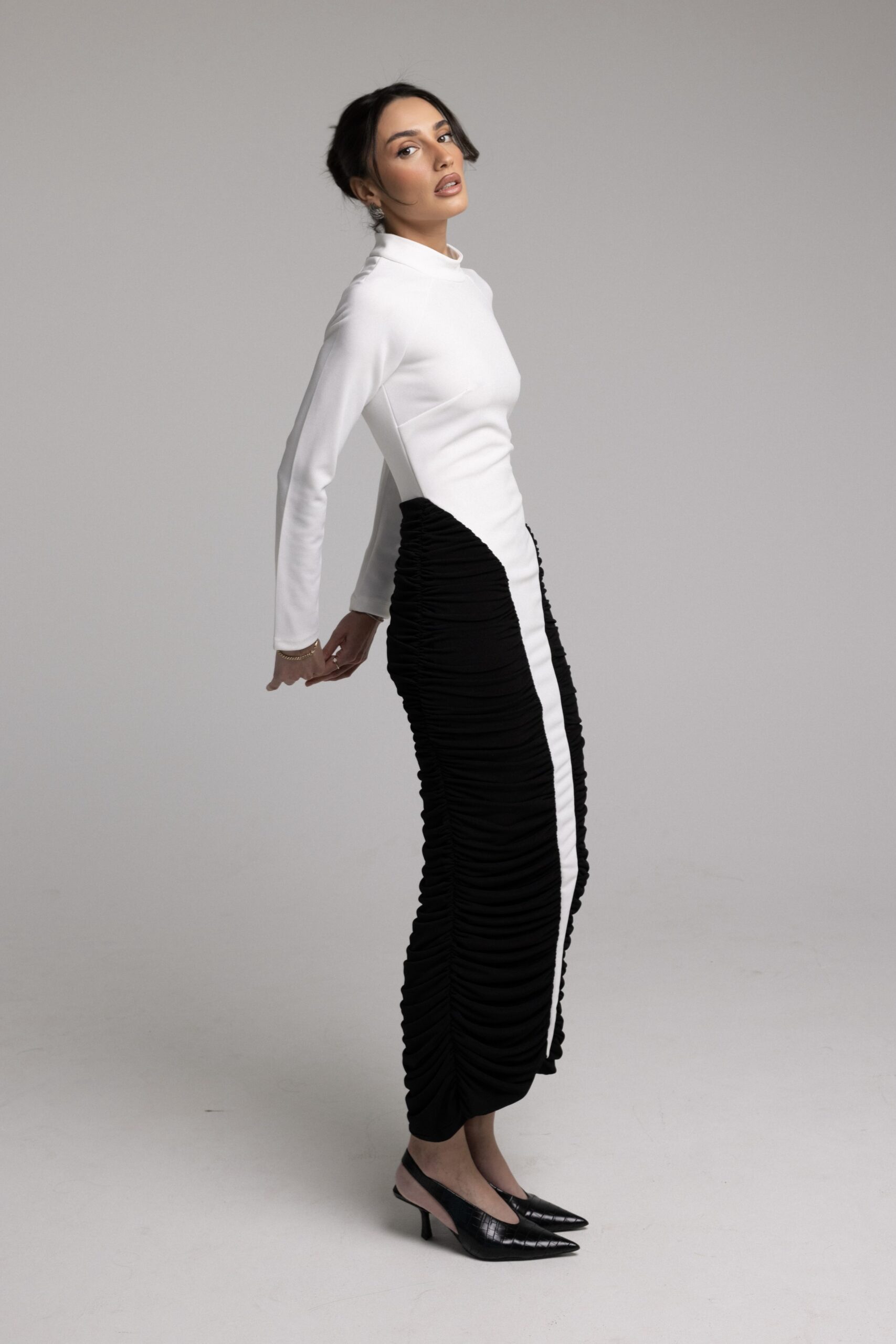 שמלת ערב בשילוב שני בדים היוצרים גזרה קלאסית וצרה לגוף, כיווצים בצידי הגוף ושרוולים ארוכים.