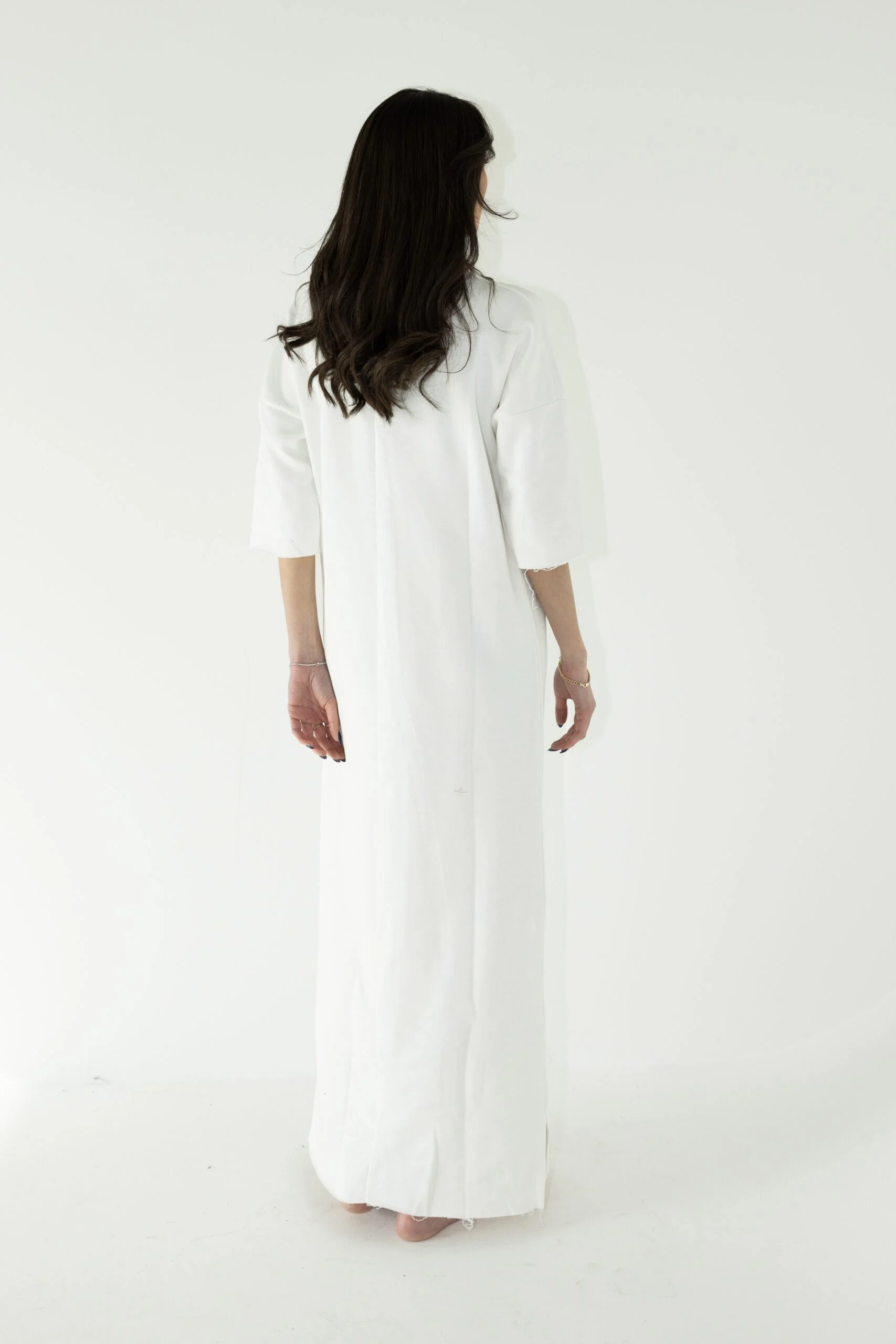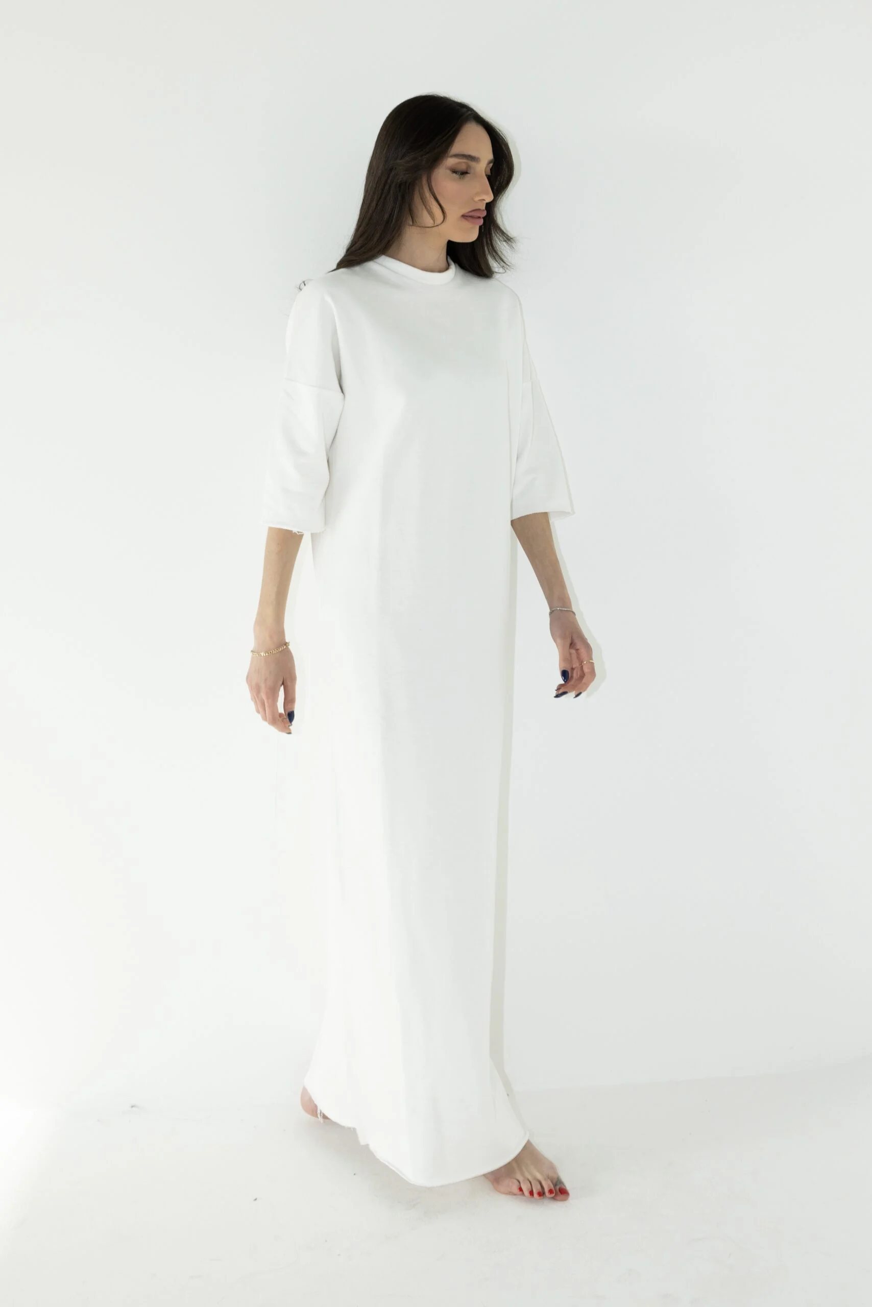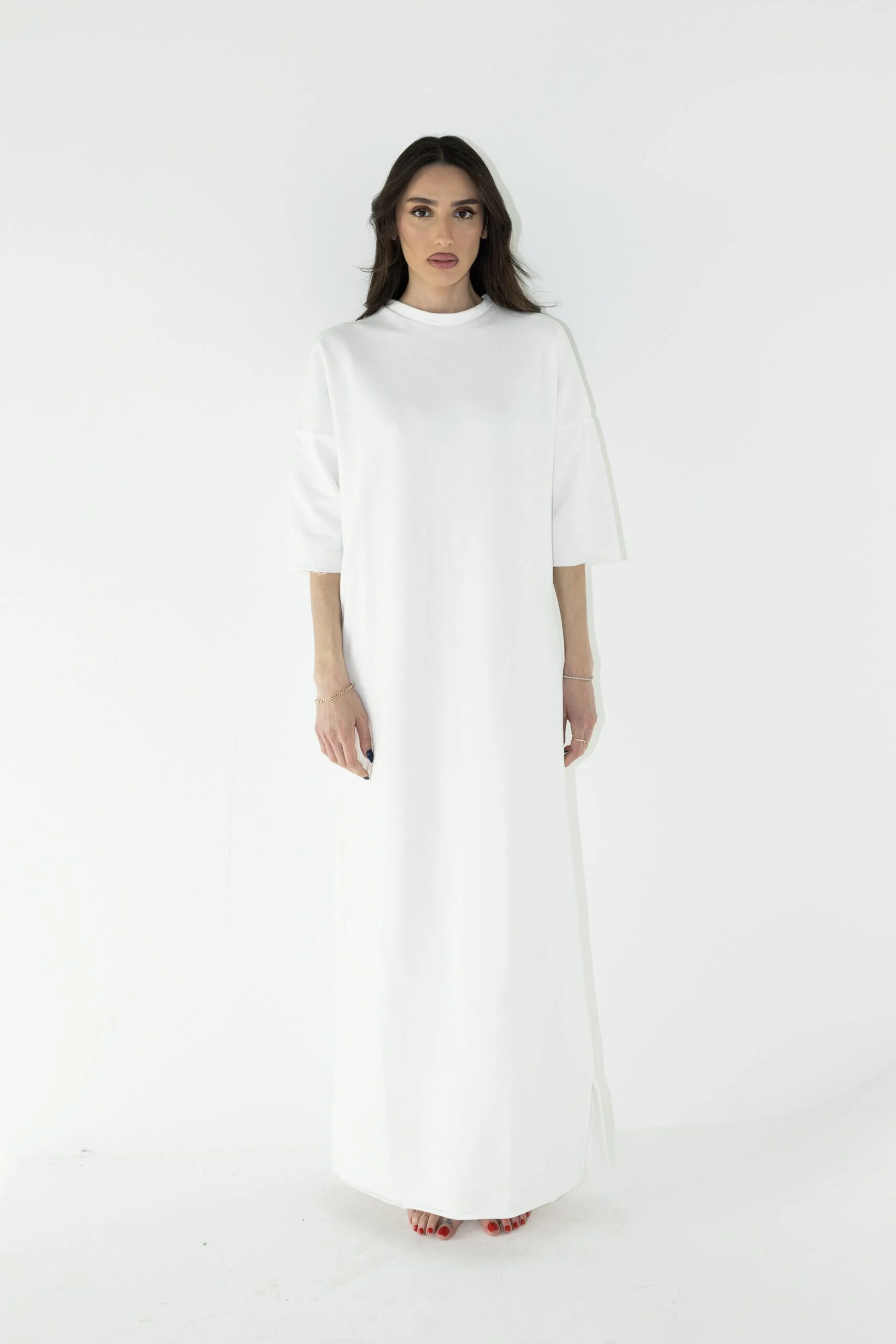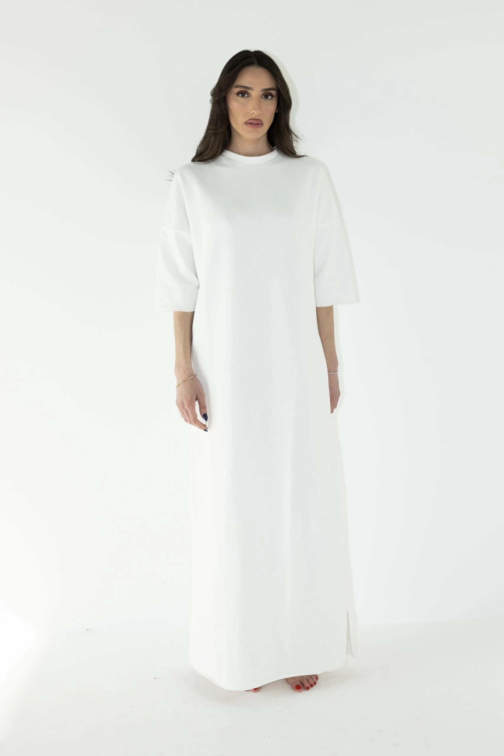 שמלת בייסיק בגזרת אובר סייז, שרוול 3/4 ושני שסעים קטנים בצידי השמלה.
