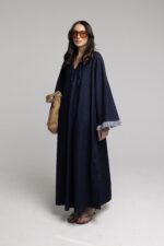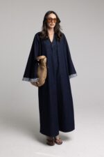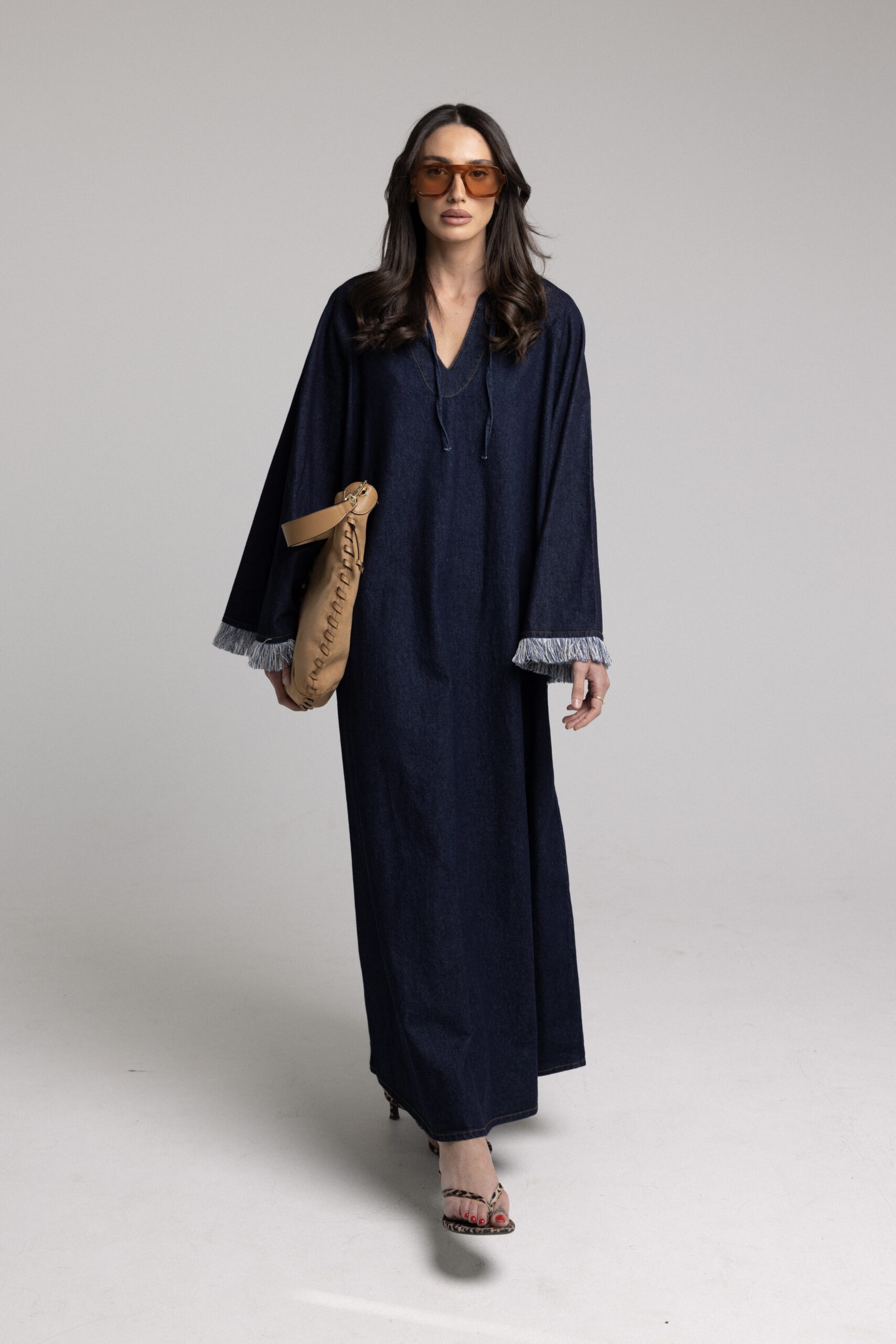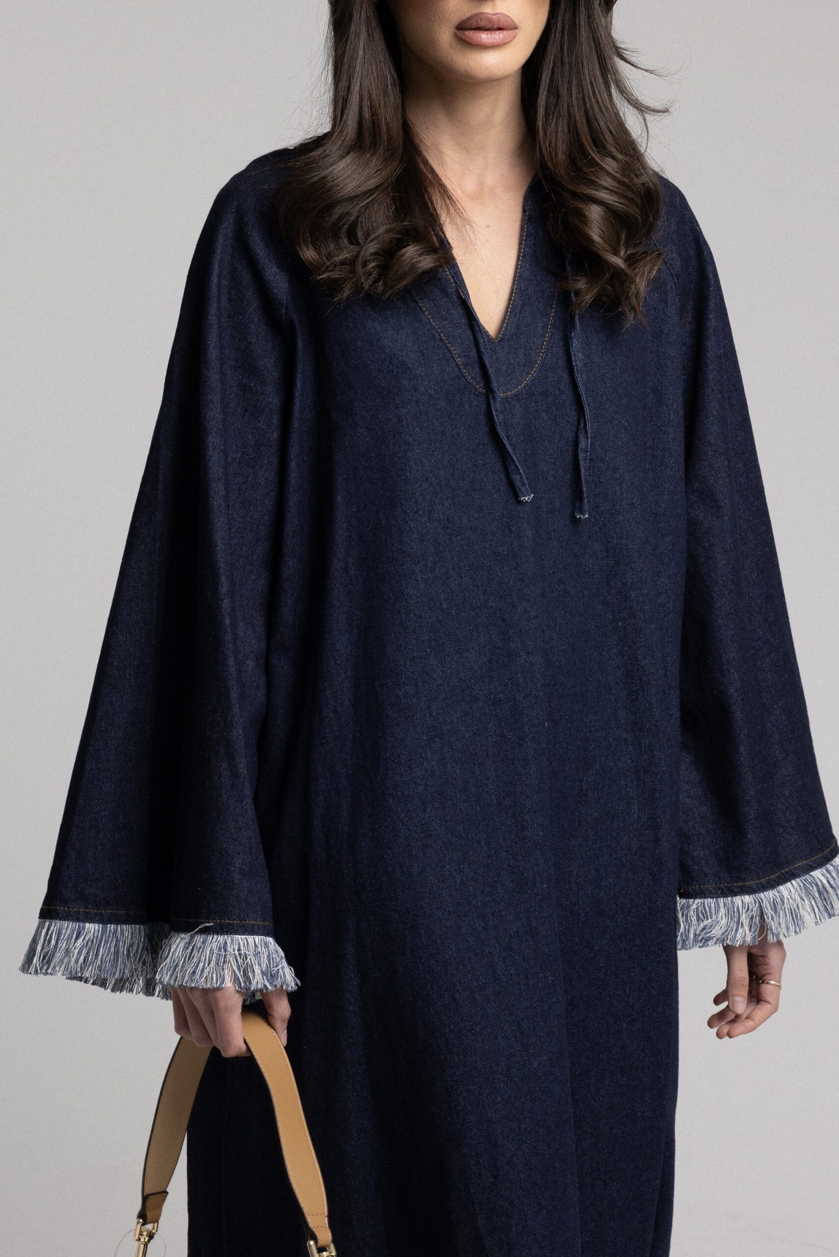 שמלת ג׳ינס ארוכה בגזרת אובר סייז, שרוולים ארוכים מתרחבים ובסיומת פרנזים.