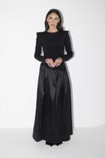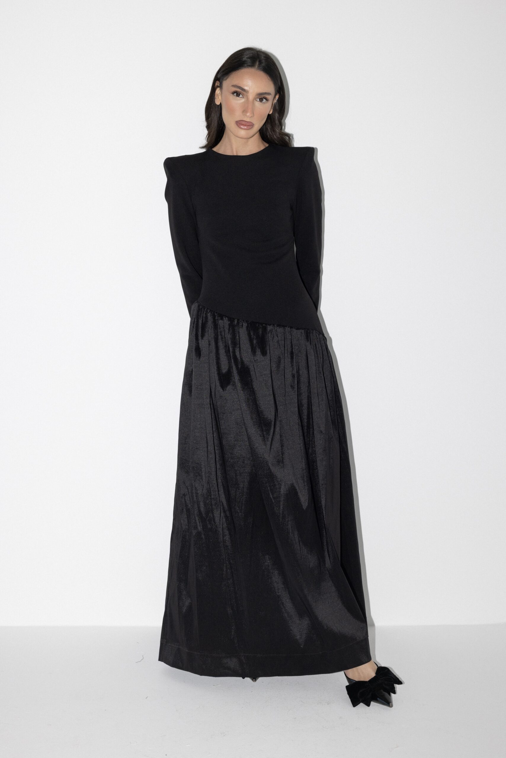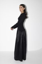שמלה אלגנטית בעלת גזרה מחמיאה עם חיתוך אלכסוני ייחודי באזור המותן. החלק העליון בגזרת סטרוקטורה חלקה עם שרוולים ארוכים וקווים נקיים, בעוד שהחלק התחתון עשוי מבד מבריק ונופל. מידת הבגד על הדוגמנית 0.