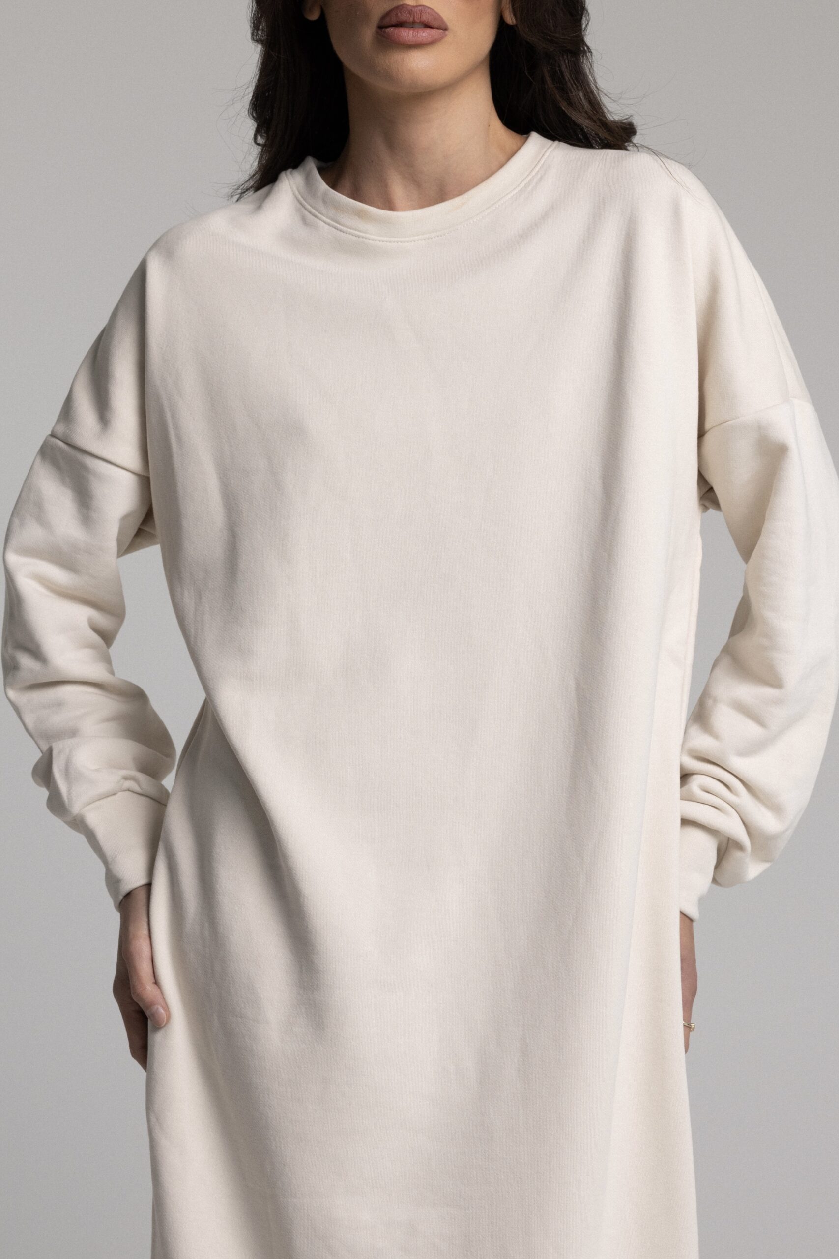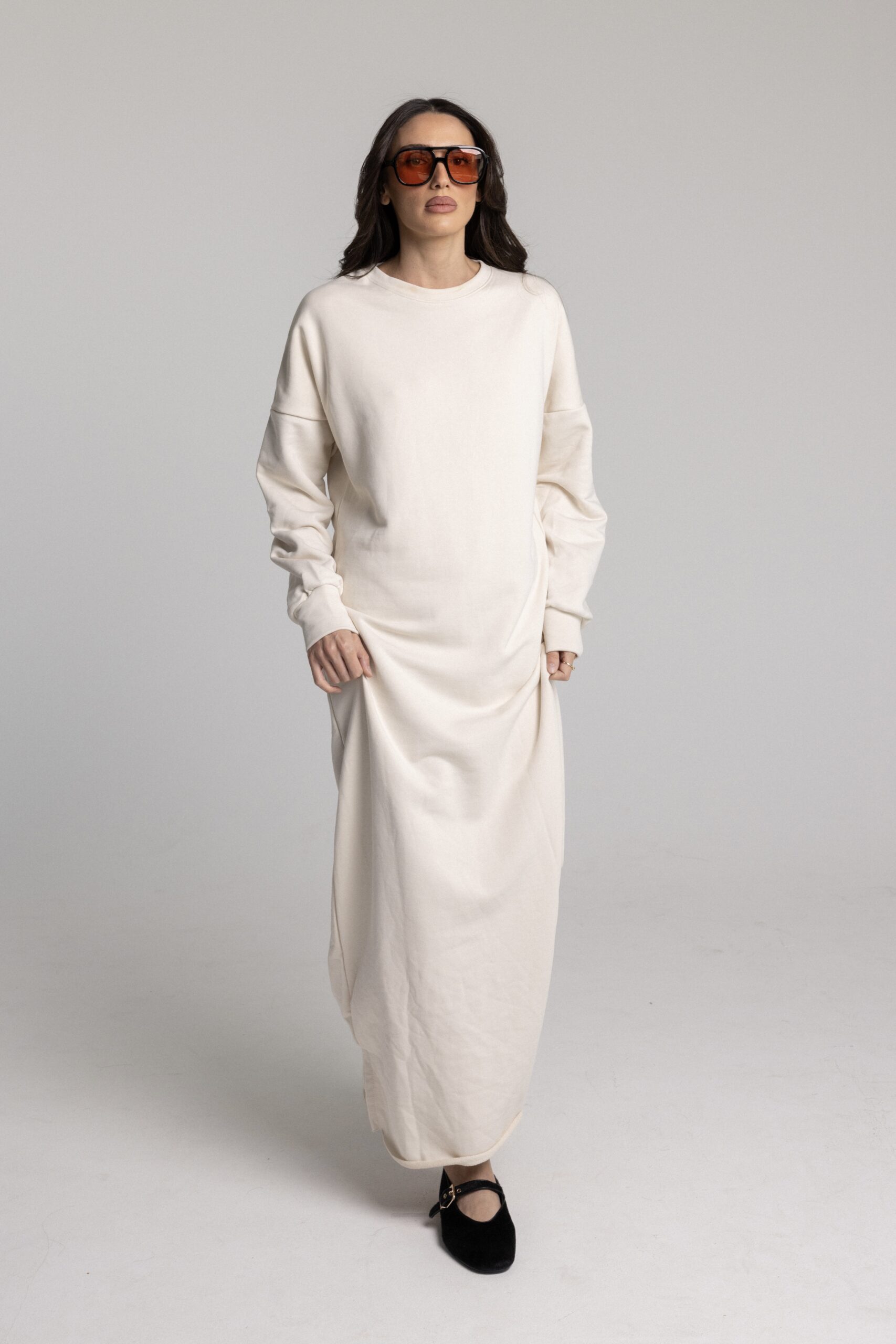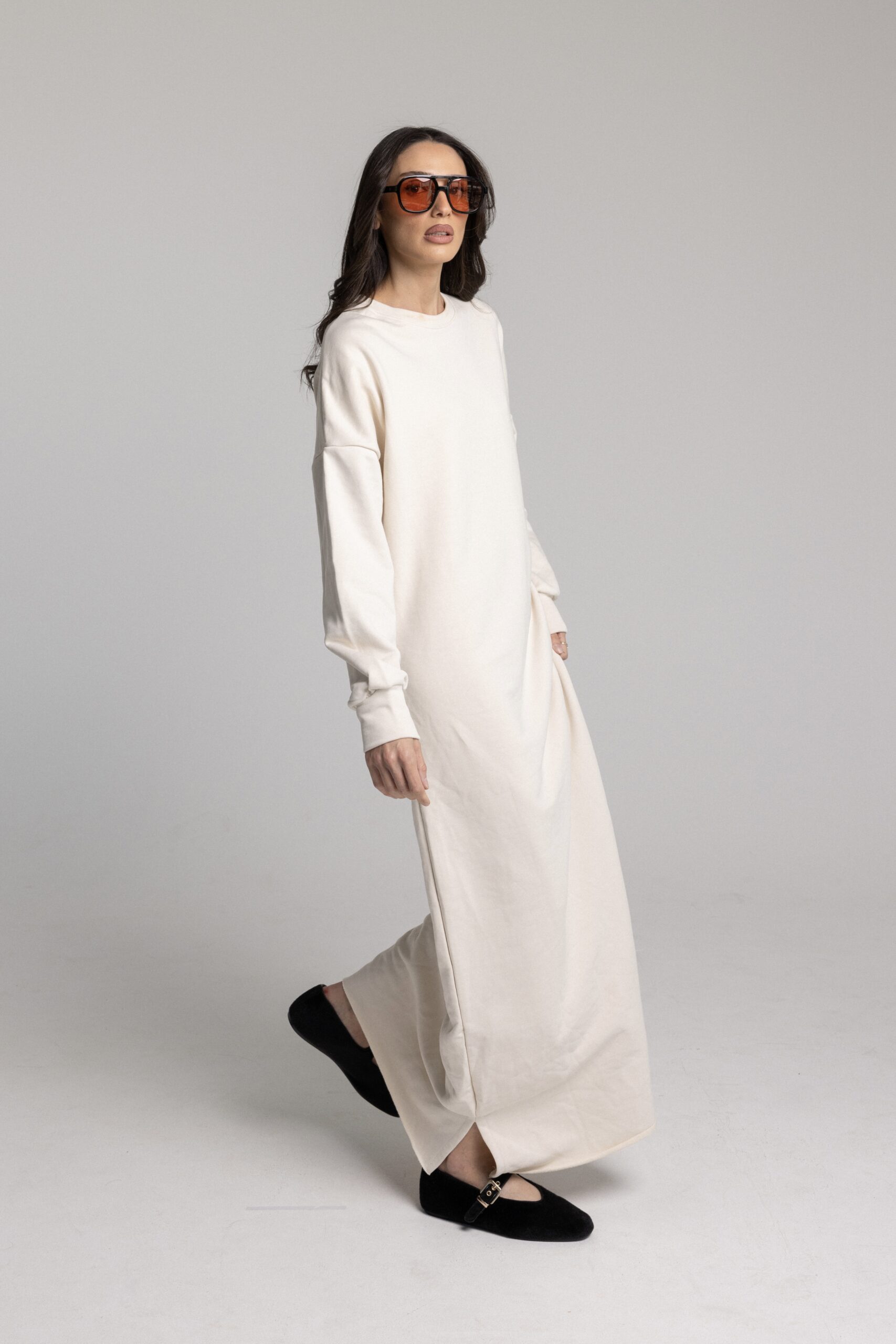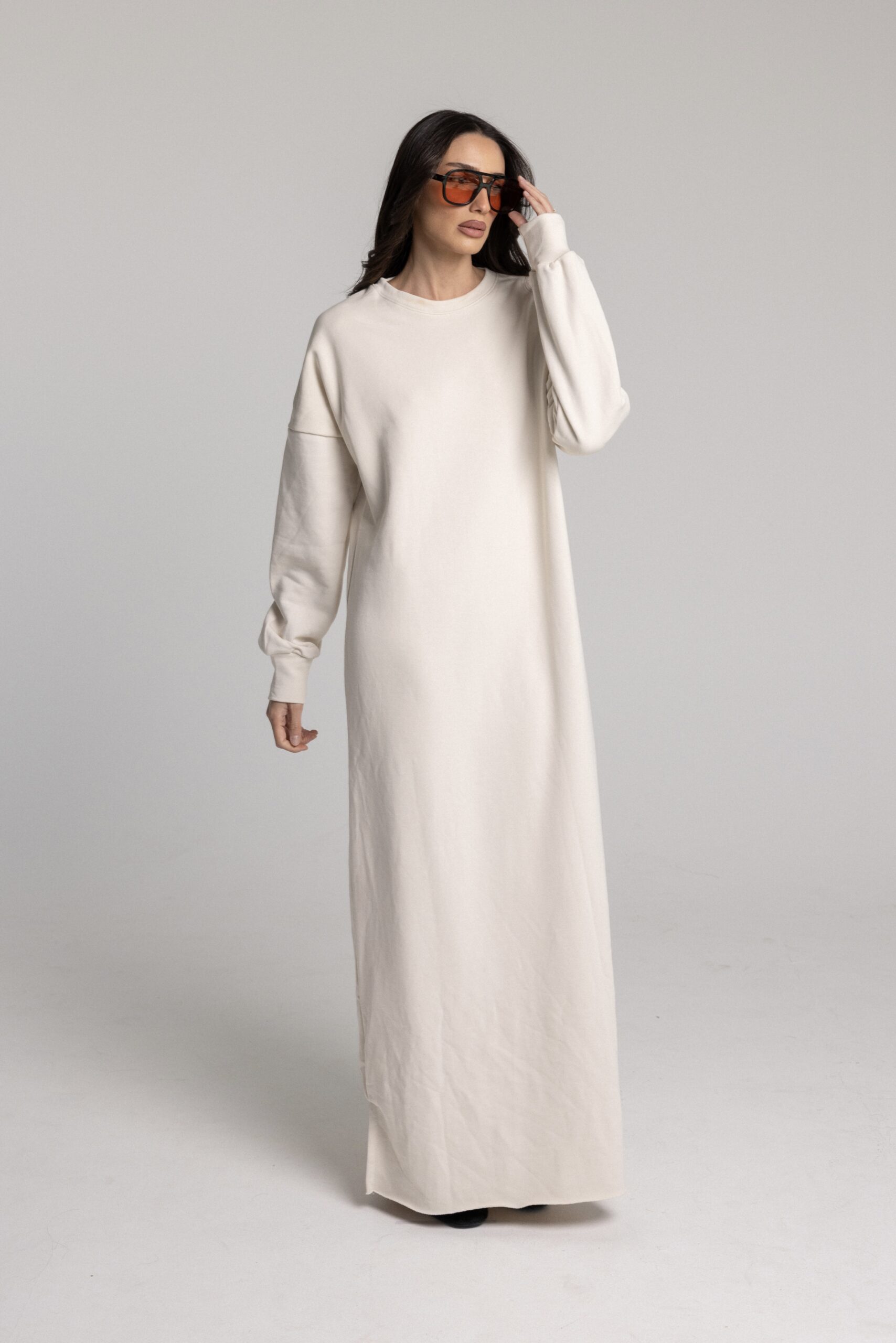 שמלה ארוכה מבד פרנד צטרי בגזרת אובר סייז, שרוולים ארוכים ושני שסעים קטנים בצידי השמלה.