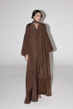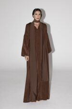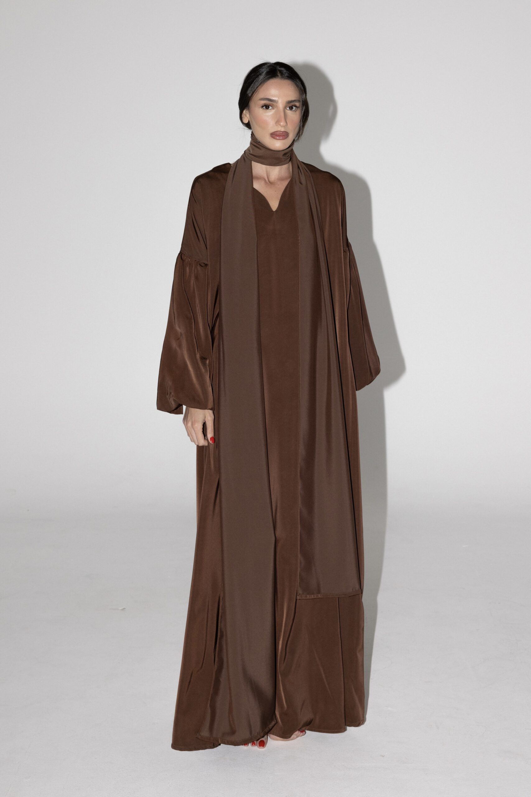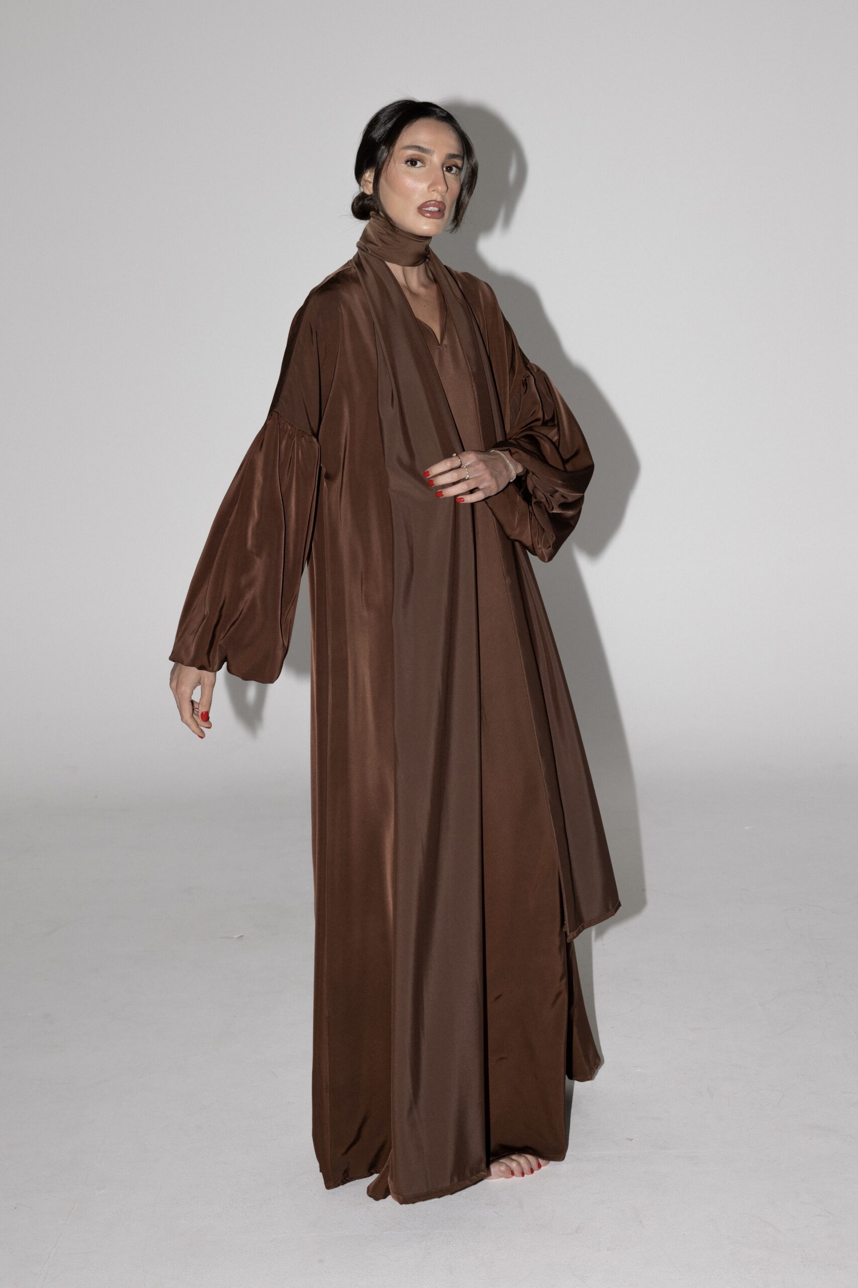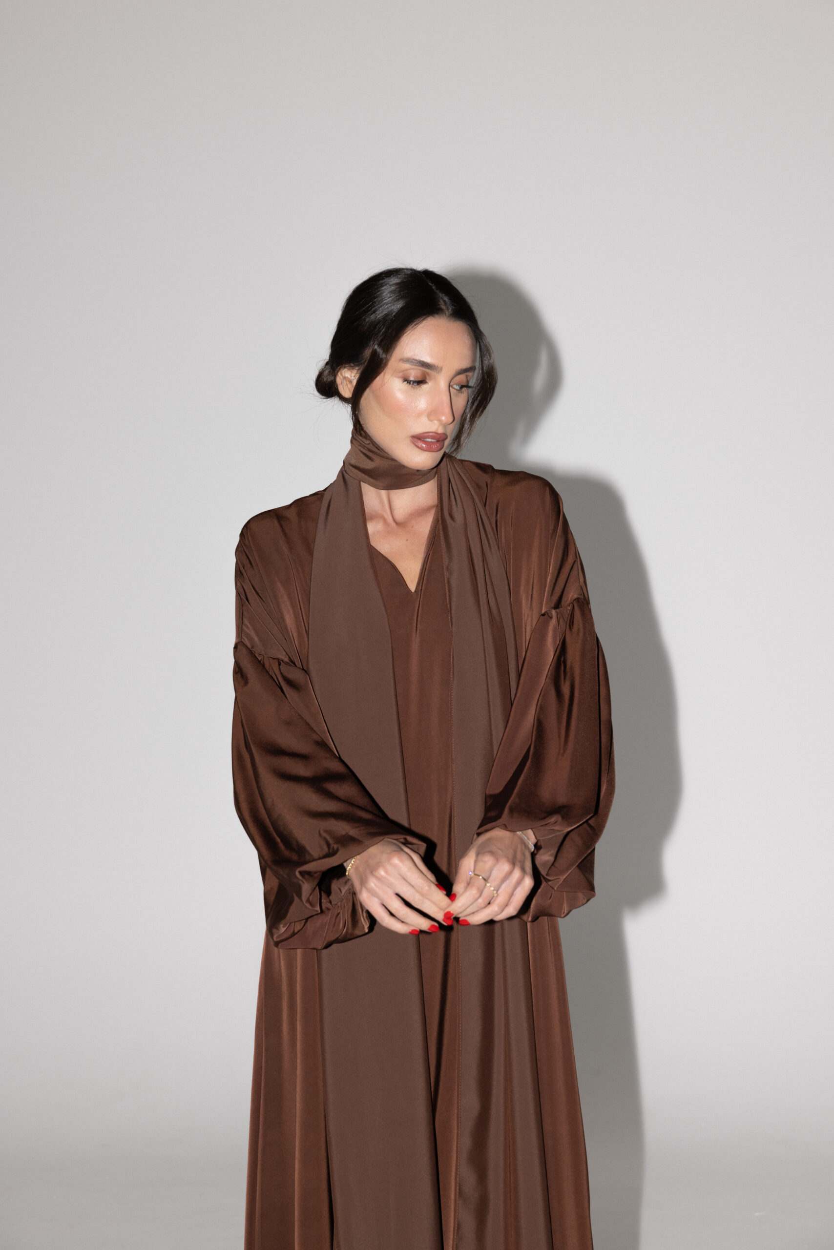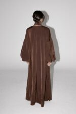שמלת גלביה מבד סאטן באורך מקסי בגזרת אובר סייז, מפתח קדמי וצעיף נפרד שמאפשר קשירה במותן, קשירה על הצוואר וכו.
