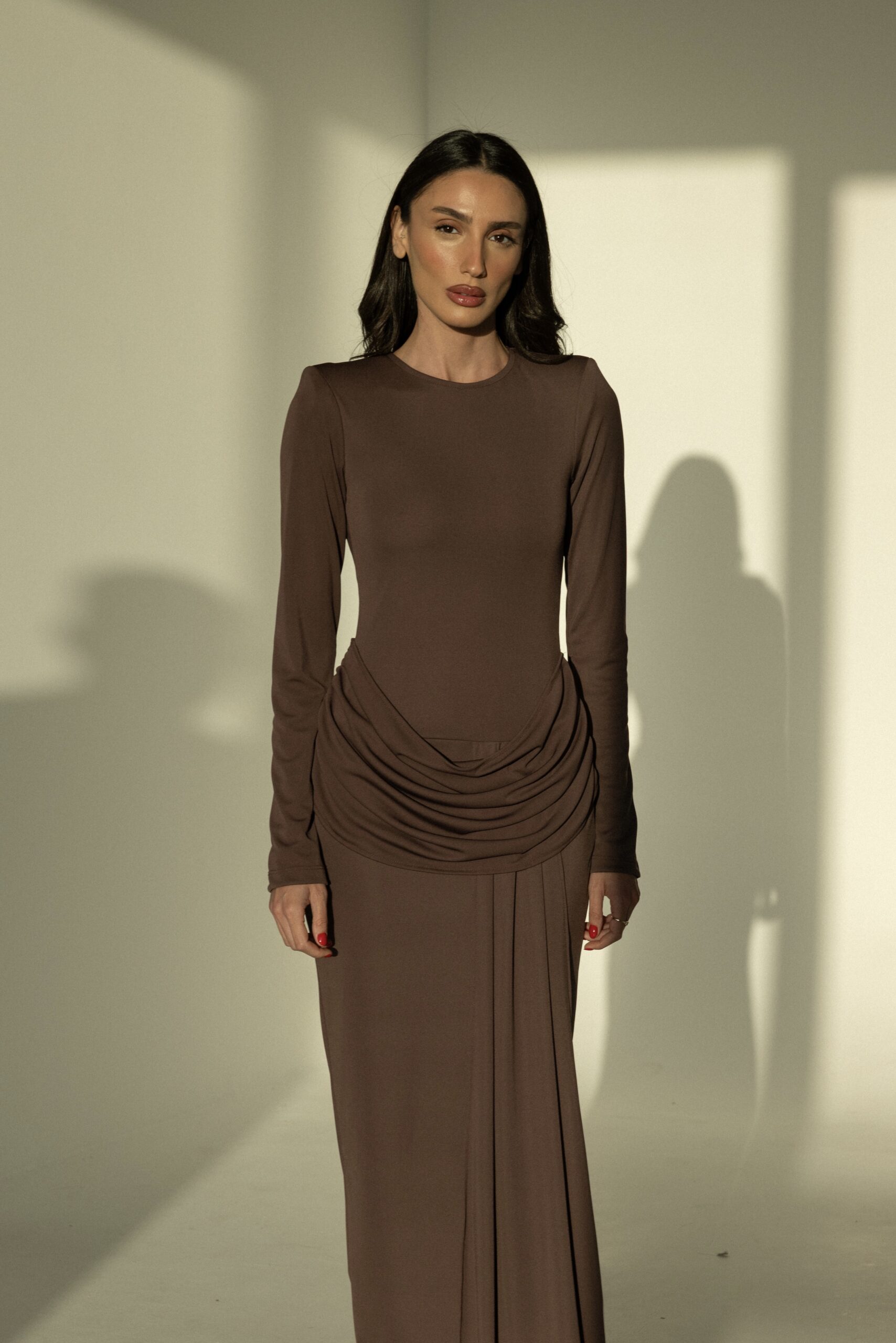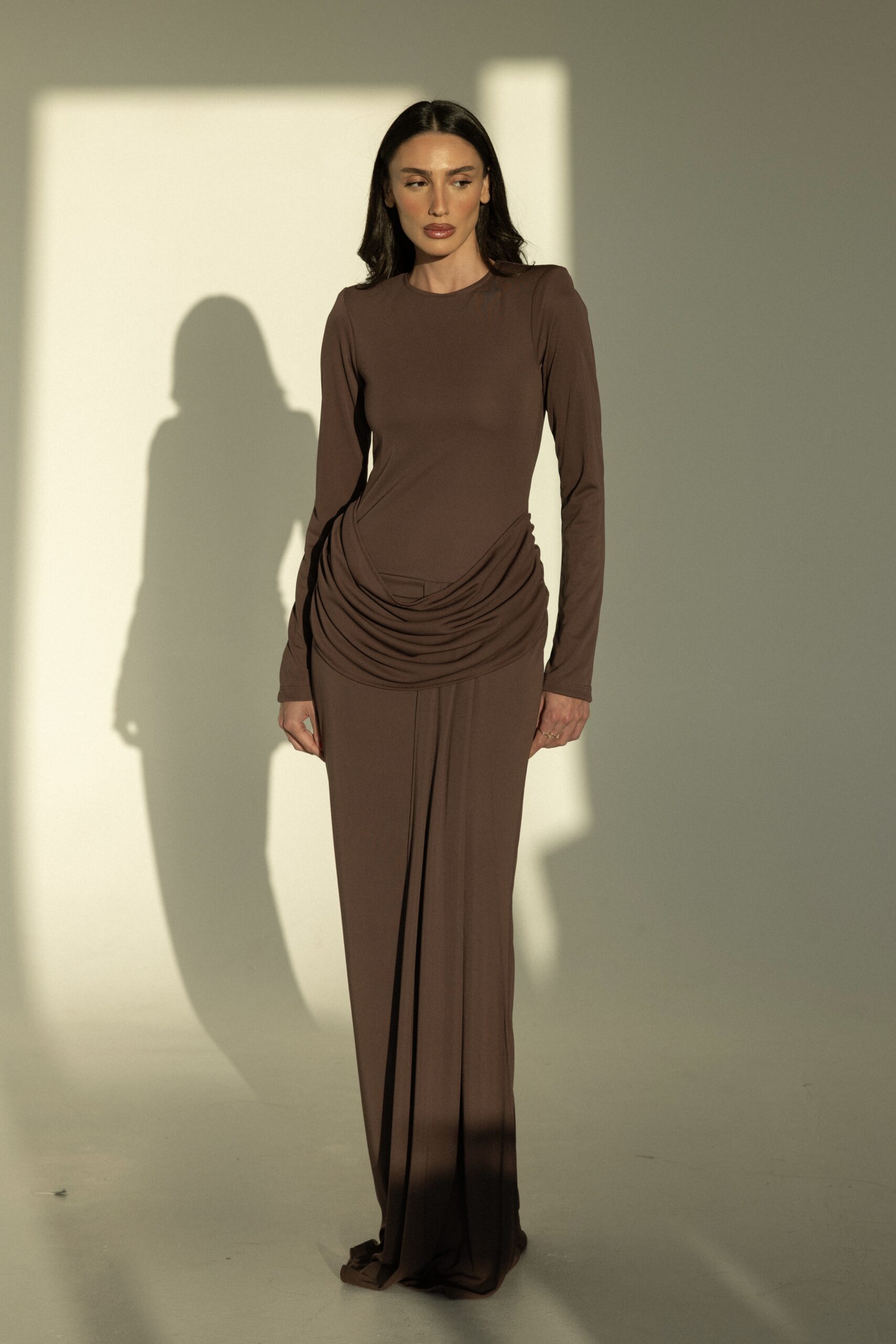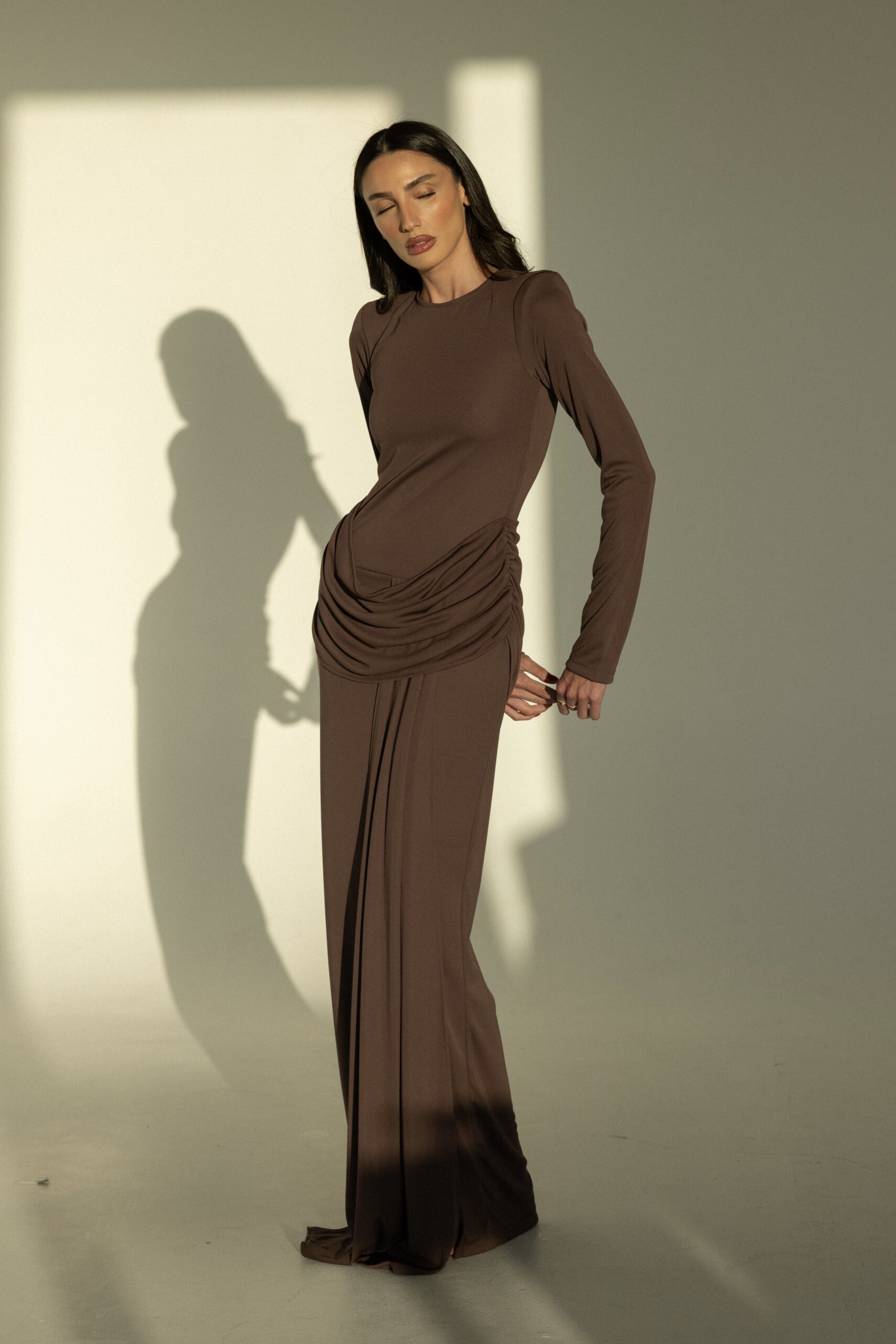 שמלת ערב ארוכה, בעלת גזרה צמודה ושרוולים ארוכים, עם כיווצים מחמיאים במותן למראה אלגנטי ומעודן. מידת הבגד עם הדוגמנית 0.