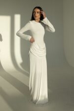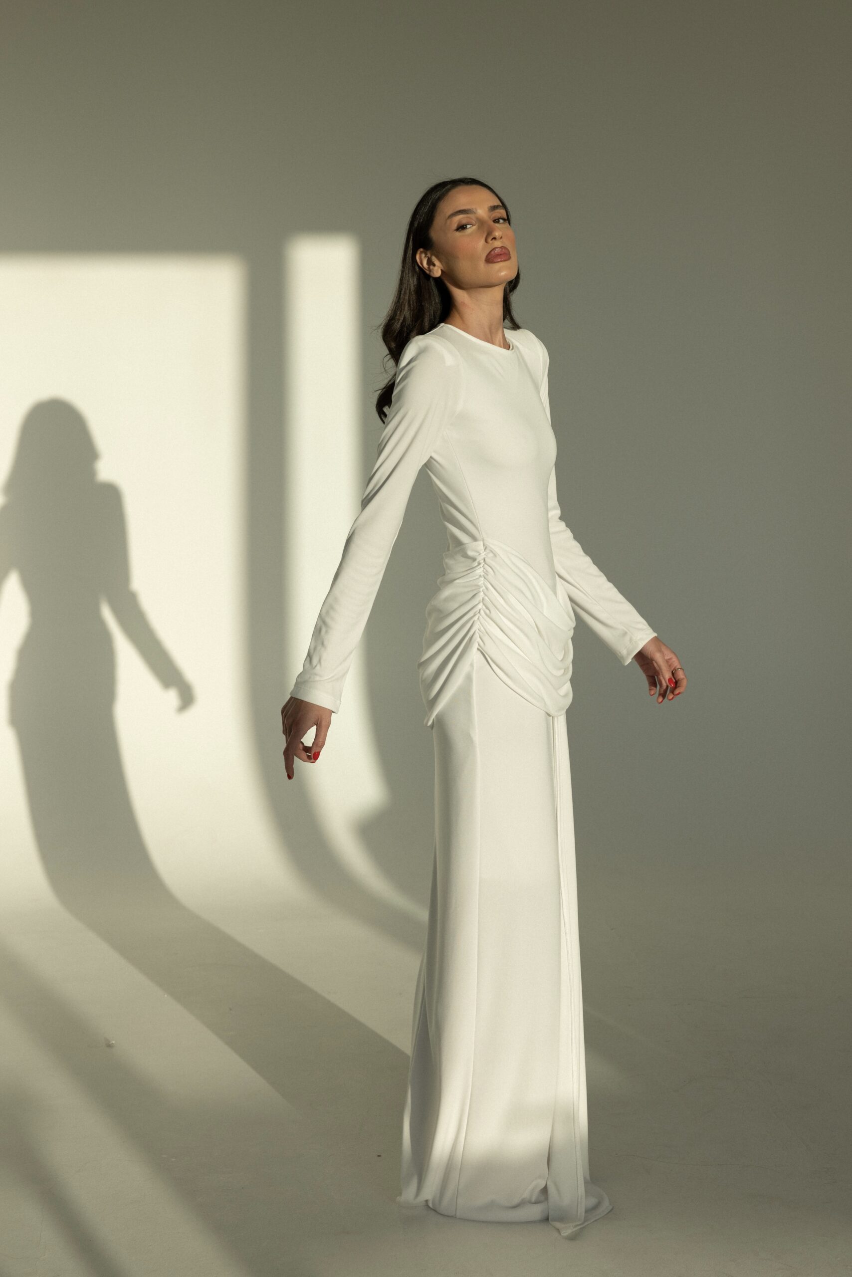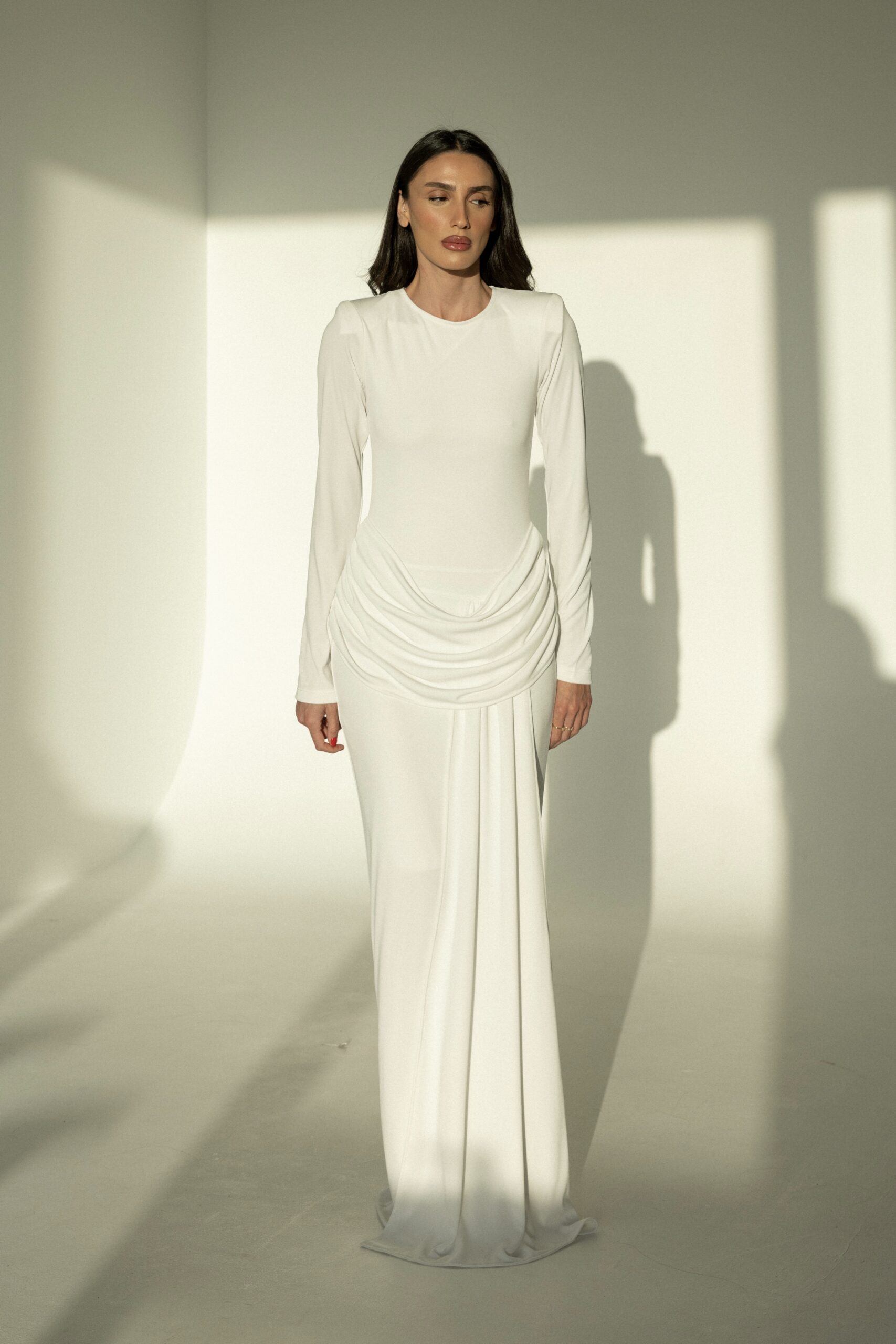 שמלת ערב ארוכה, בעלת גזרה צמודה ושרוולים ארוכים, עם כיווצים מחמיאים במותן למראה אלגנטי ומעודן. מידת הבגד עם הדוגמנית 0.