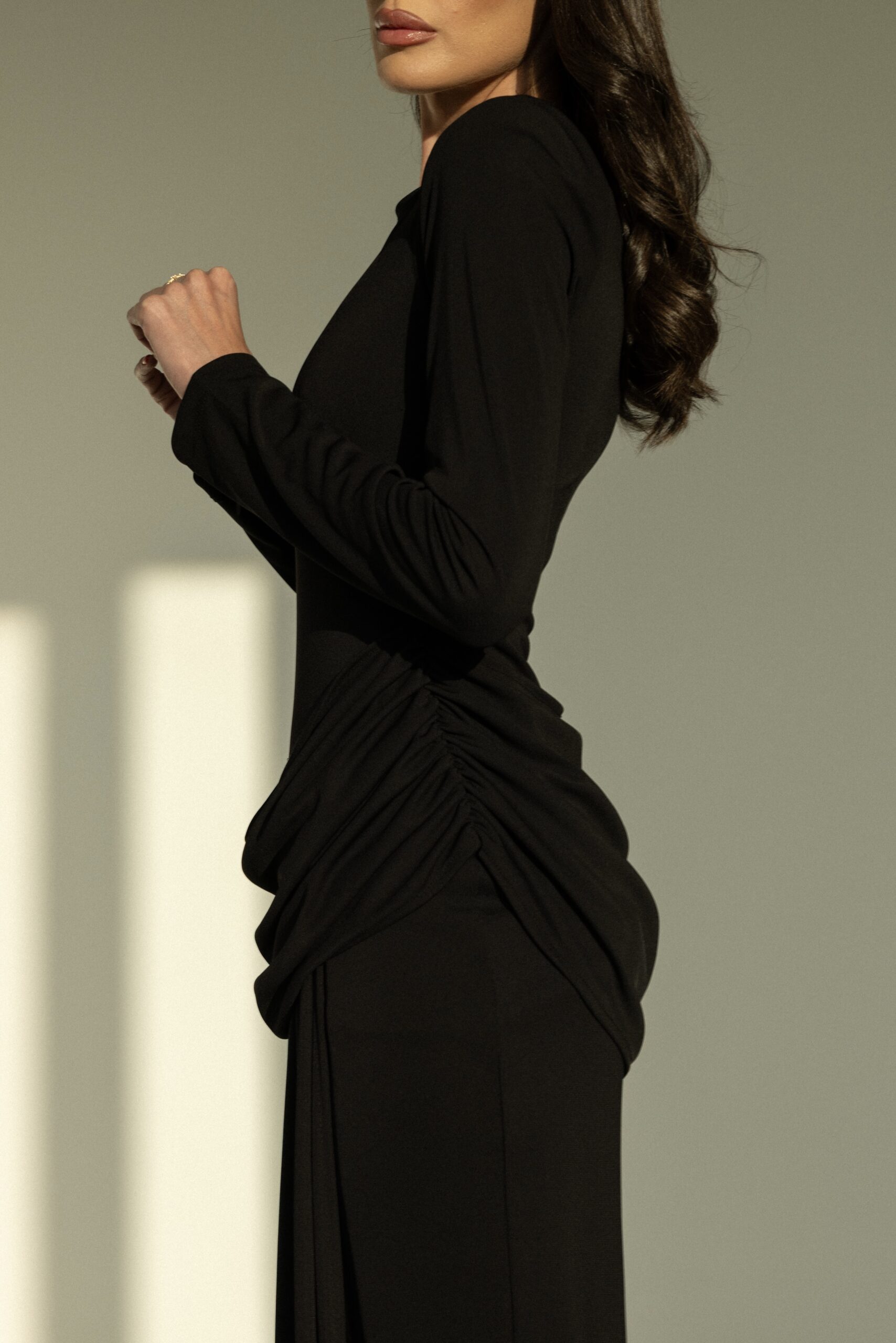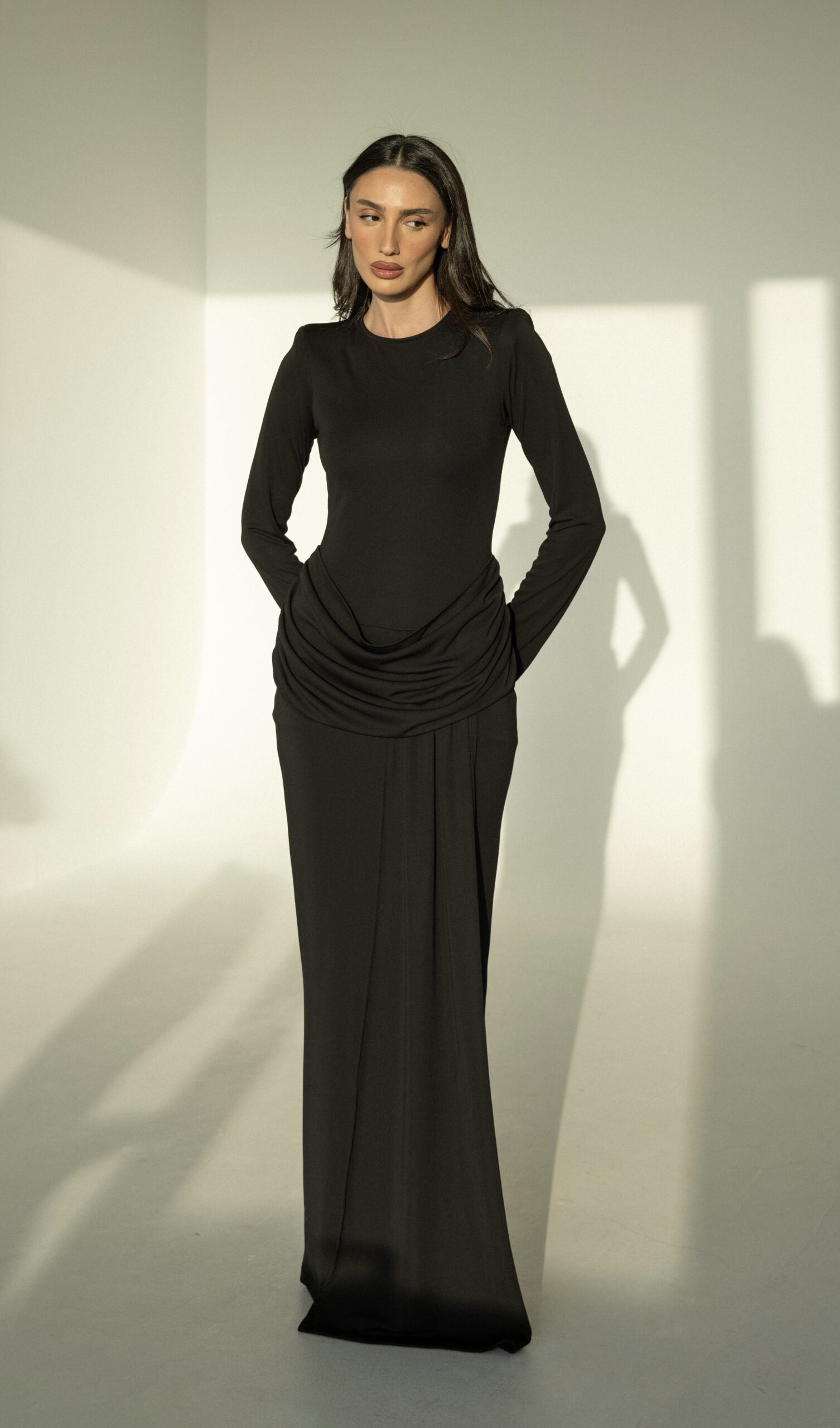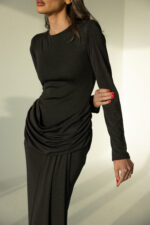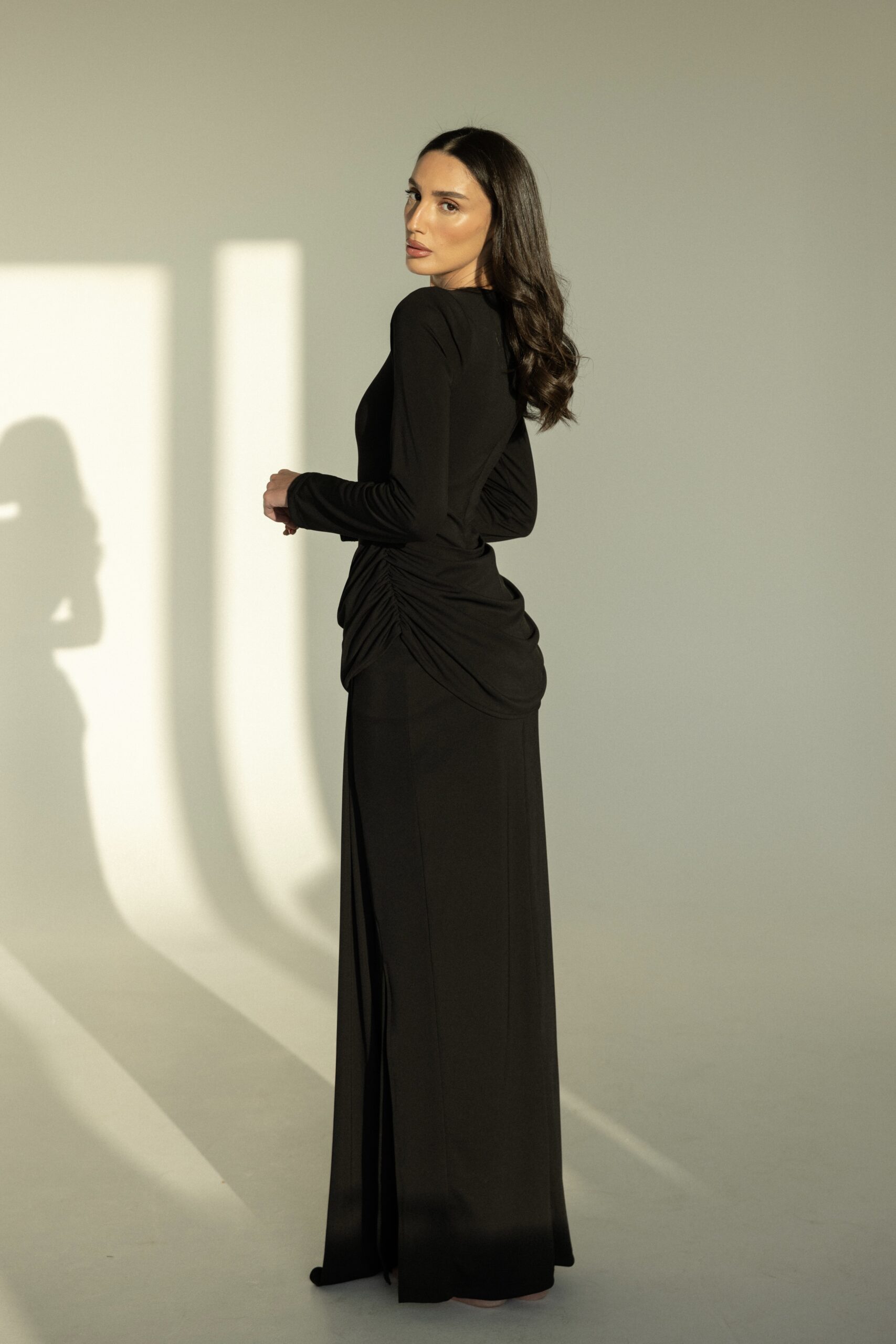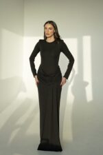 שמלת ערב ארוכה, בעלת גזרה צמודה ושרוולים ארוכים, עם כיווצים מחמיאים במותן למראה אלגנטי ומעודן. מידת הבגד עם הדוגמנית 0.