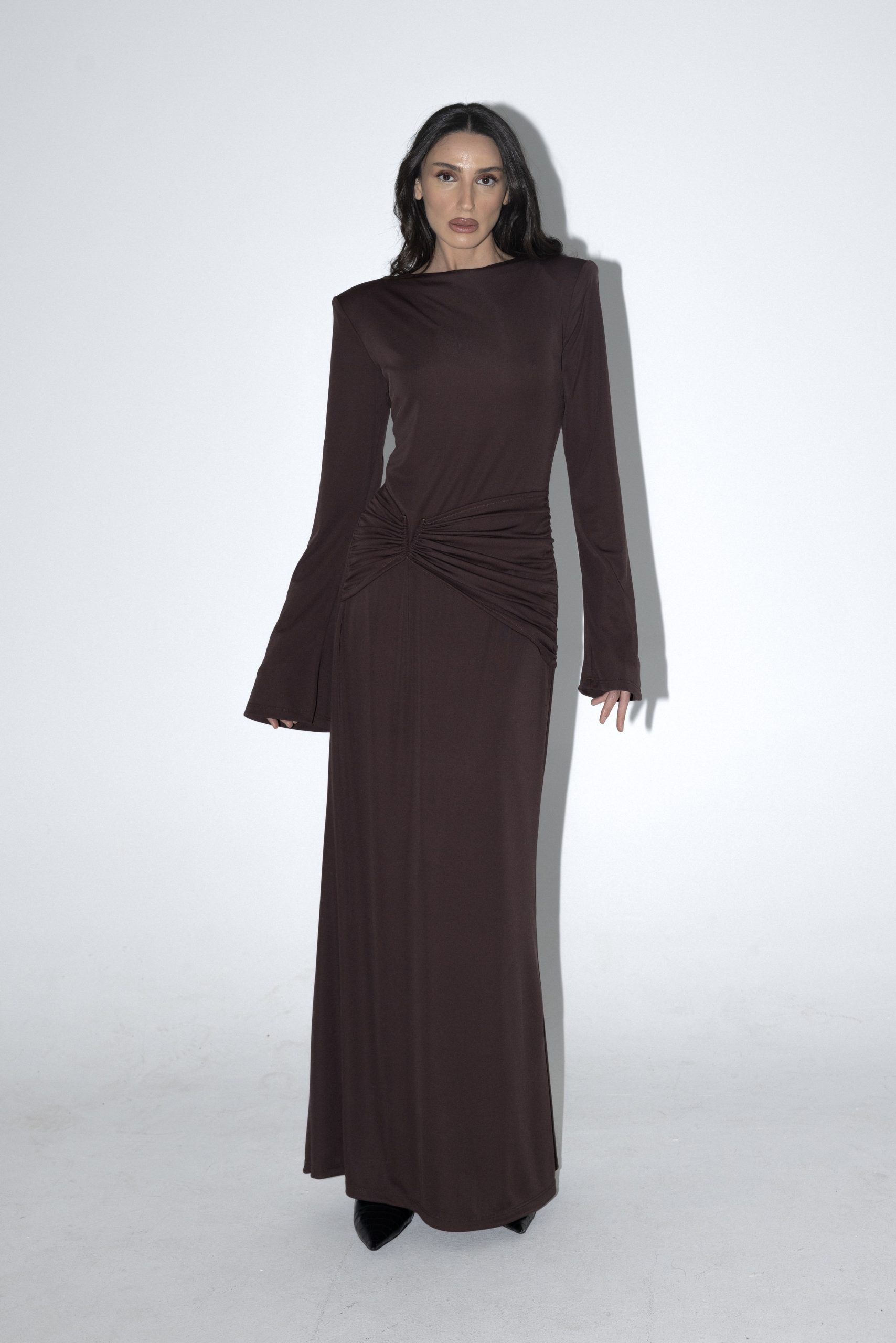 שמלת ערב באורך מקסי בגזרה צמודה עם עודף בד באזור המותן למראה צר וקלאסי.