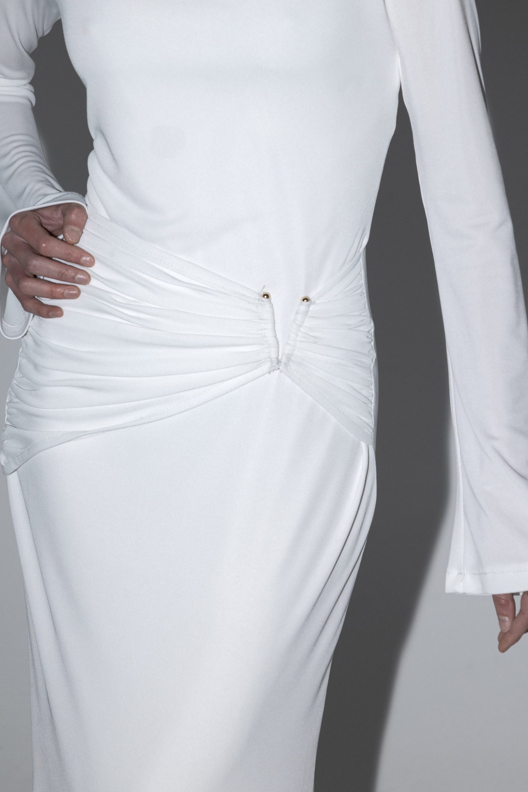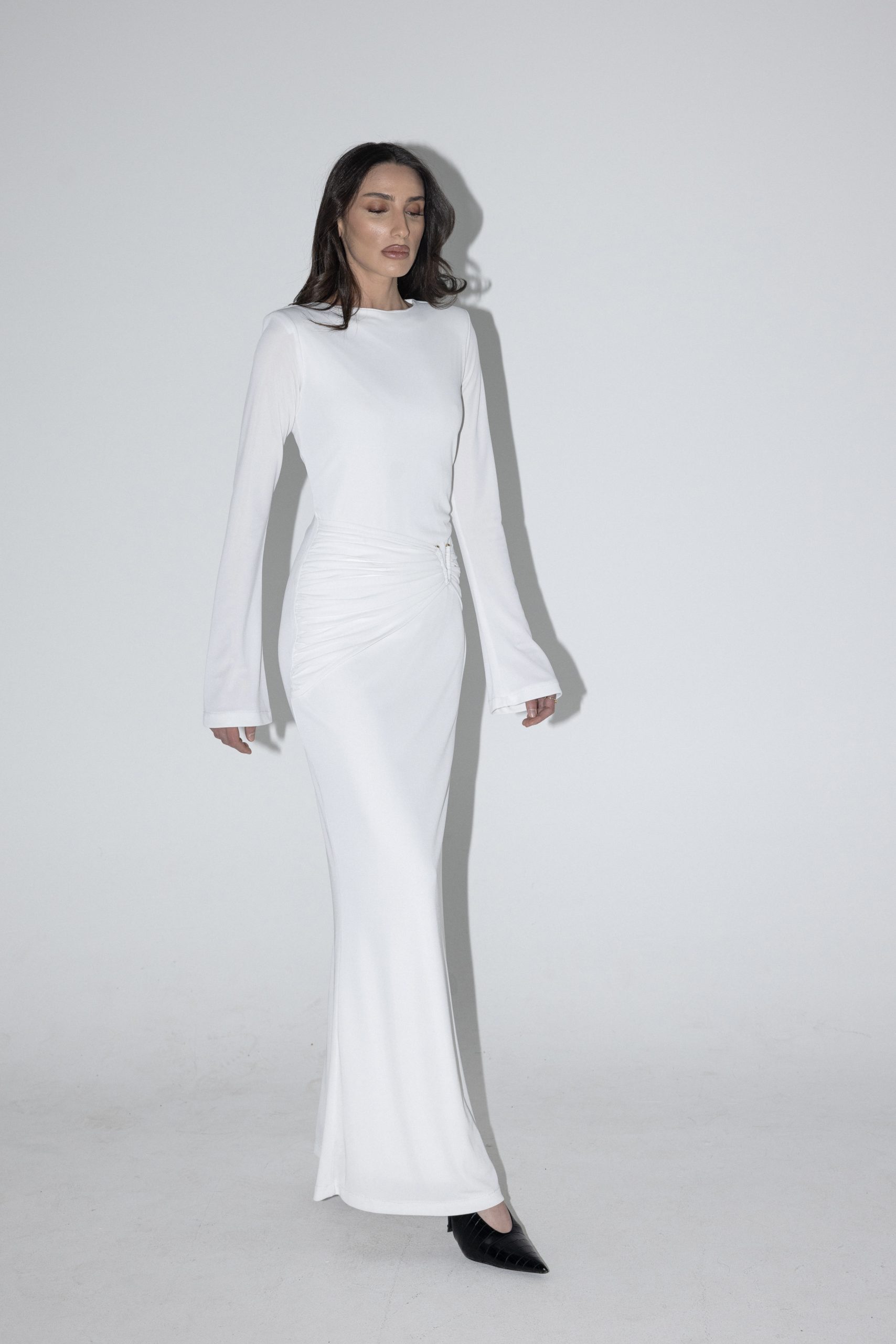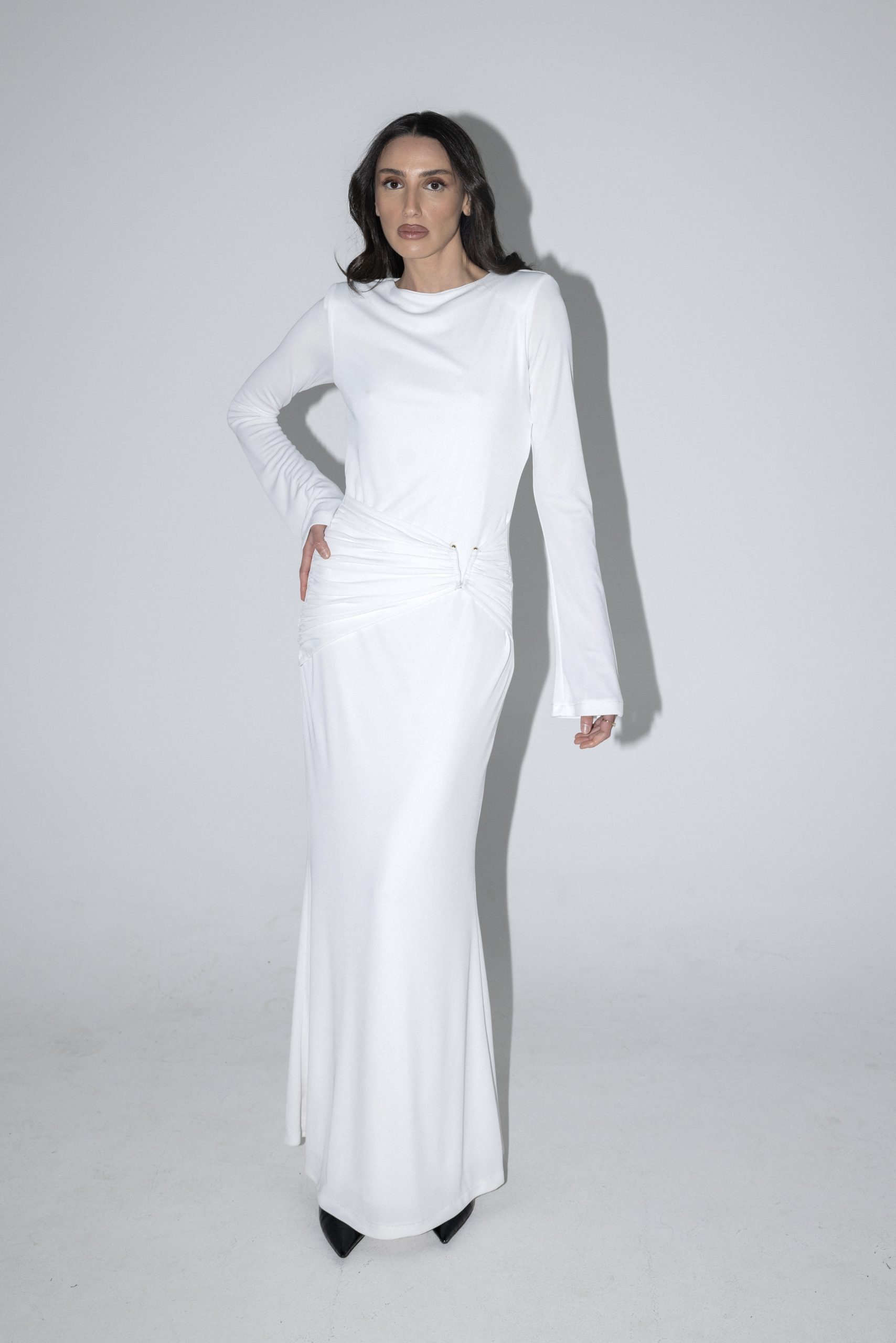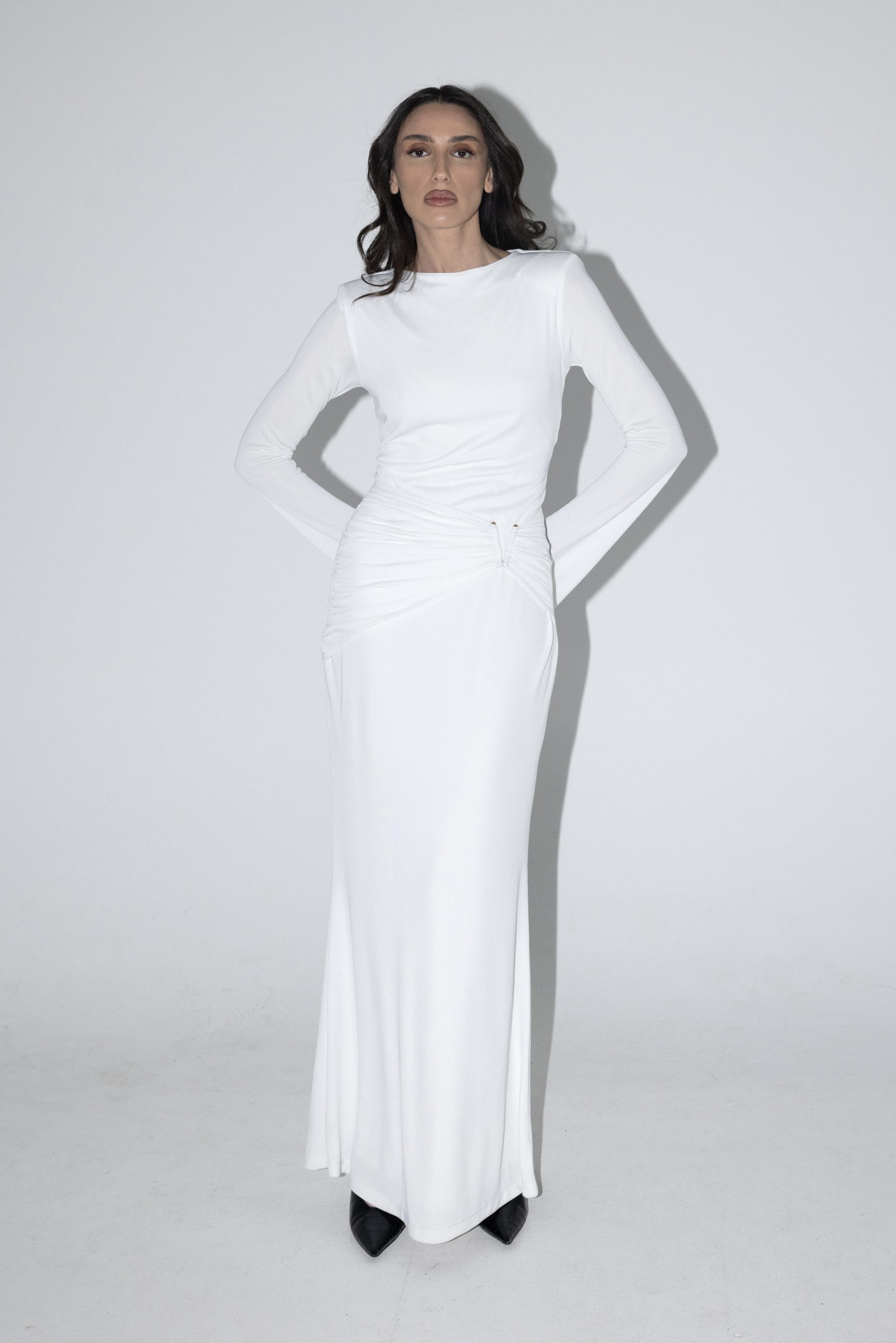 שמלת ערב באורך מקסי בגזרה צמודה עם עודף בד באזור המותן למראה צר וקלאסי.