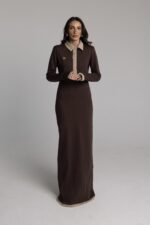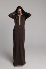 שמלת מקסי בגזרה צמודה עם שרוולים ארוכים וכפפה ביד, כריות בכתפיים ושסע אחורי. מידת הבגד על הדוגמנית 0.