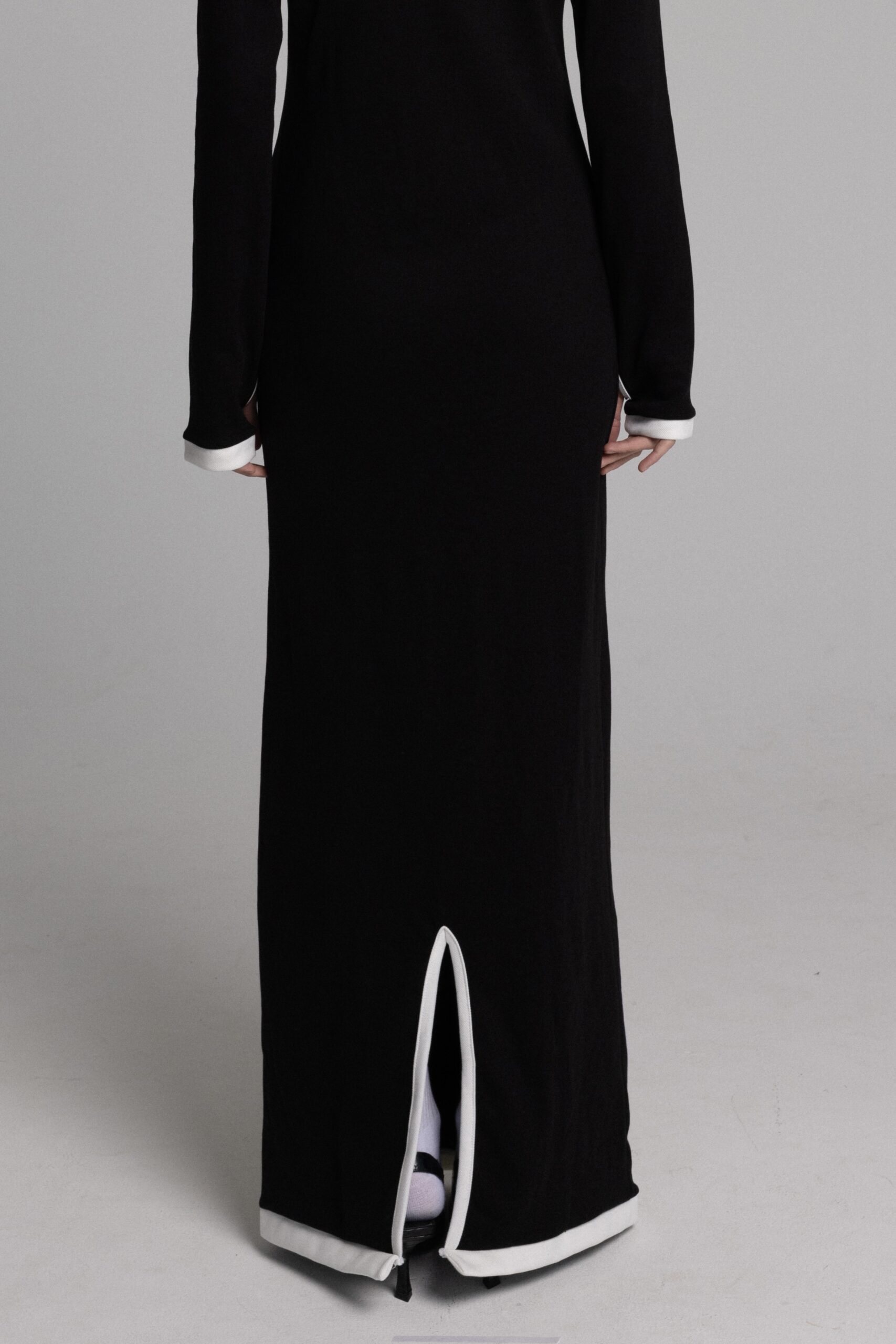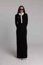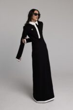 שמלת מקסי בגזרה צמודה עם שרוולים ארוכים וכפפה ביד, כריות בכתפיים ושסע אחורי. מידת הבגד על הדוגמנית 0.