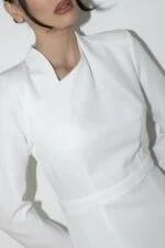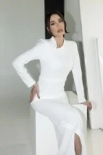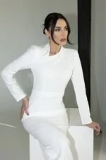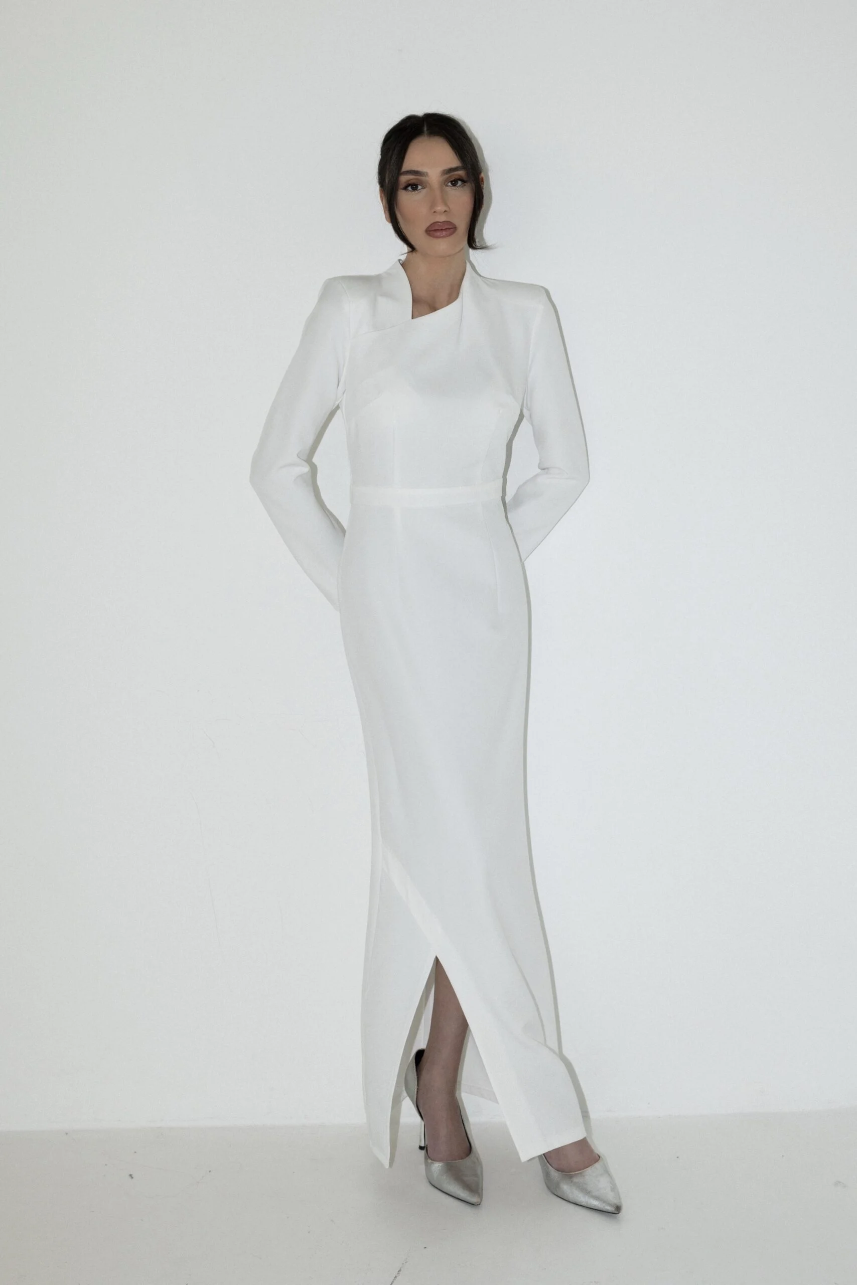 שמלת ערב בגזרה צמודה, עם צווארון א סימטרי, שרוולים ארוכים ושסע צידי.