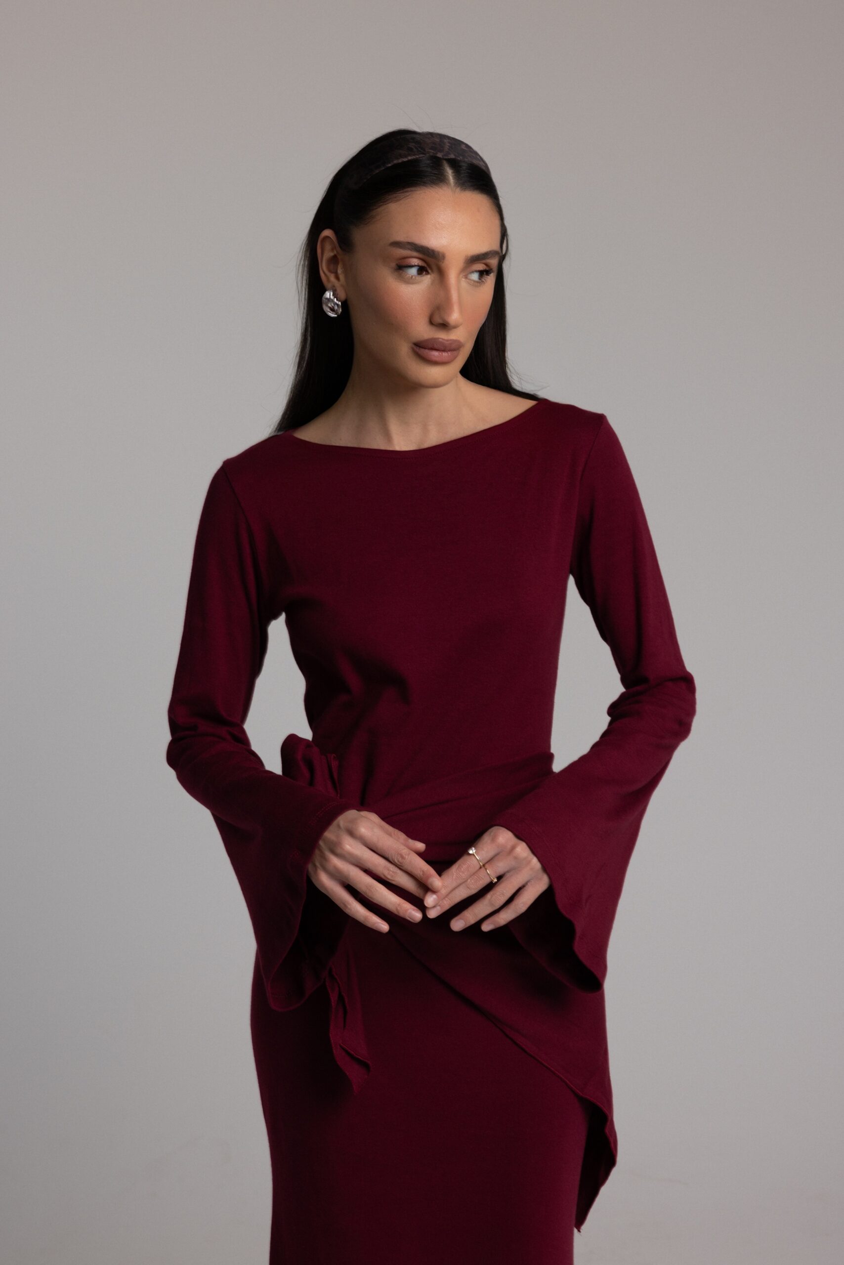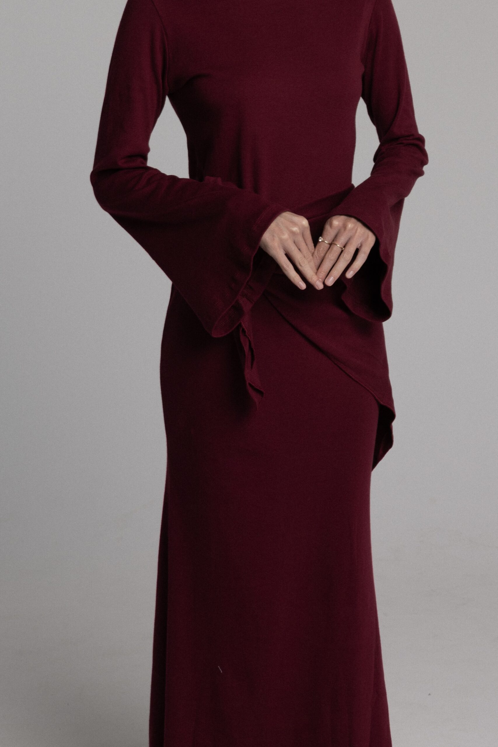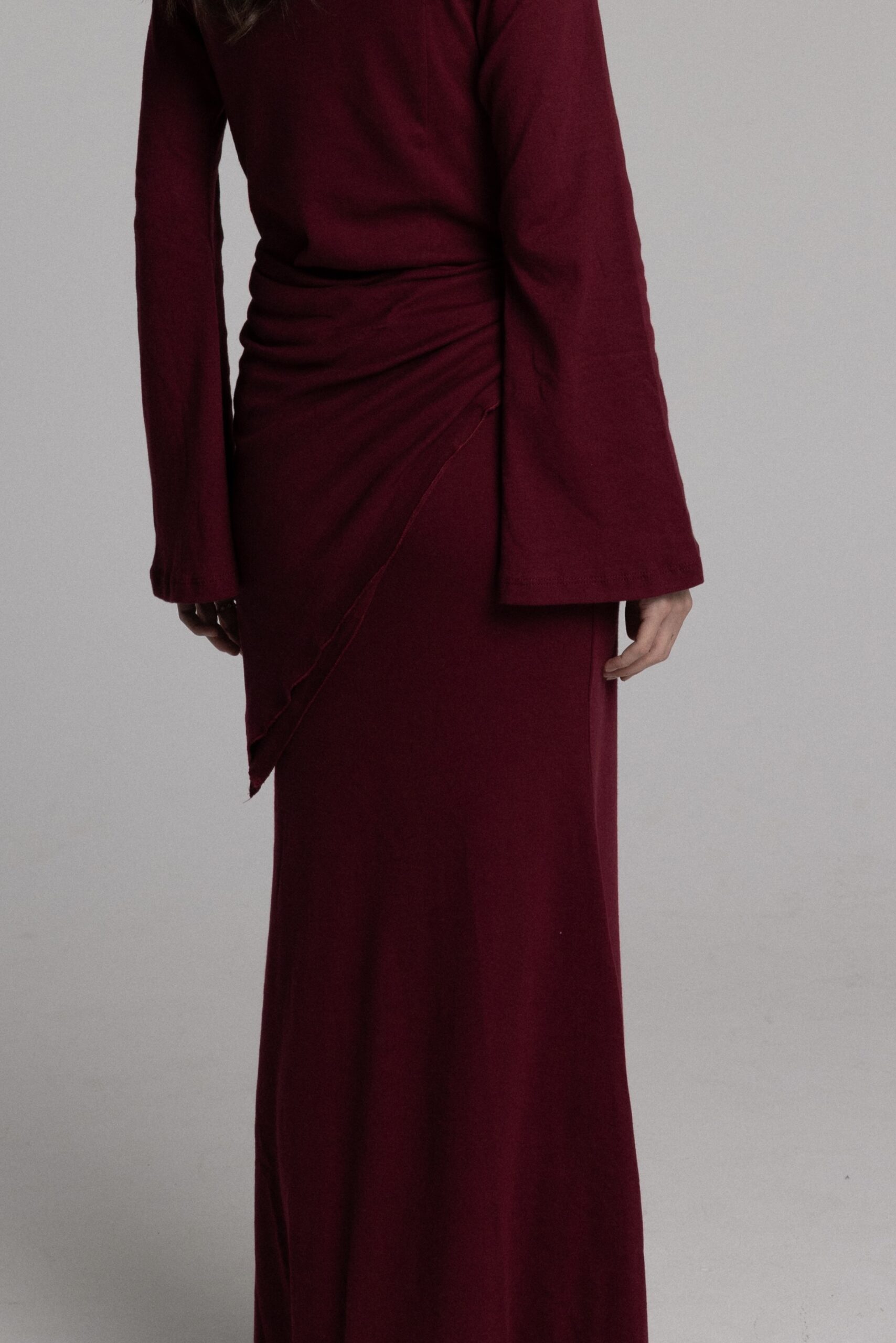 שמלת מקסי עם כיסוי ראש תואם גזרה צמודה ומחמיאה, שרוולים מתרחבים בטוויסט אלגנטי, וכיסוי ראש בגוון תואם להשלמת הלוק. מידת הבגד על הדוגמנית 0.