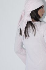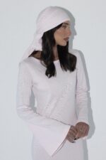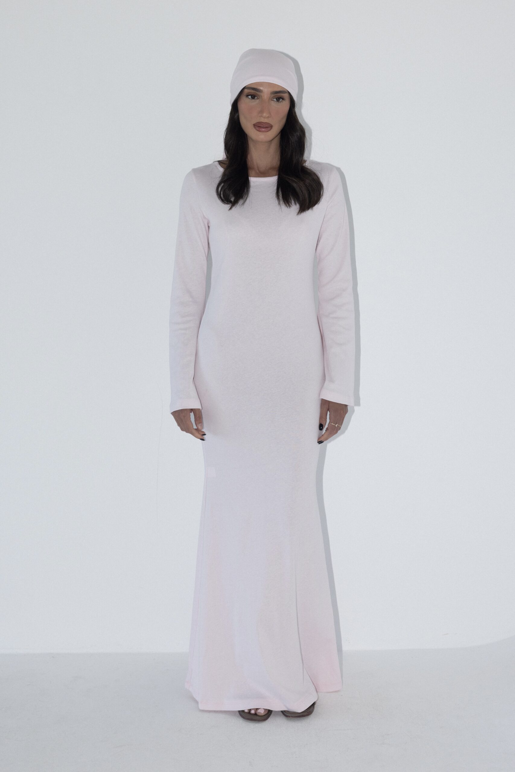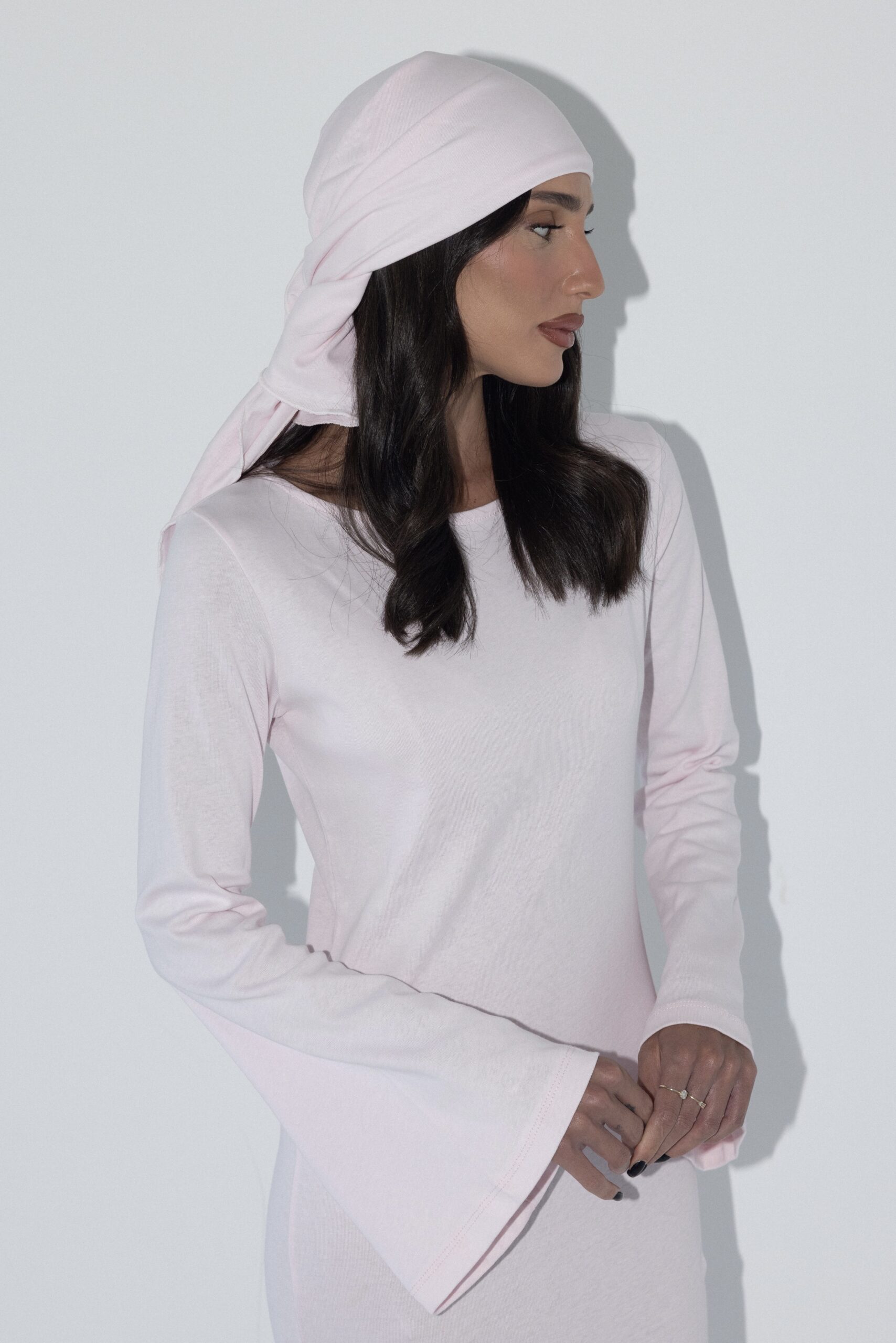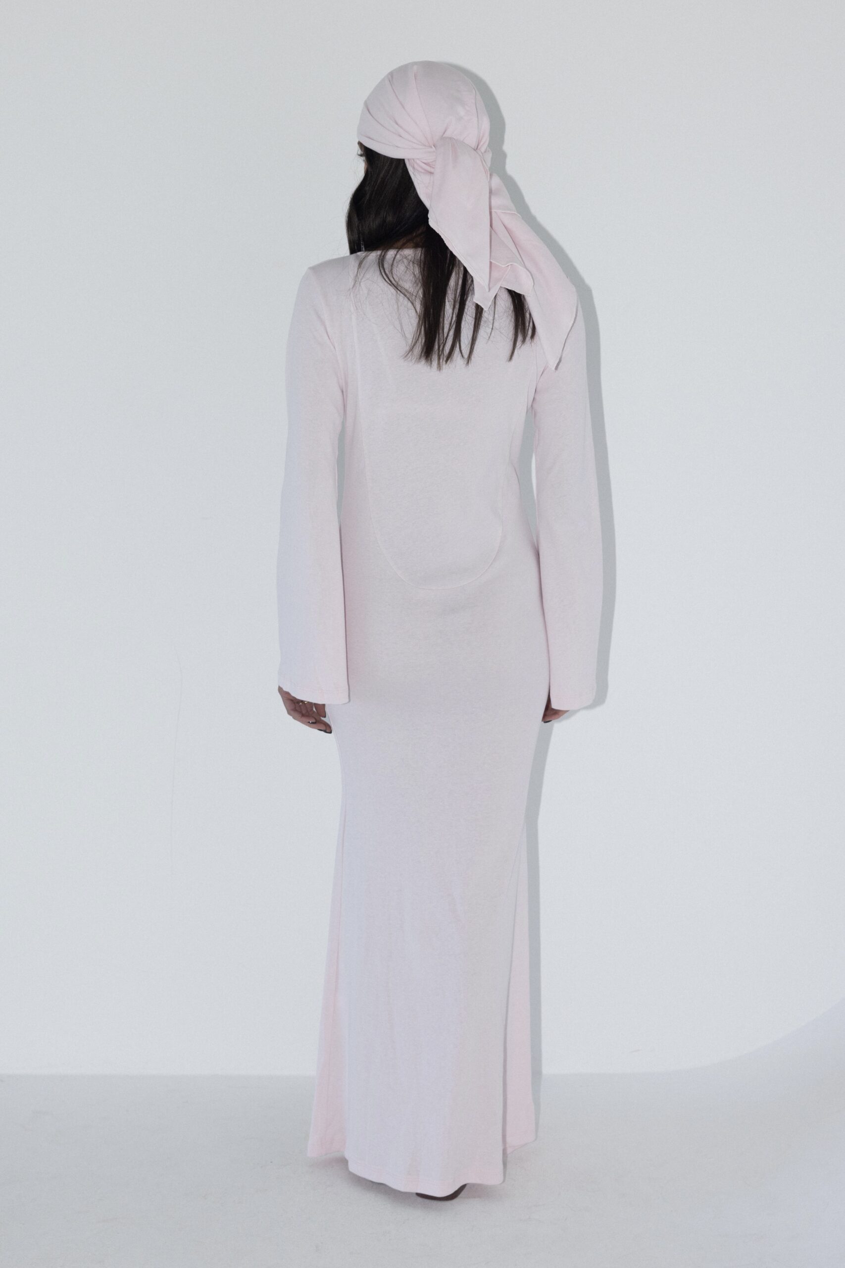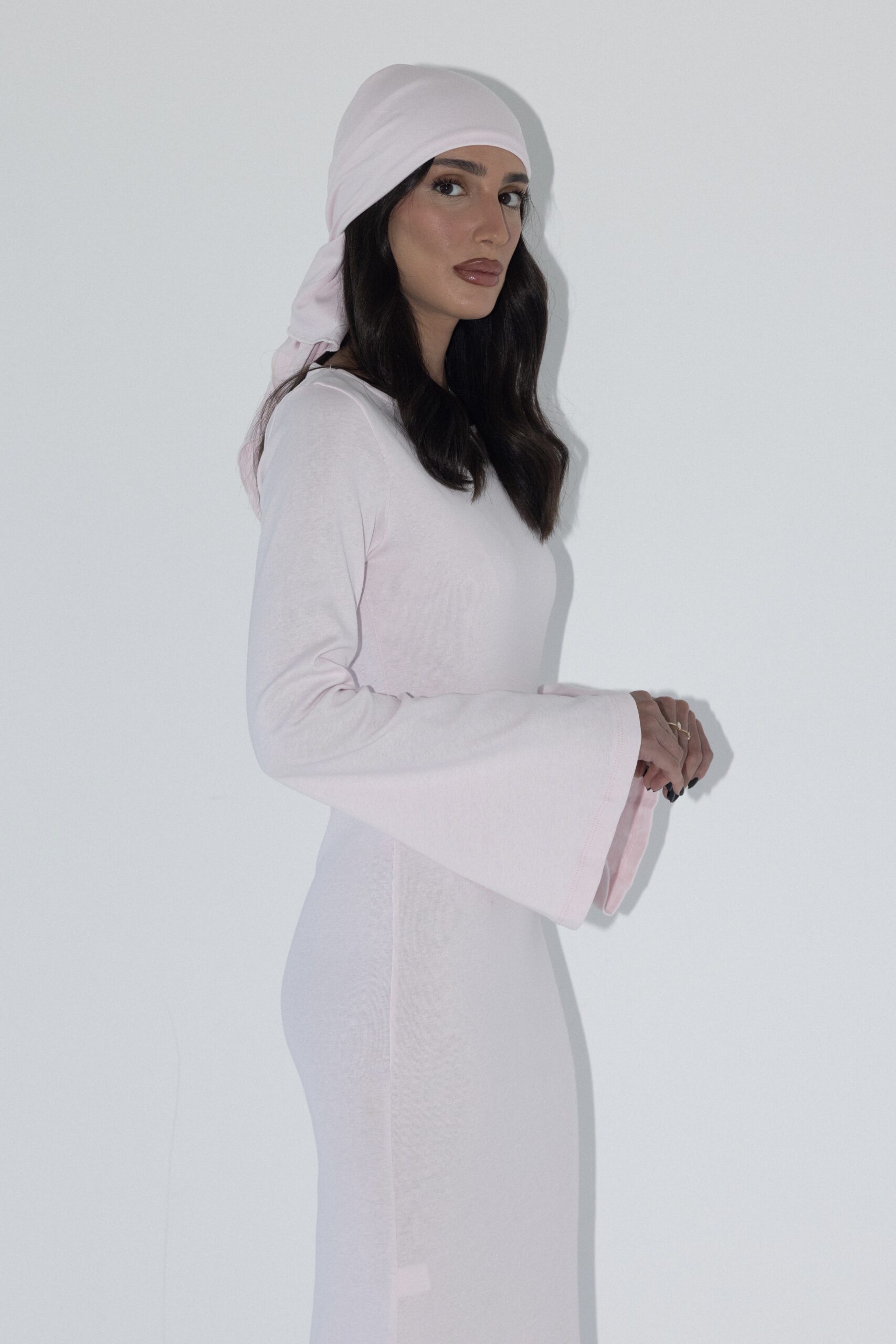 שמלת מקסי בצבע ורוג בייבי עם כיסוי ראש תואם גזרה צמודה ומחמיאה, שרוולים מתרחבים בטוויסט אלגנטי, וכיסוי ראש בגוון תואם להשלמת הלוק. מידת הבגד על הדוגמנית 0.