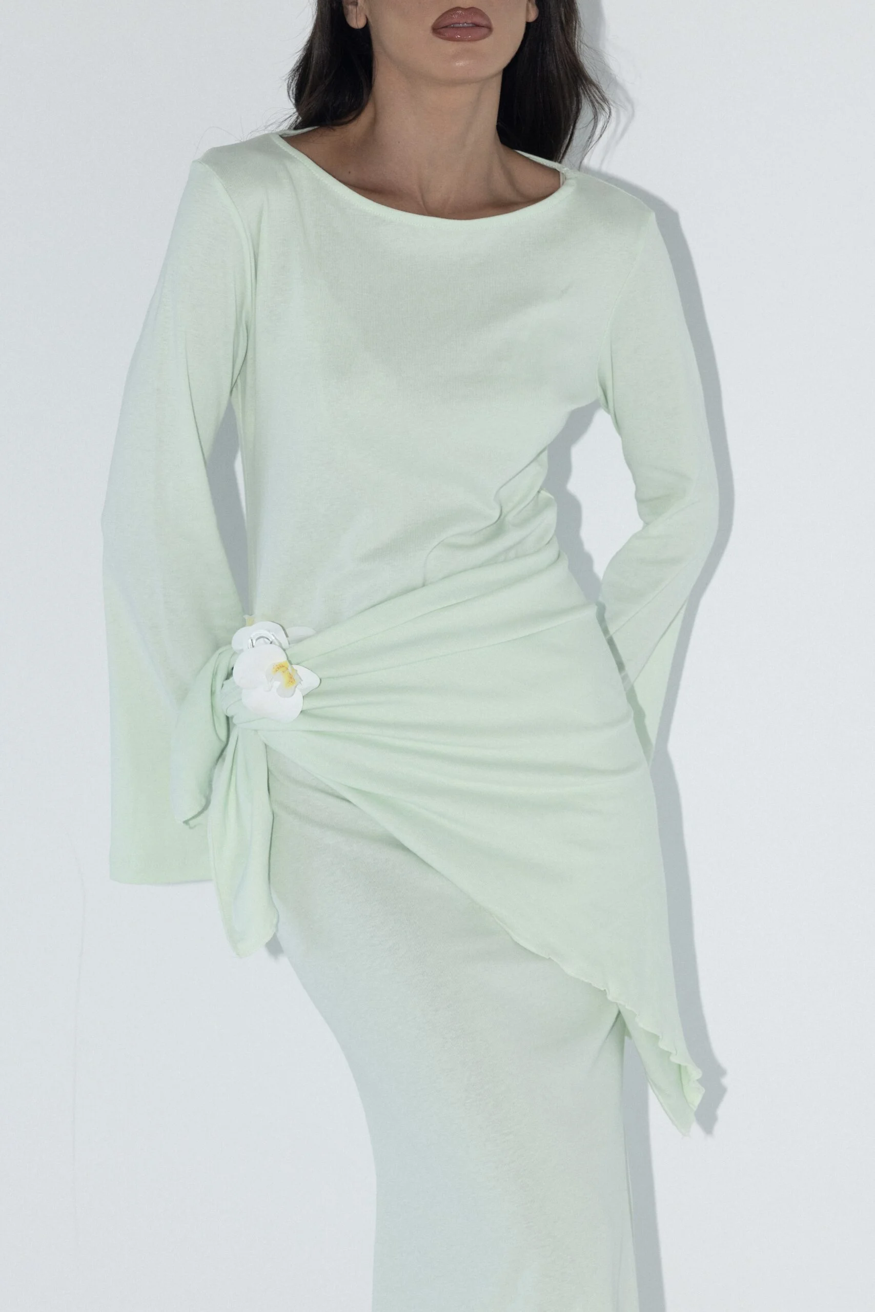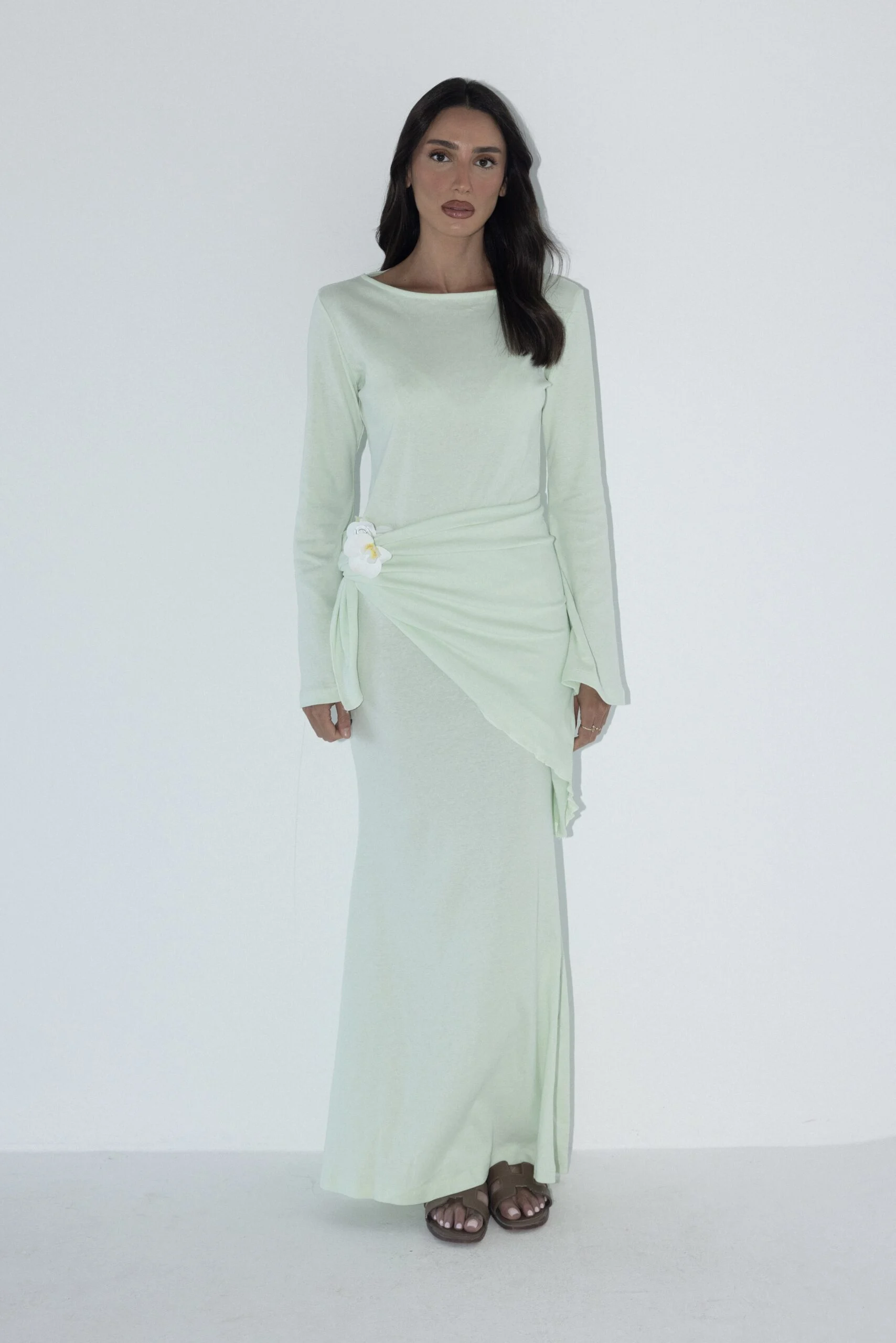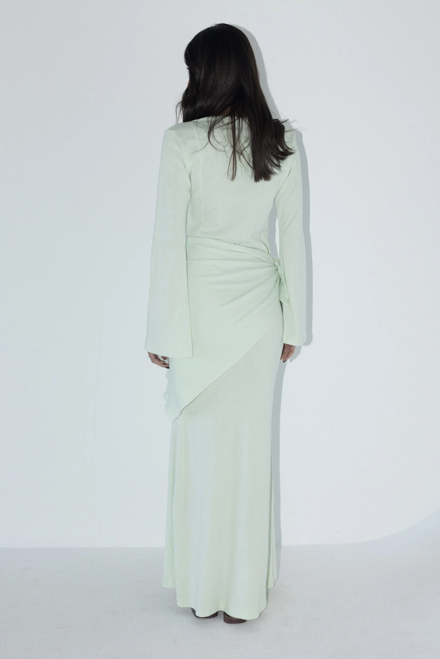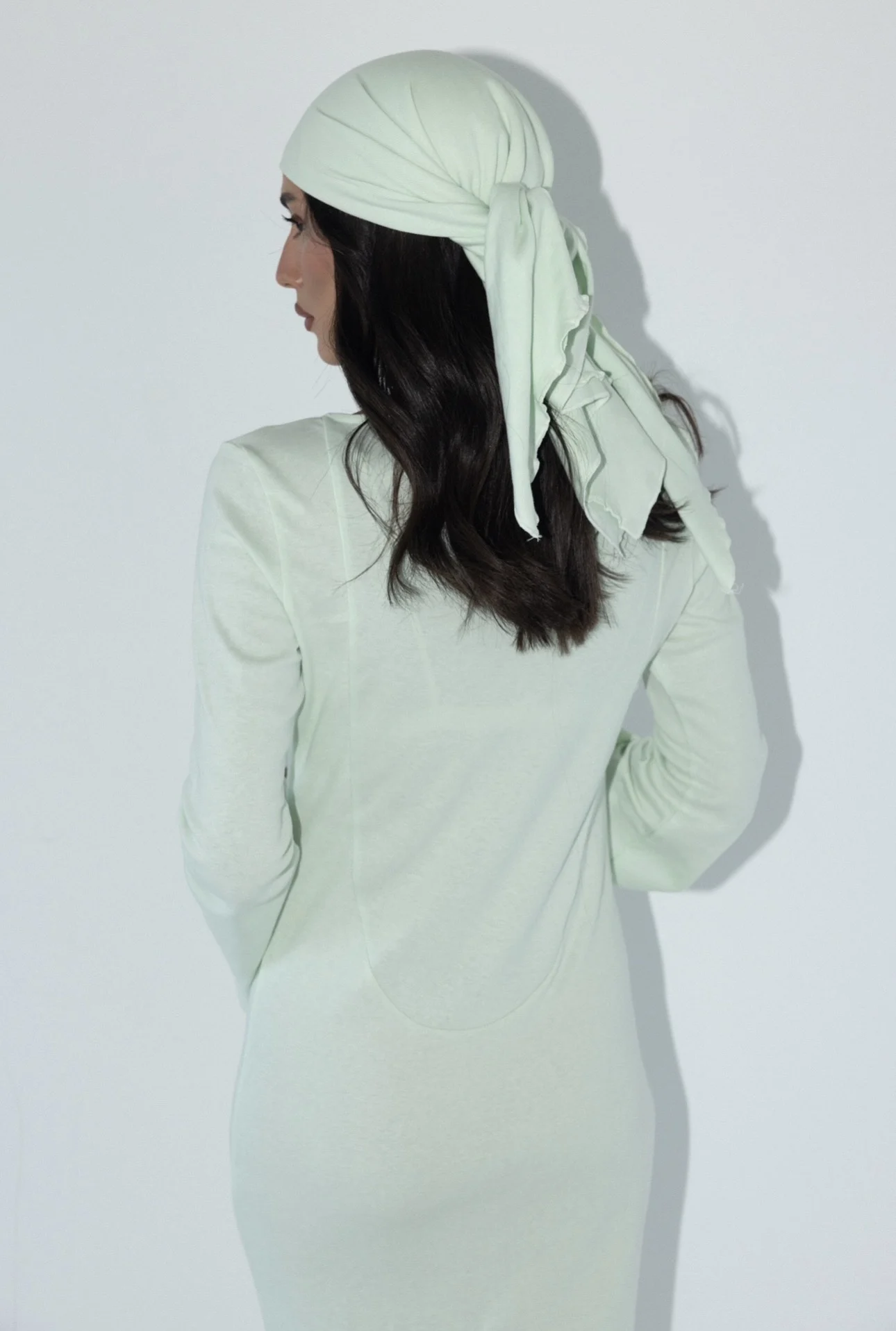 שמלת מקסי בצבע טורקיז עם כיסוי ראש תואם גזרה צמודה ומחמיאה, שרוולים מתרחבים בטוויסט אלגנטי, וכיסוי ראש בגוון תואם להשלמת הלוק. מידת הבגד על הדוגמנית 0.
