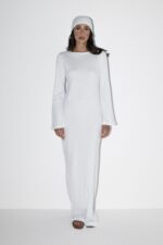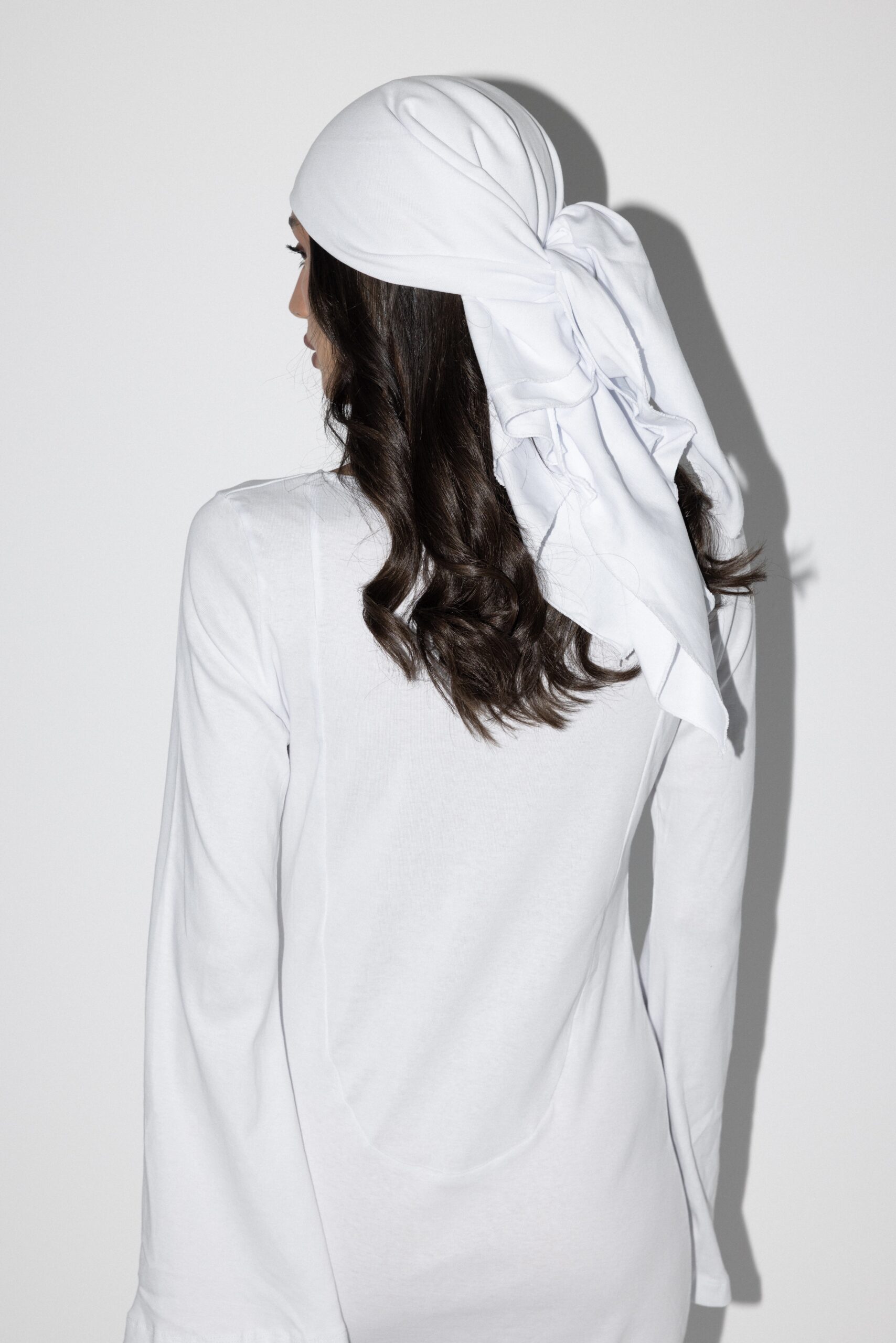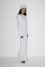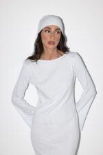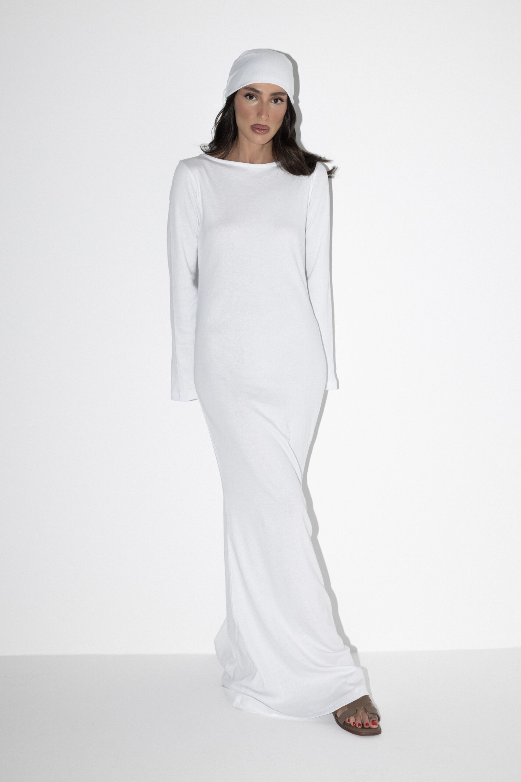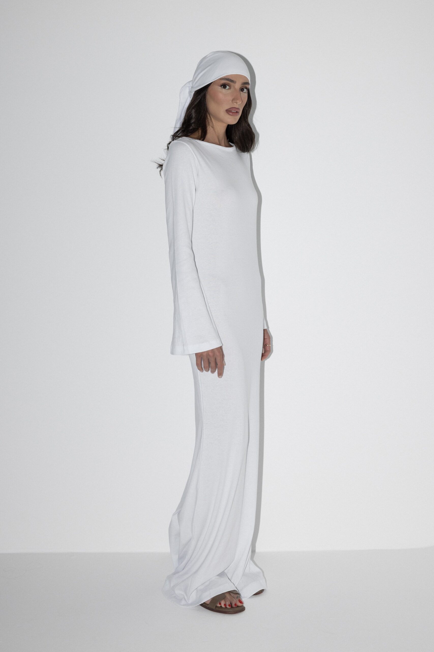 שמלת מקסי בצבע לבן עם כיסוי ראש תואם גזרה צמודה ומחמיאה, שרוולים מתרחבים בטוויסט אלגנטי, וכיסוי ראש בגוון תואם להשלמת הלוק. מידת הבגד על הדוגמנית 0.