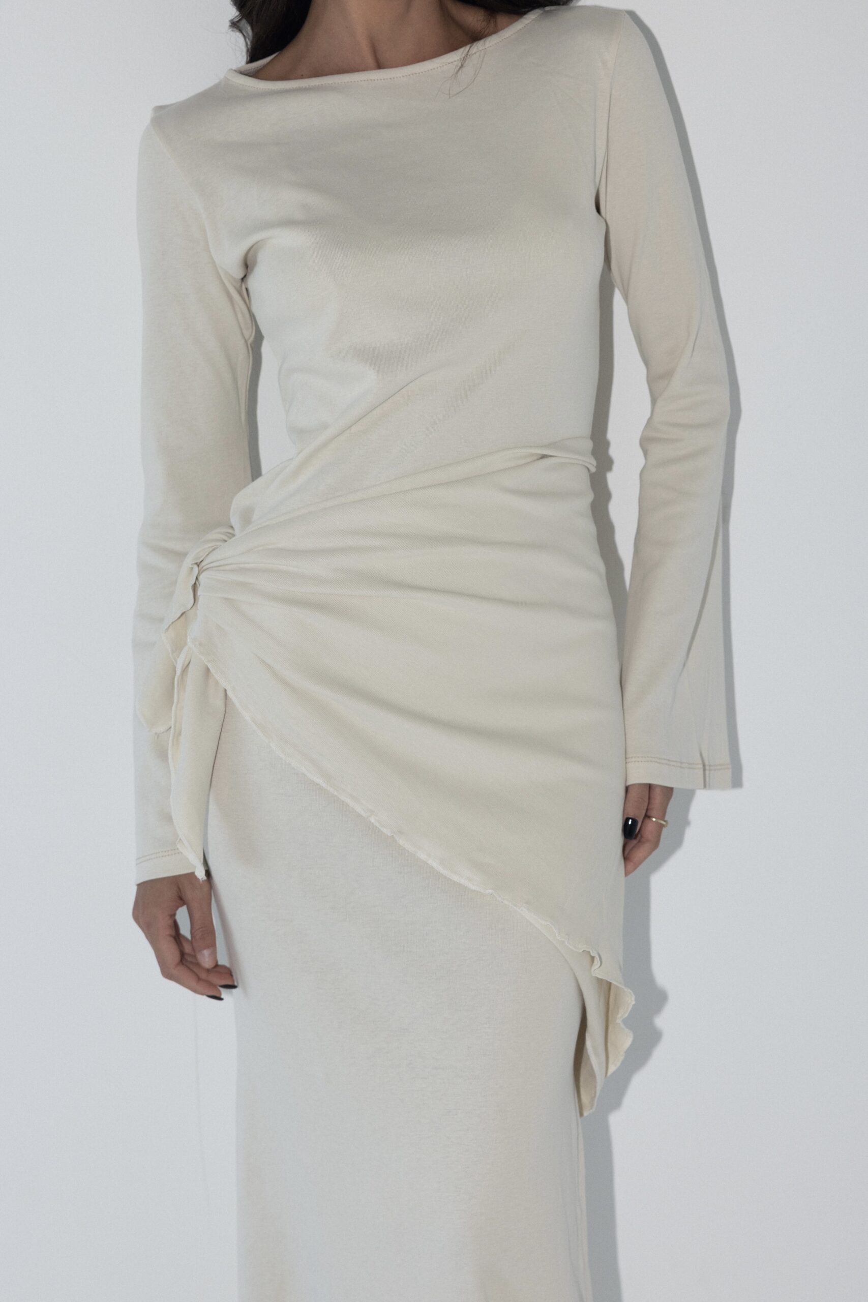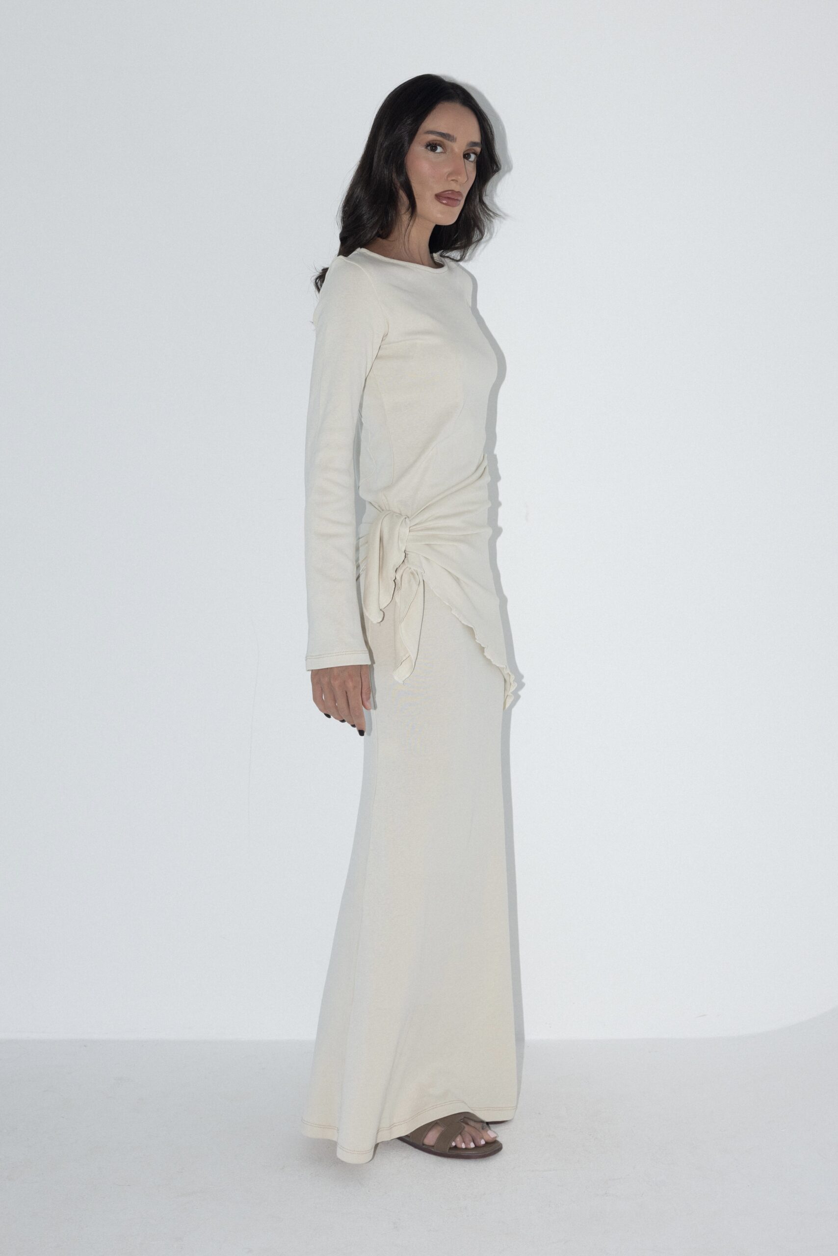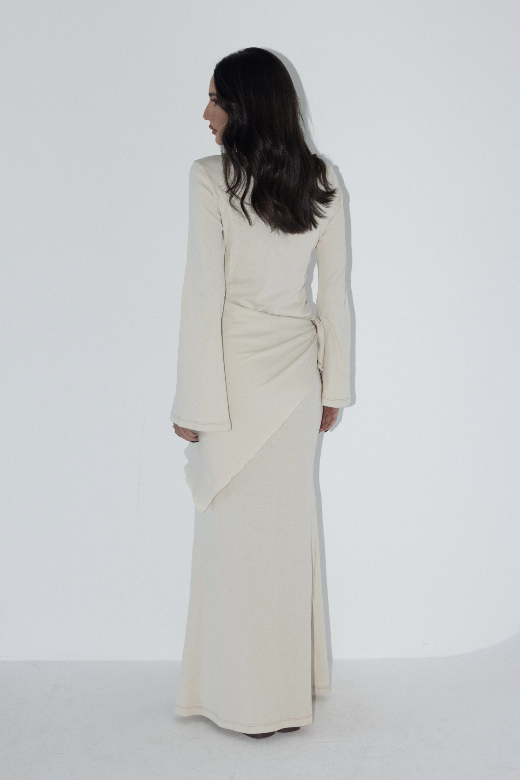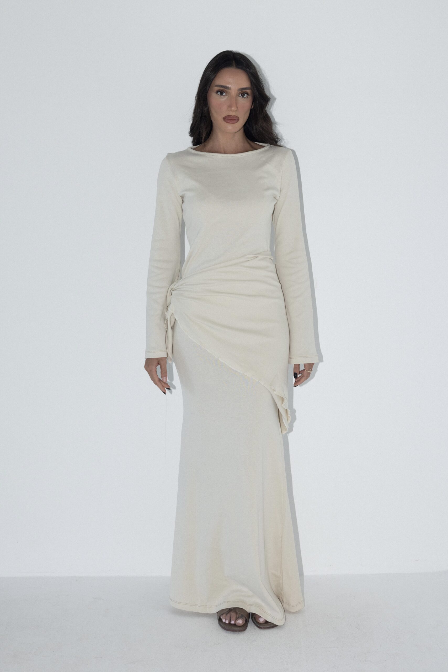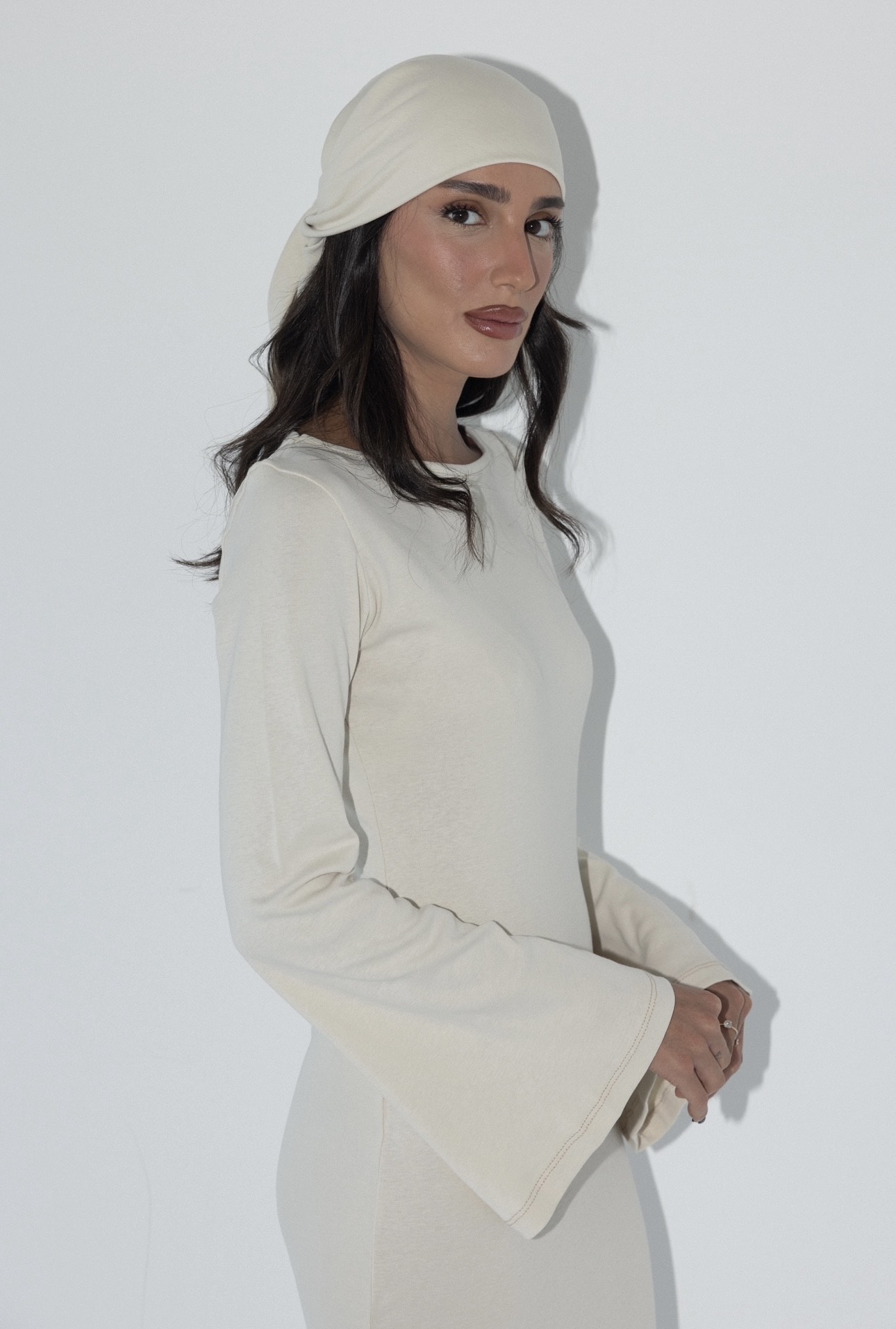 שמלת מקסי בצבע קרם עם כיסוי ראש תואם גזרה צמודה ומחמיאה, שרוולים מתרחבים בטוויסט אלגנטי, וכיסוי ראש בגוון תואם להשלמת הלוק. מידת הבגד על הדוגמנית 0.